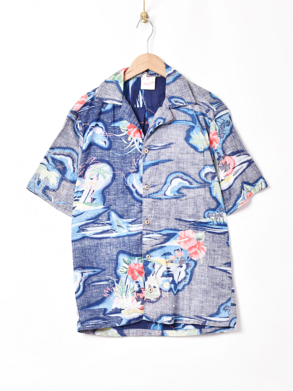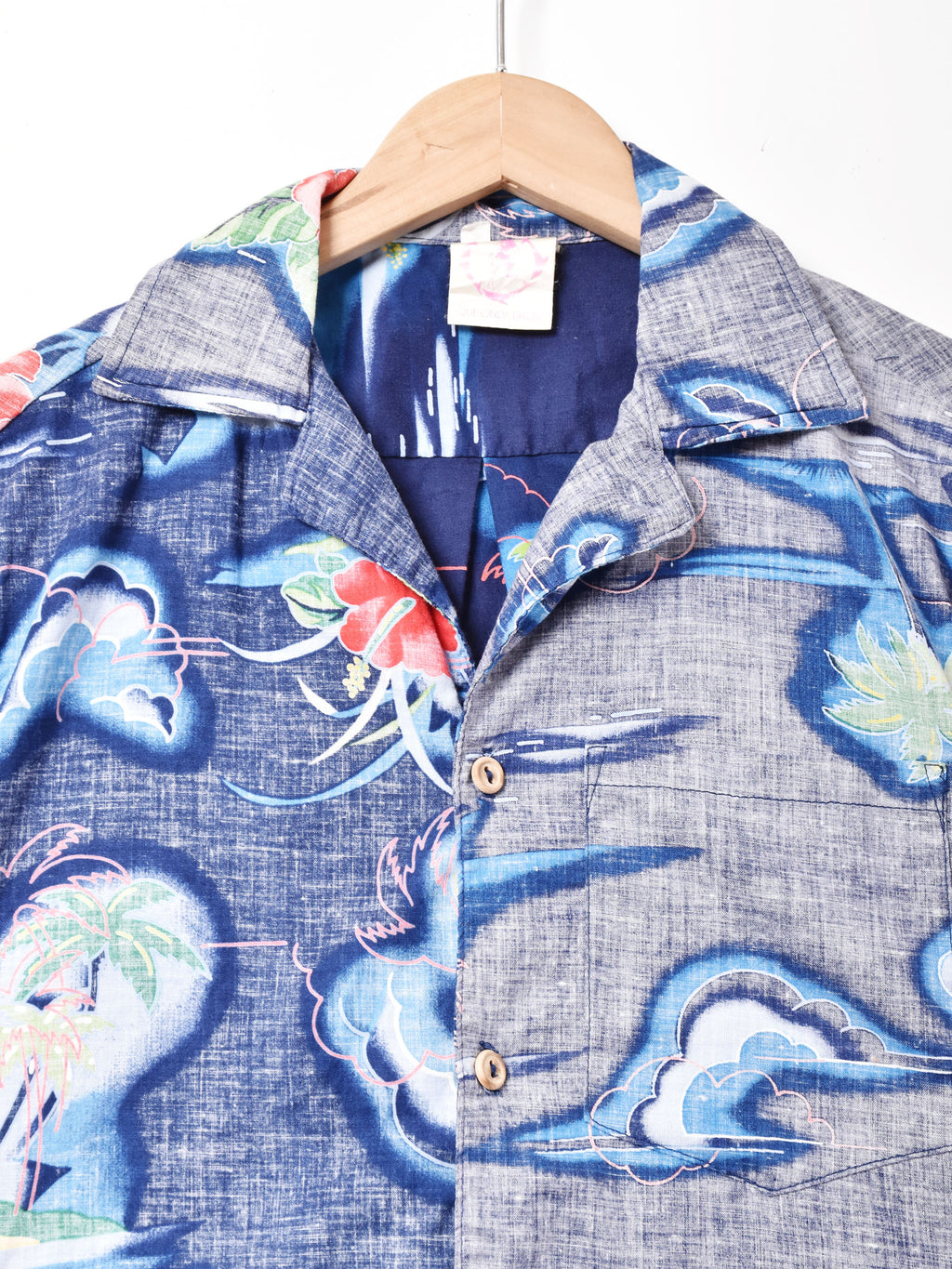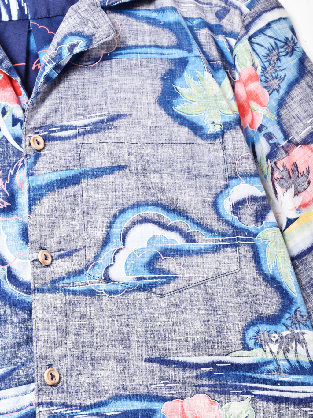 ぼんやりと柄が浮かび上がる裏返しデザインが洒落ているアロハシャツ。ユニークなデザインがお好みの方にオススメの一点。おそらくコットン素材のさっぱりとした生地感です。