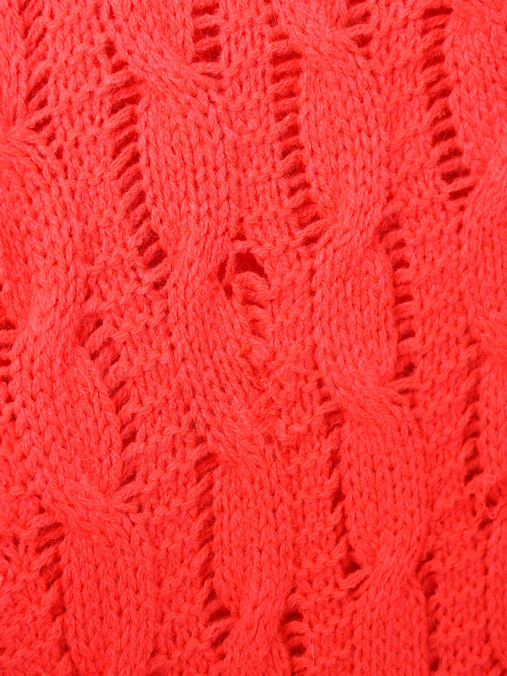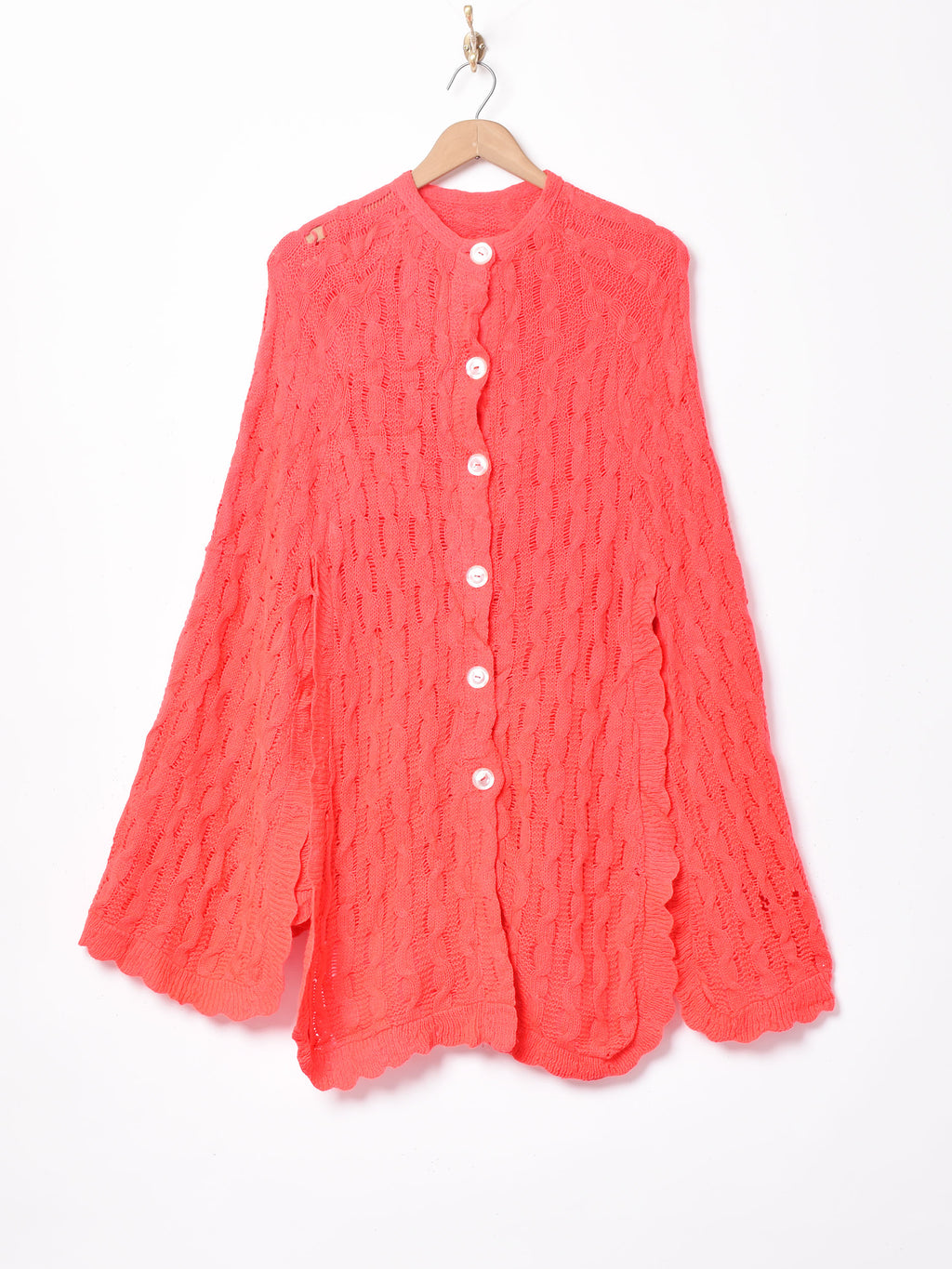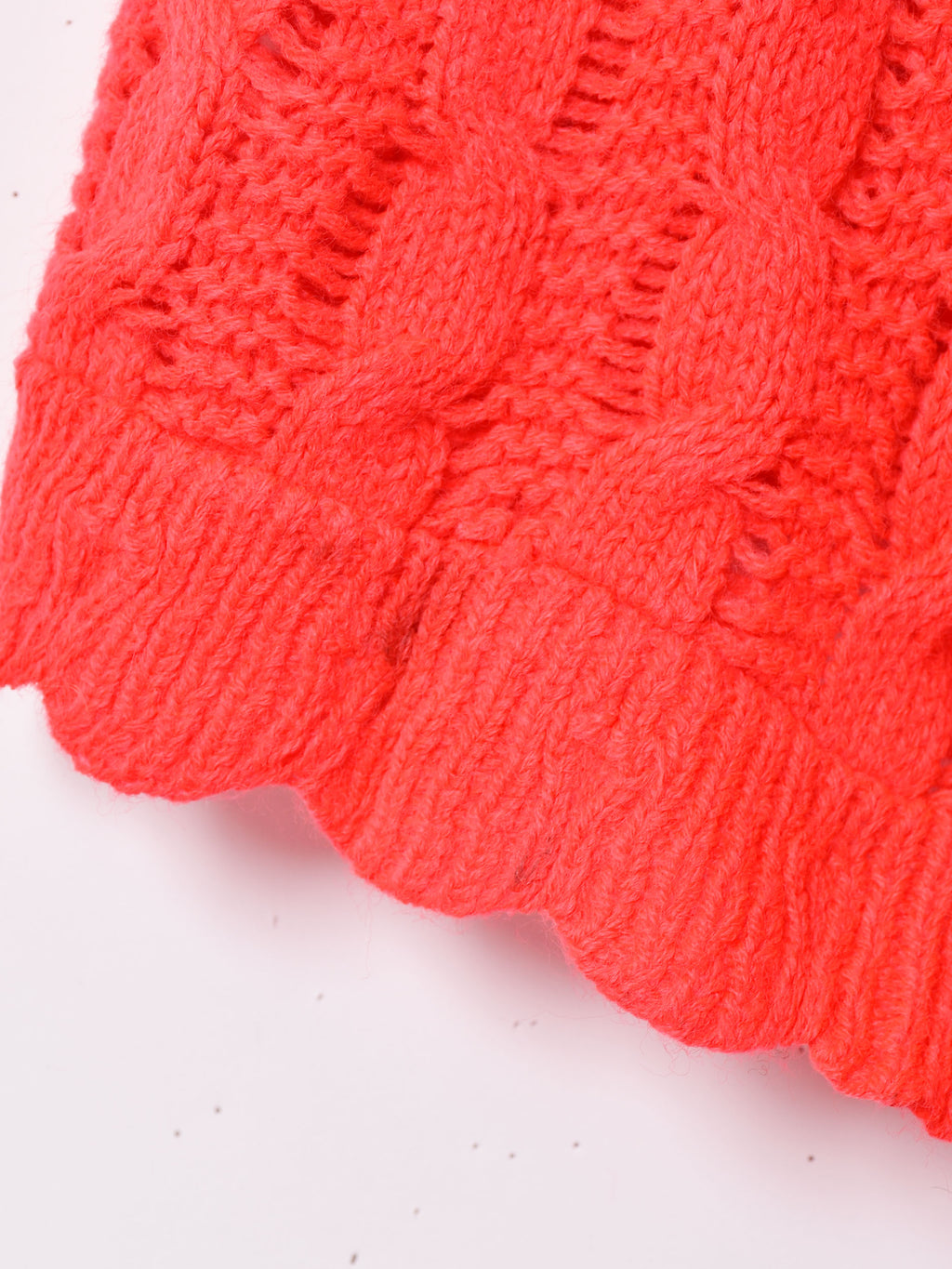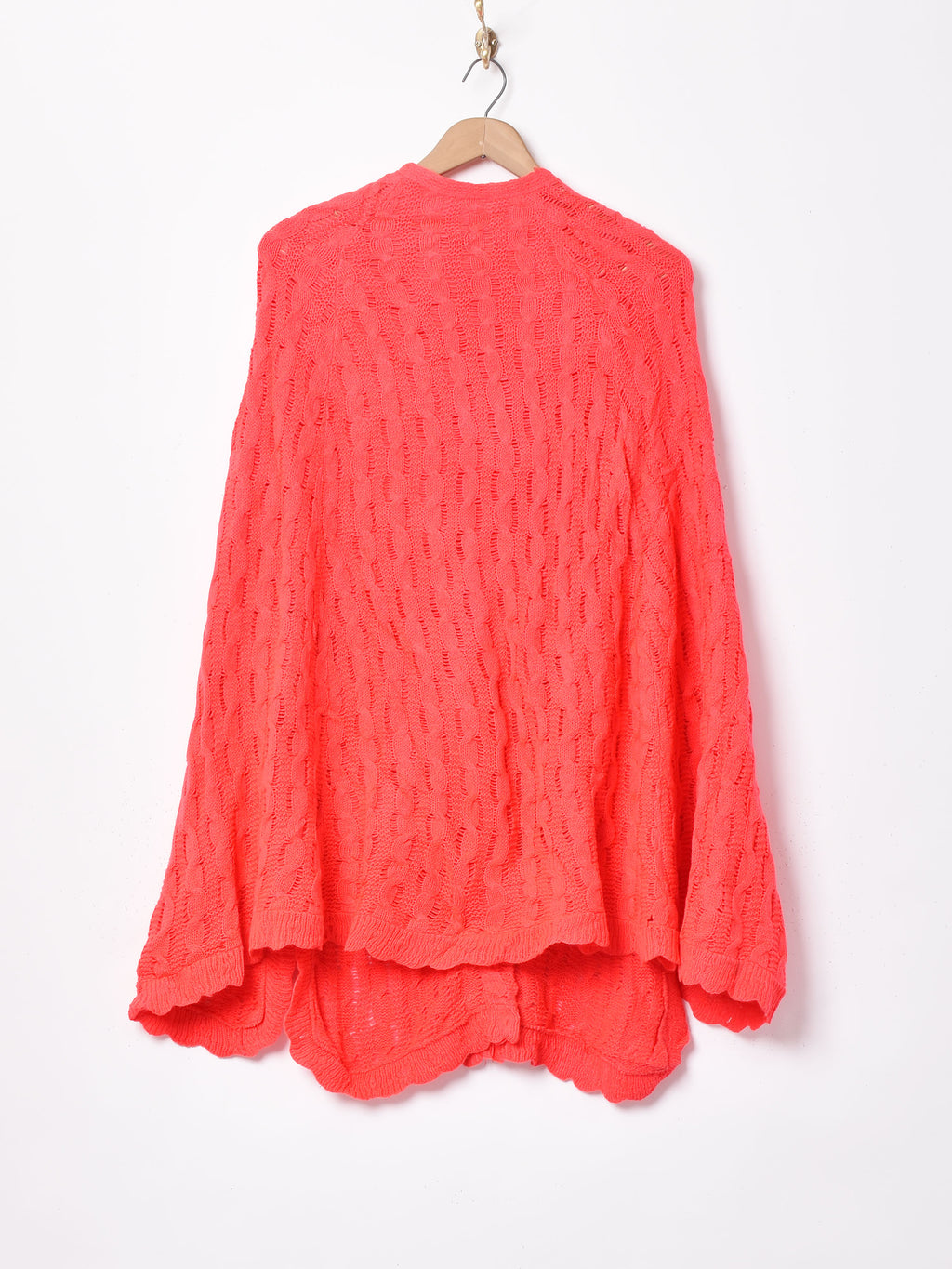 ビビットな色合いが、コーディネートの主役になるニットポンチョ。おそらくアクリル素材の軽い生地感で、長いシーズン着られる一着です。