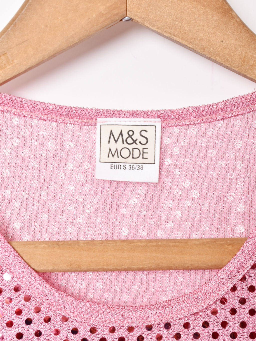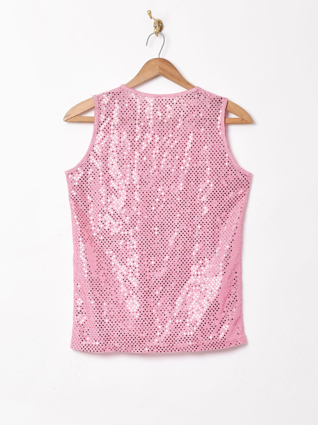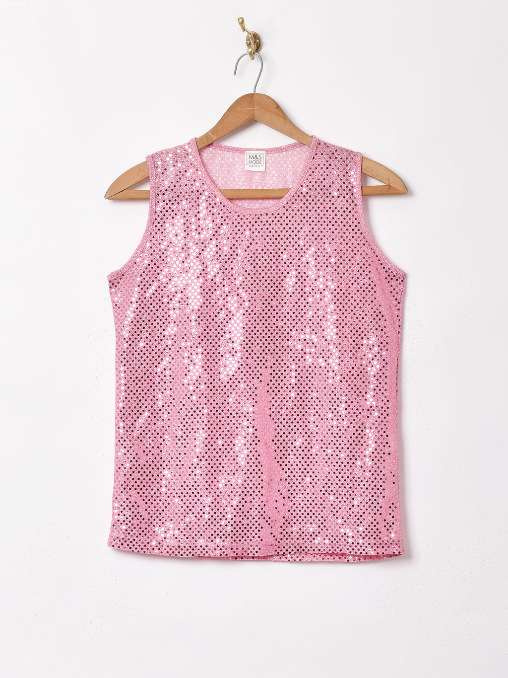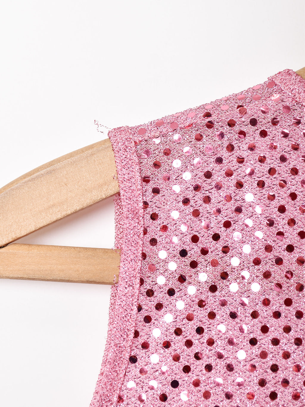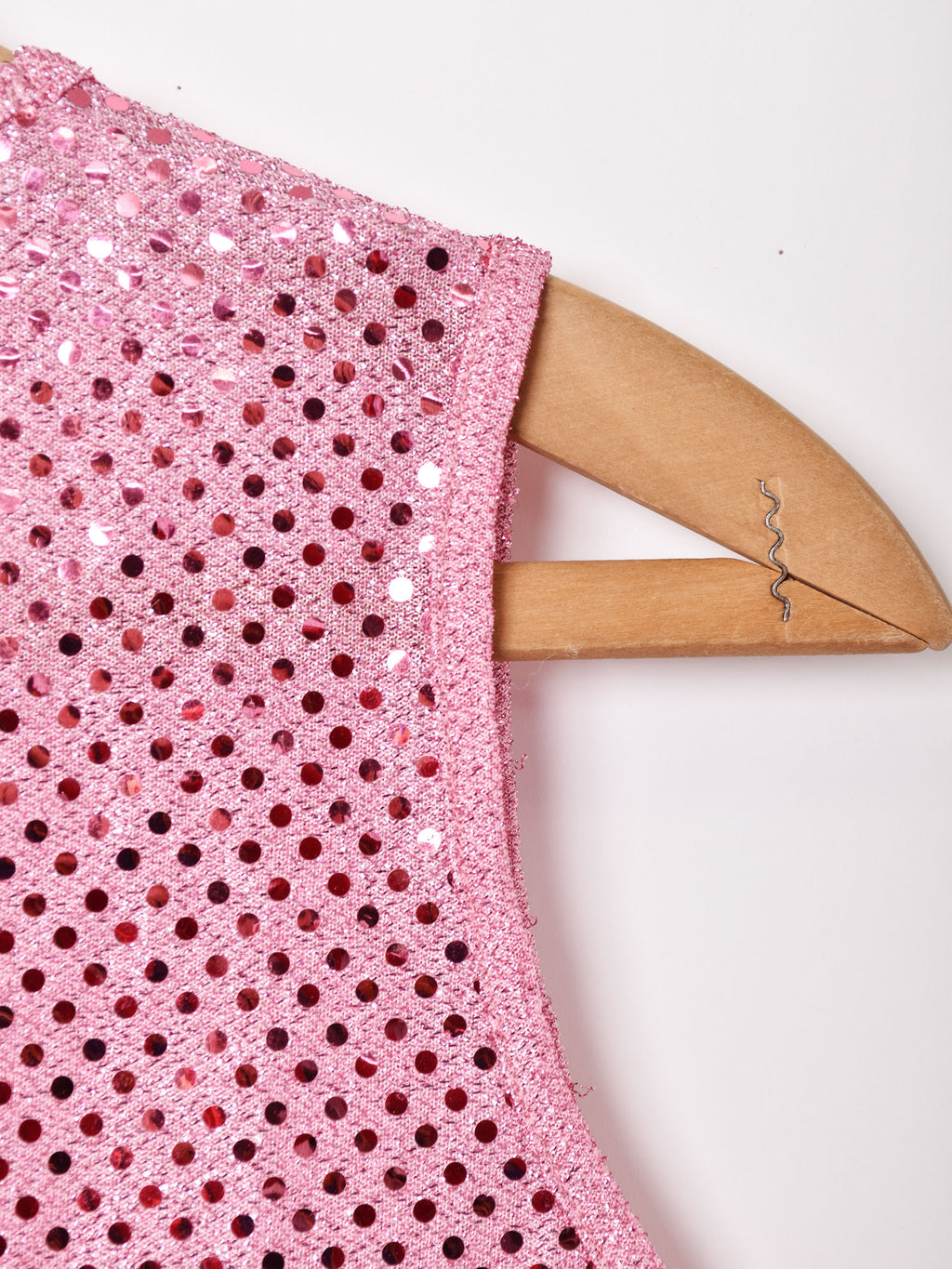 キラリと光るドット柄が存在感抜群のスリーブレストップス。薄手の生地がインナーとして大活躍の予感。ピンクのラメ糸が織り込まれたキュートな一着です。