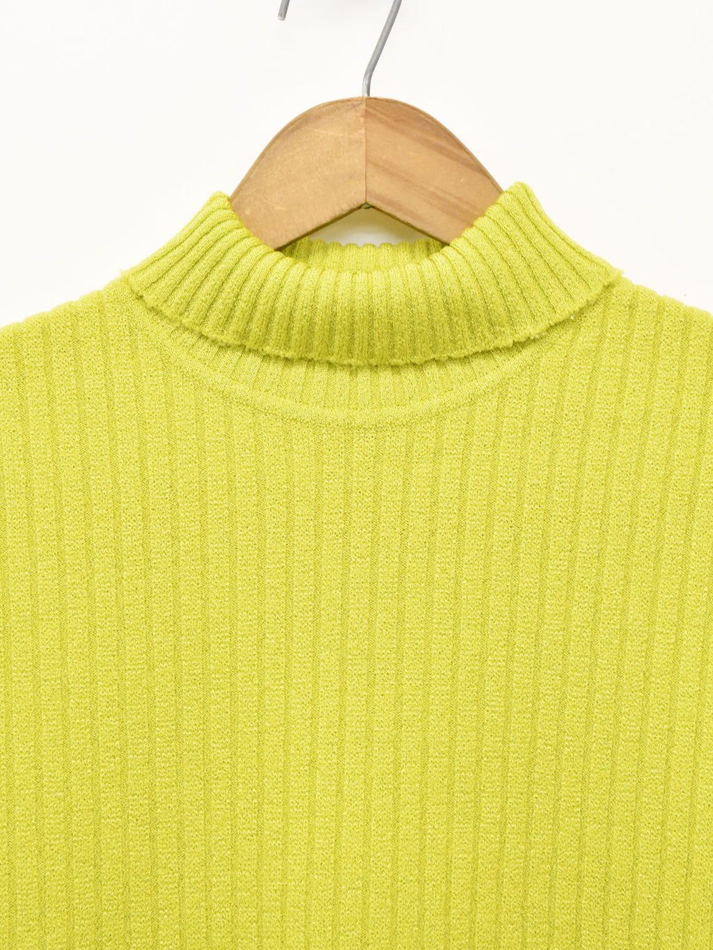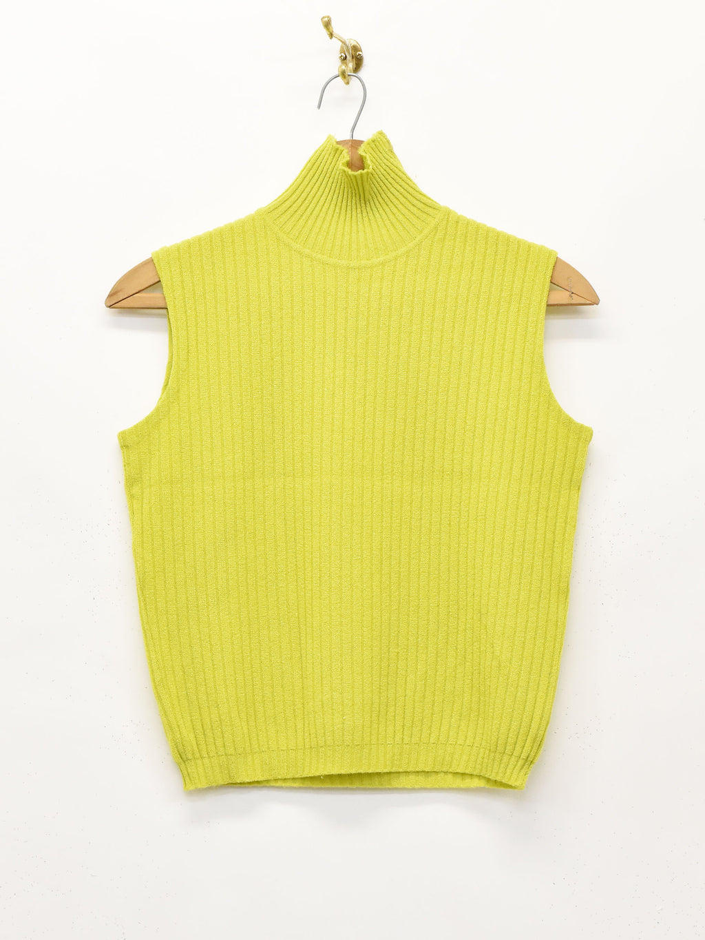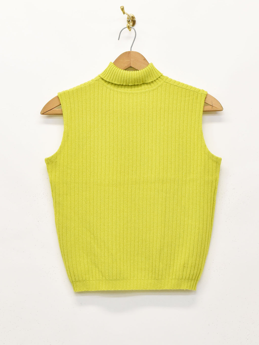 ノースリーブとタートルネックのアンバランス感が魅力の一着。美しいライムグリーンがコーディネートのアクセントにぴったり。伸縮性のあるさっぱりとした生地です。