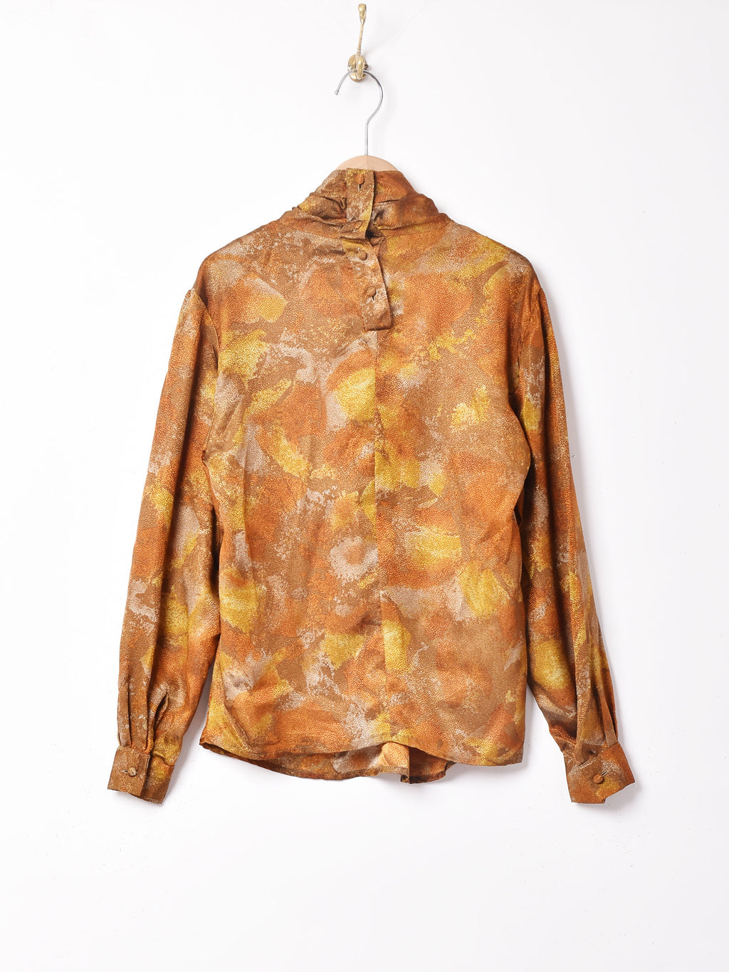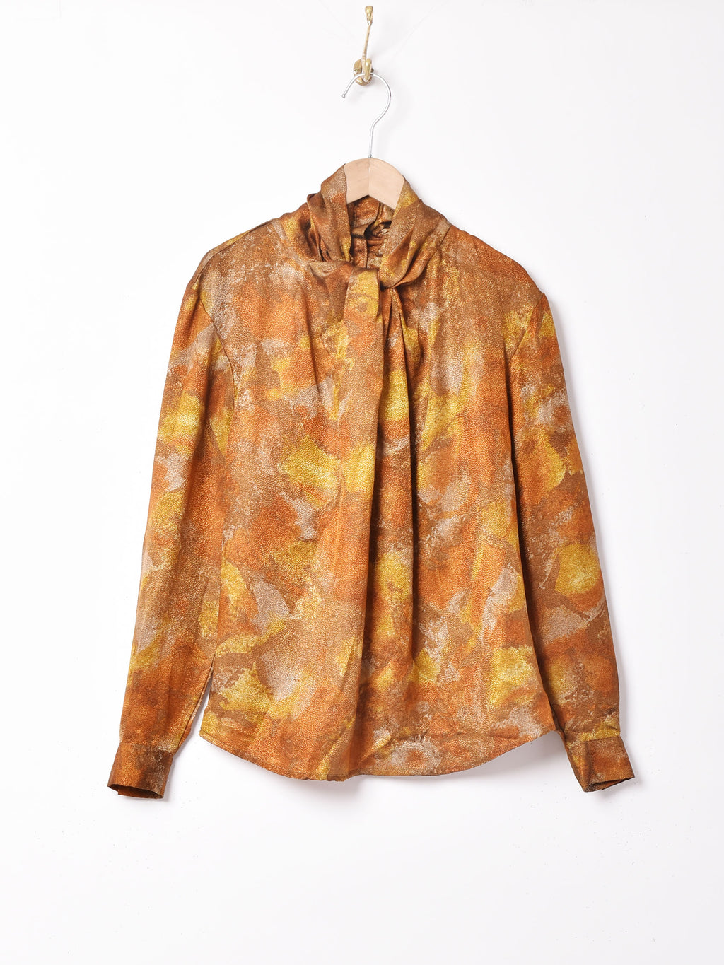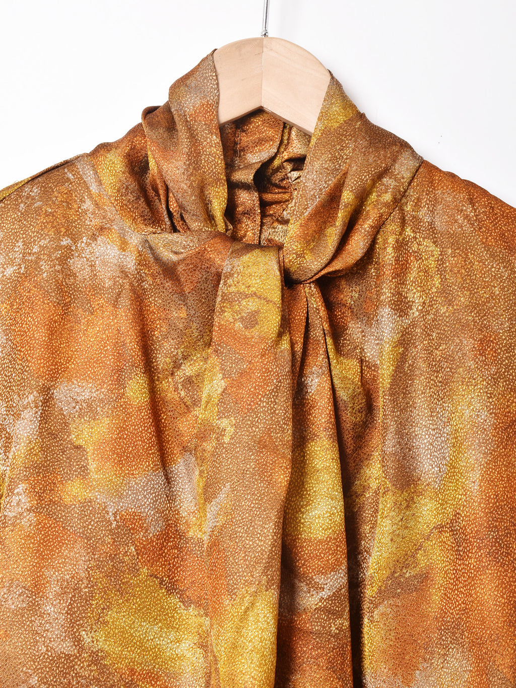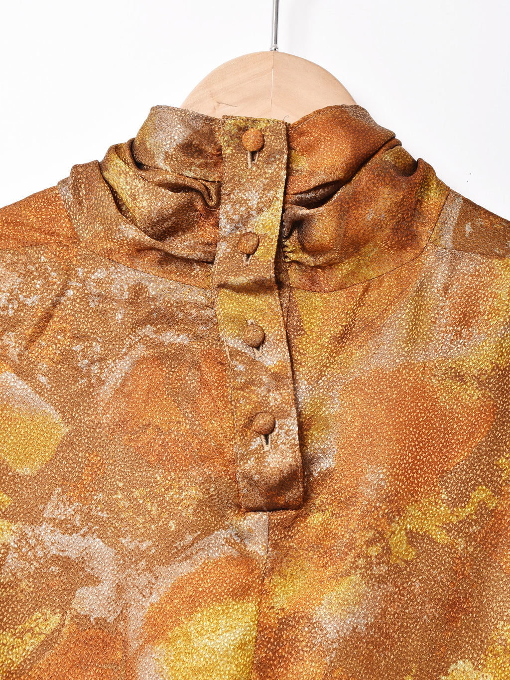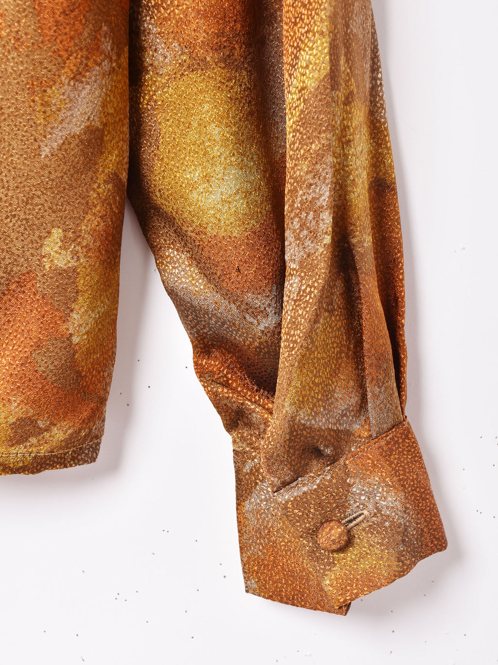 光沢のある生地感がゴージャスで高貴な印象の長袖トップス。おそらくポリエステル生地で、軽やかで薄手な生地感です。