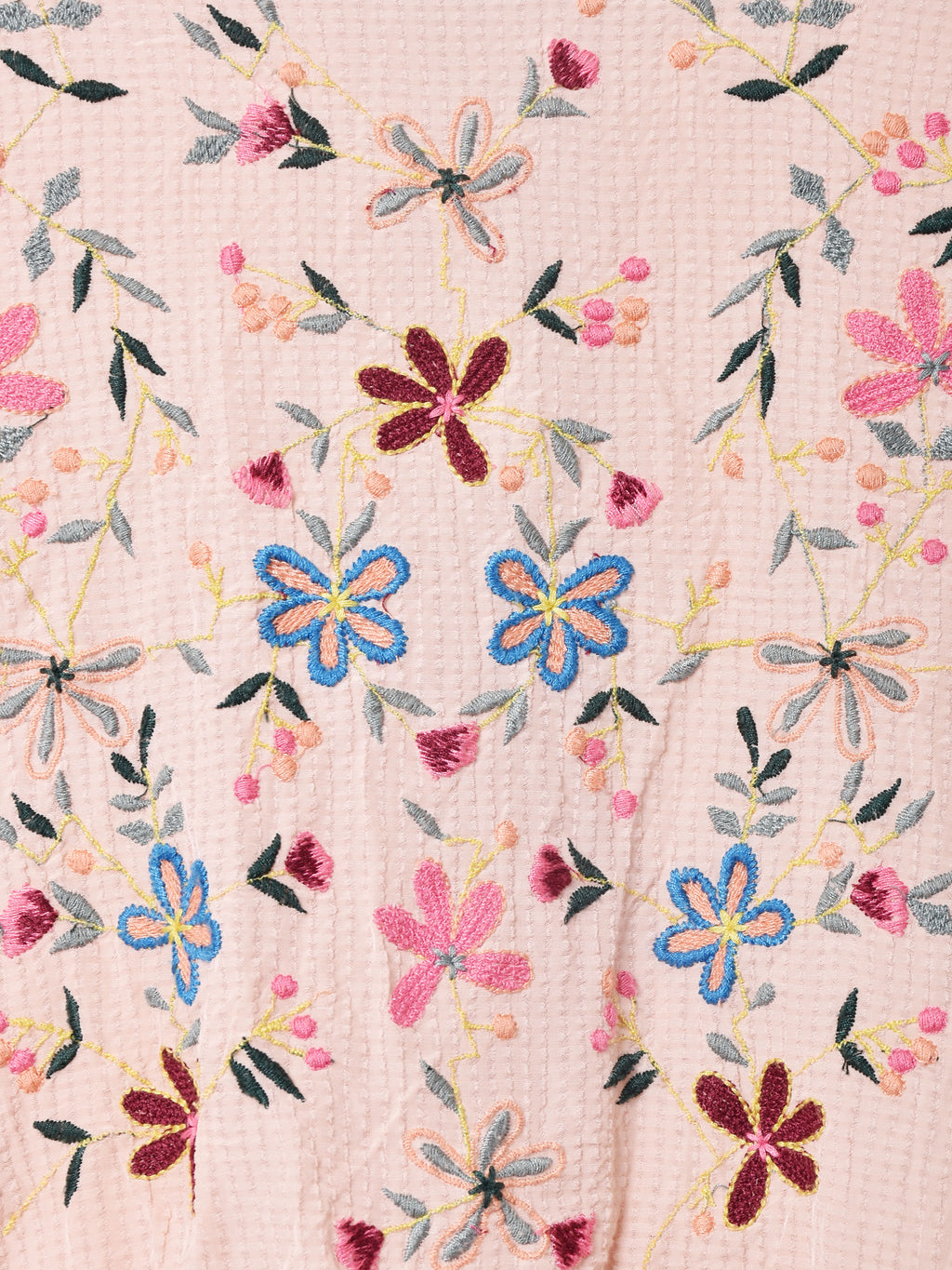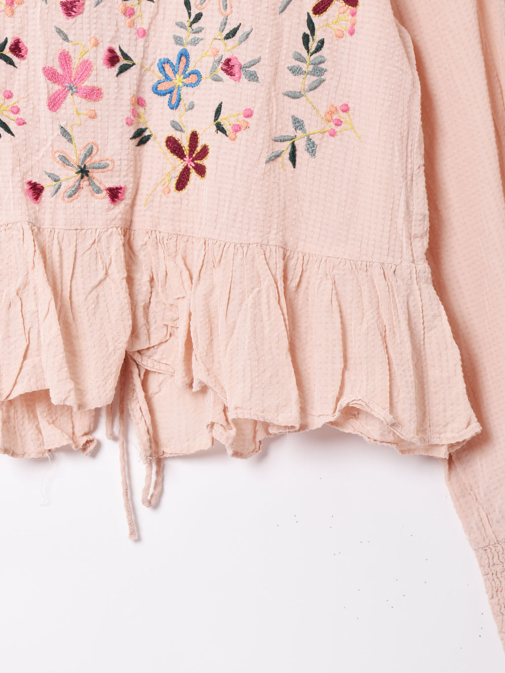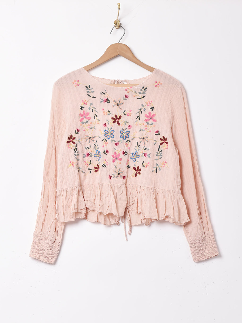 フロントの刺繍が華やかでバックスタイルも気を抜かない一枚。やや透け感のある薄手生地です。