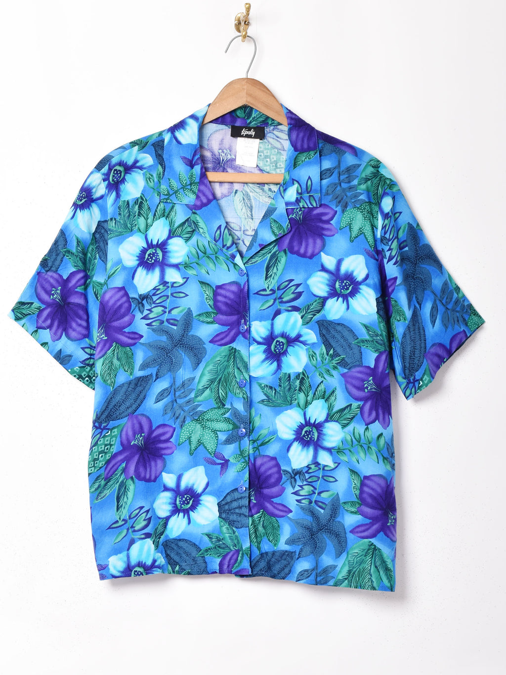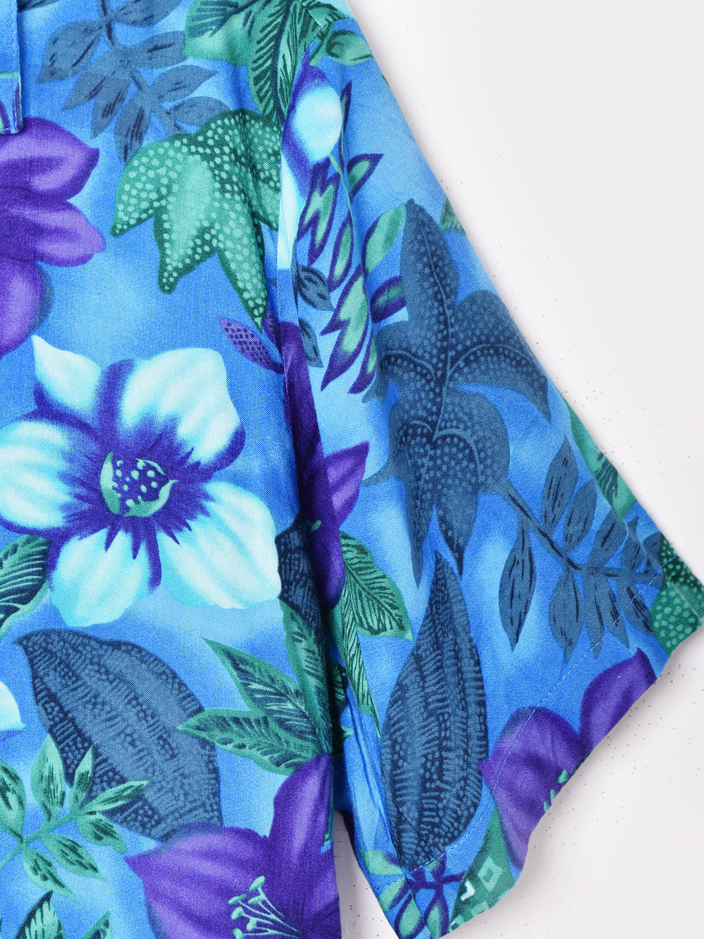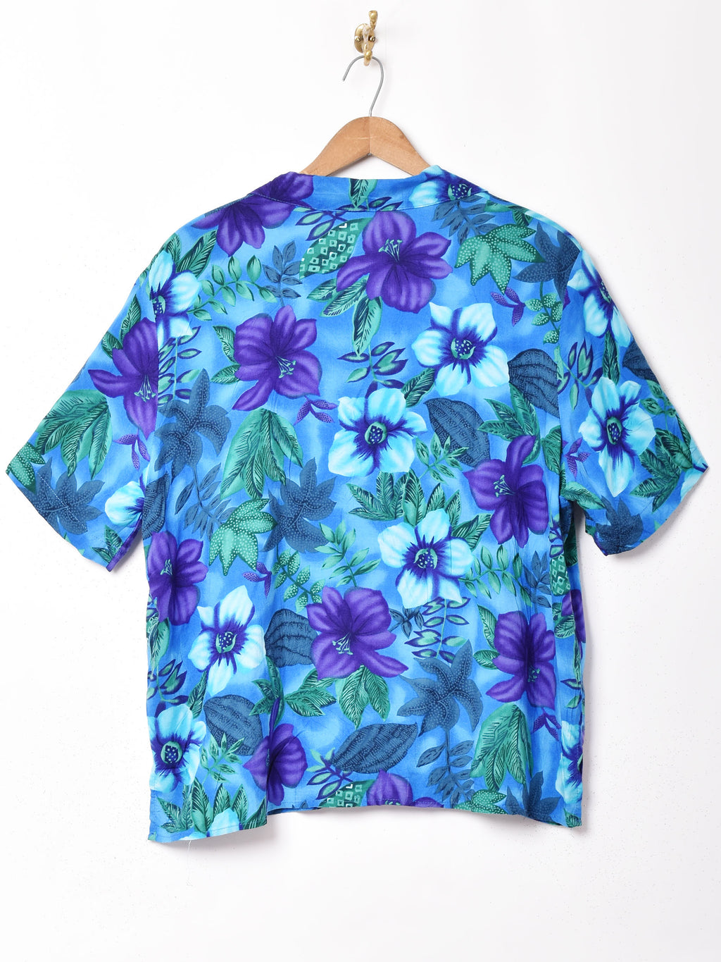 毒気のある花柄がムードを高める半袖開襟シャツ。柔らかく、落ち感の出やすいレーヨン生地です。