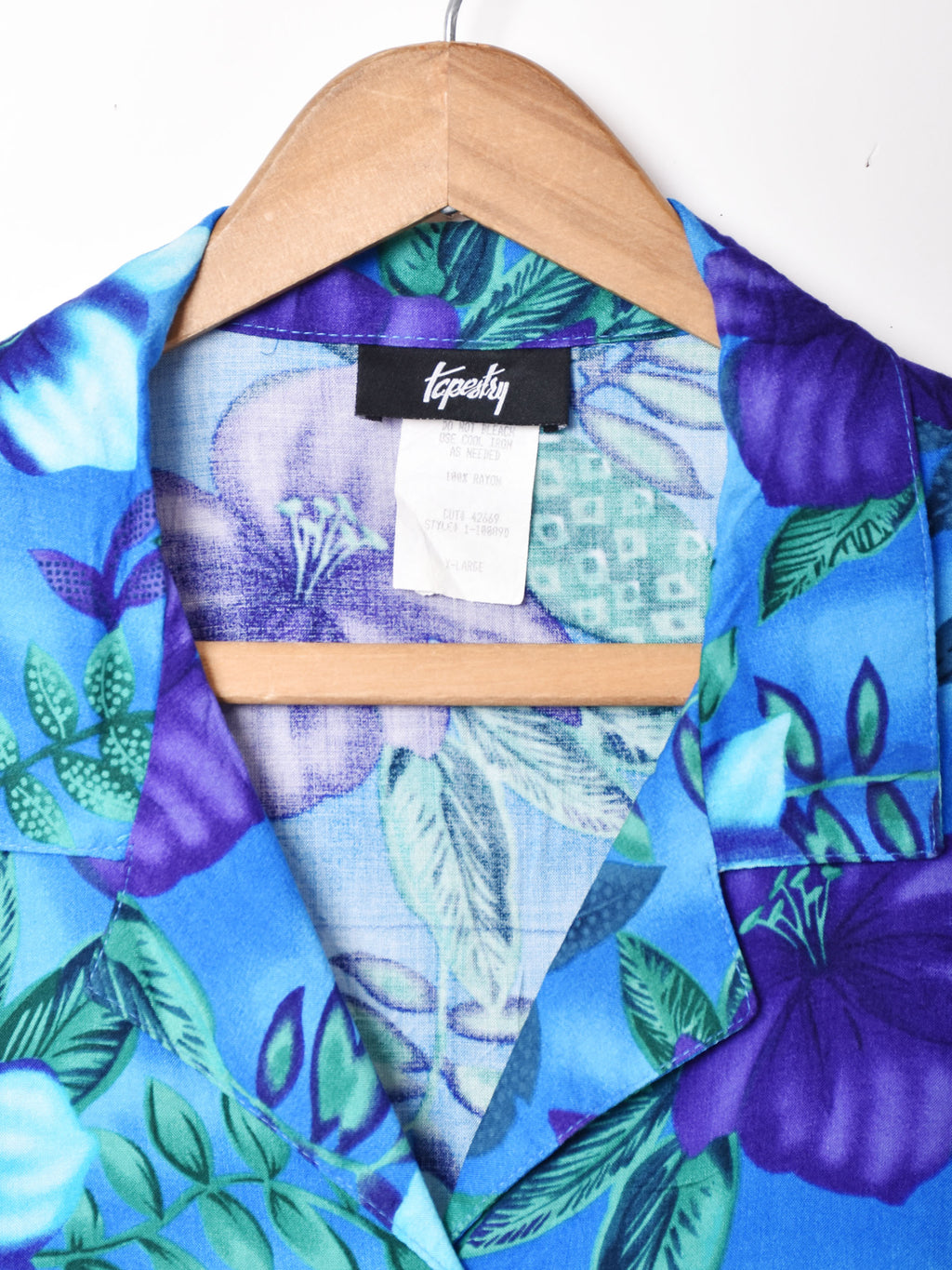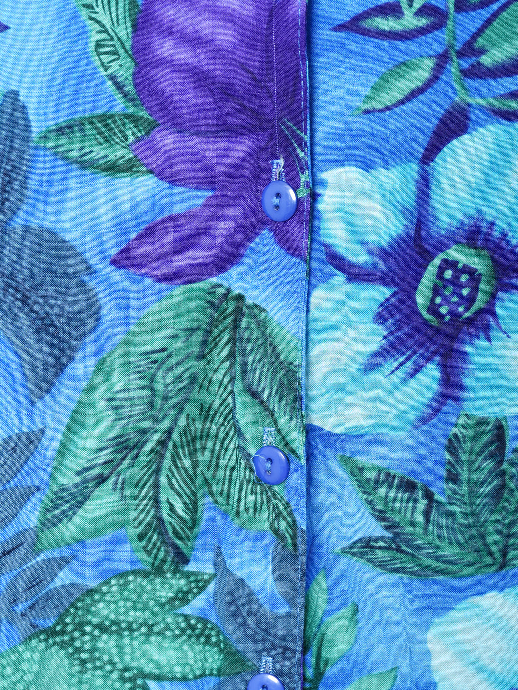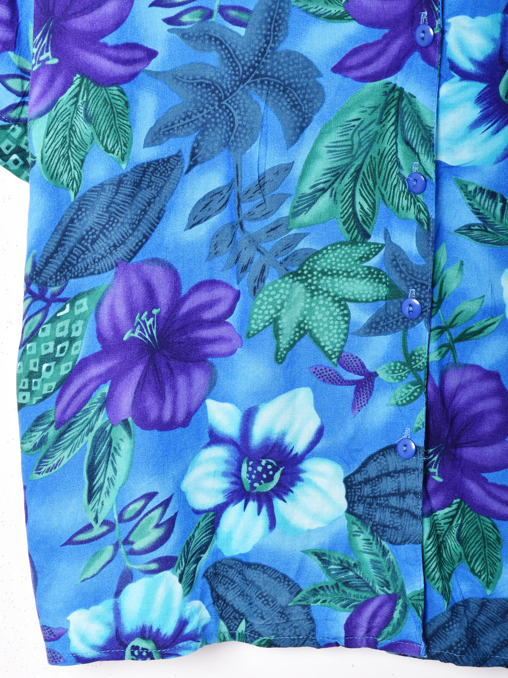 毒気のある花柄がムードを高める半袖開襟シャツ。柔らかく、落ち感の出やすいレーヨン生地です。