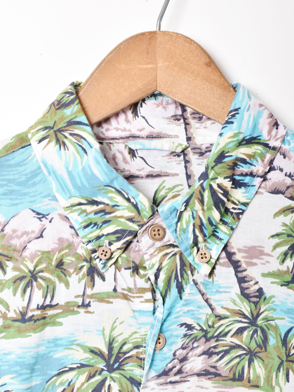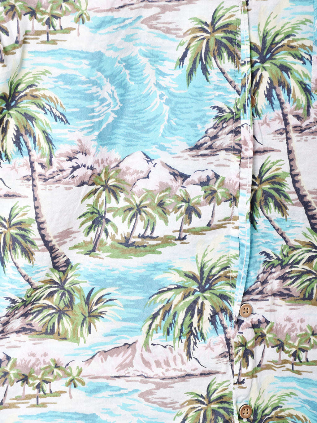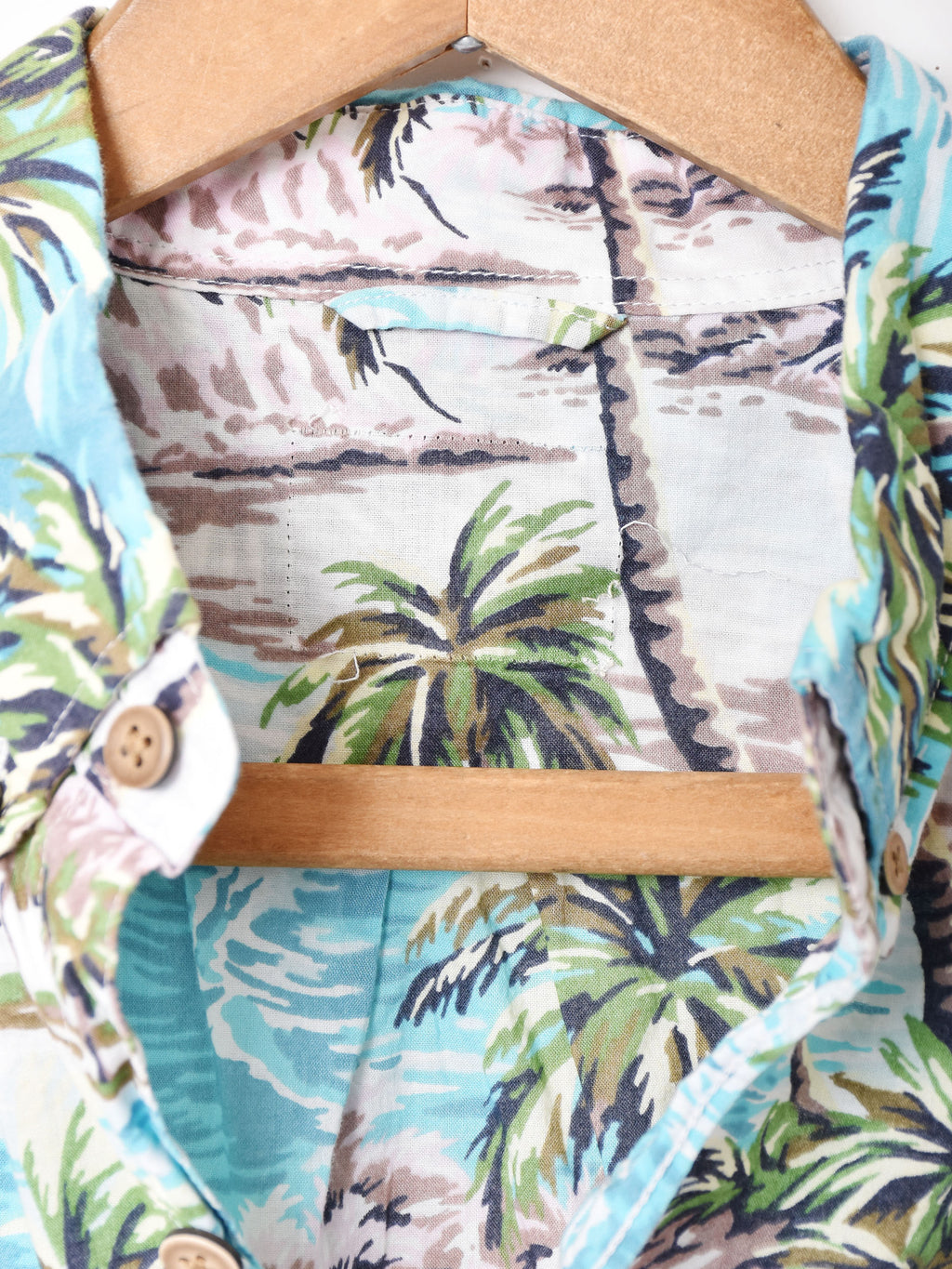 爽やかなヤシの木柄が季節感を演出する総柄シャツ。おそらくコットン素材で、薄手ながらもしっかりとした生地感です。