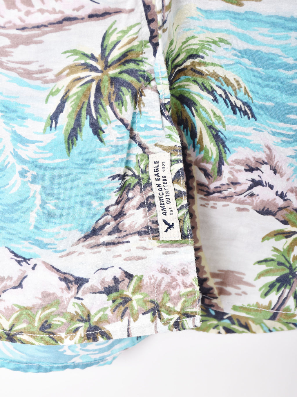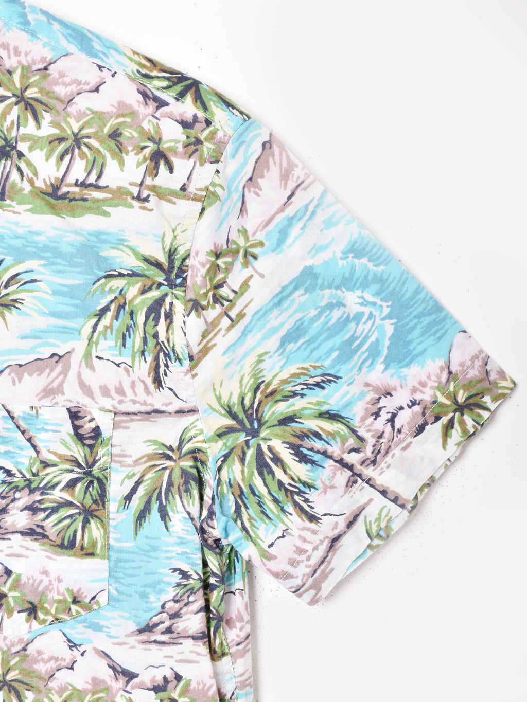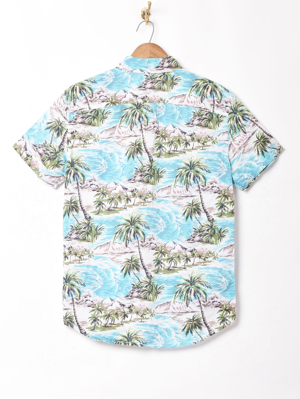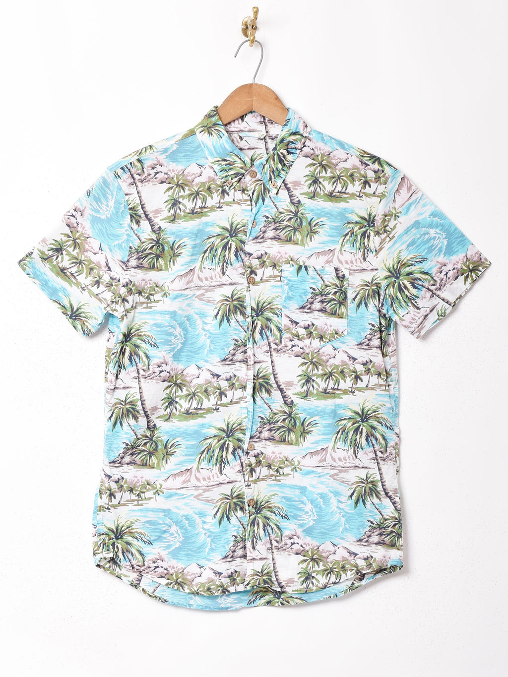 爽やかなヤシの木柄が季節感を演出する総柄シャツ。おそらくコットン素材で、薄手ながらもしっかりとした生地感です。