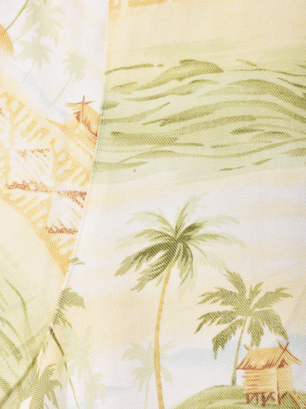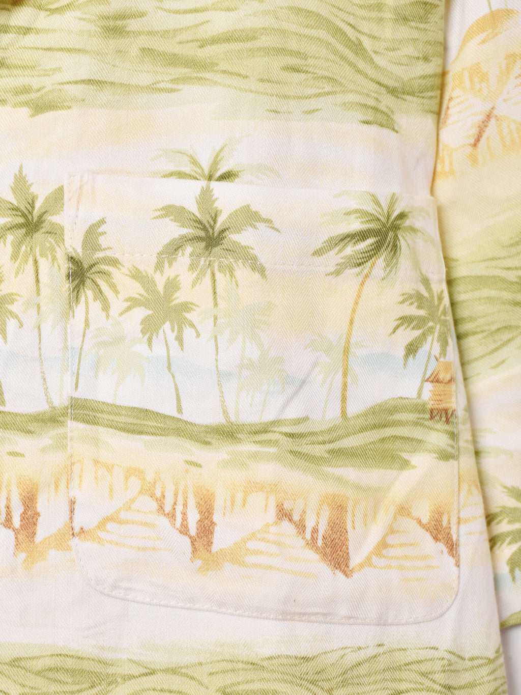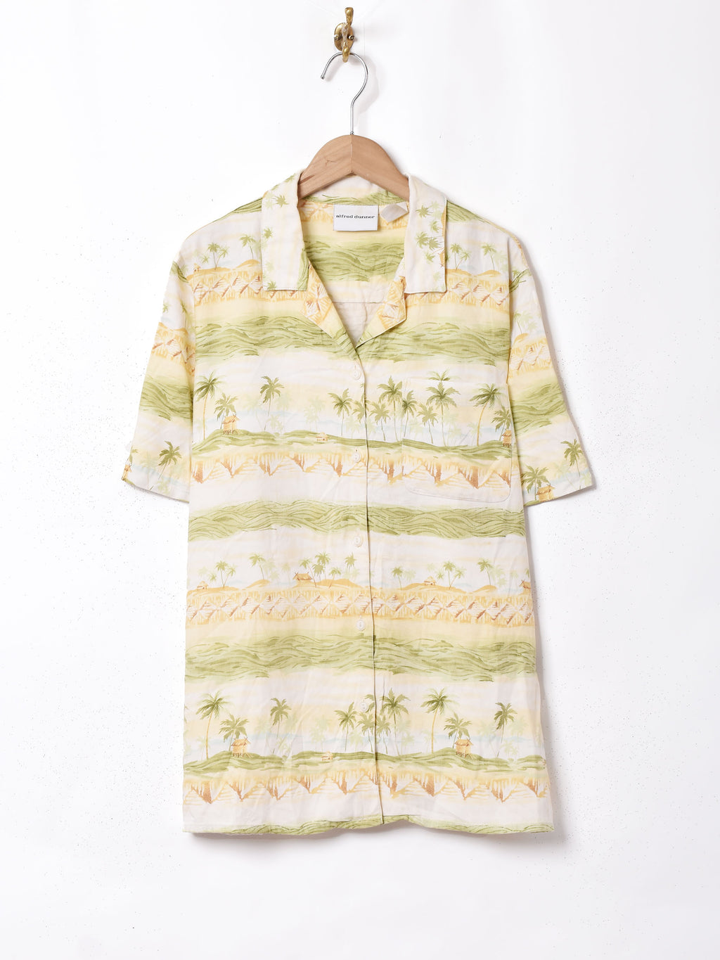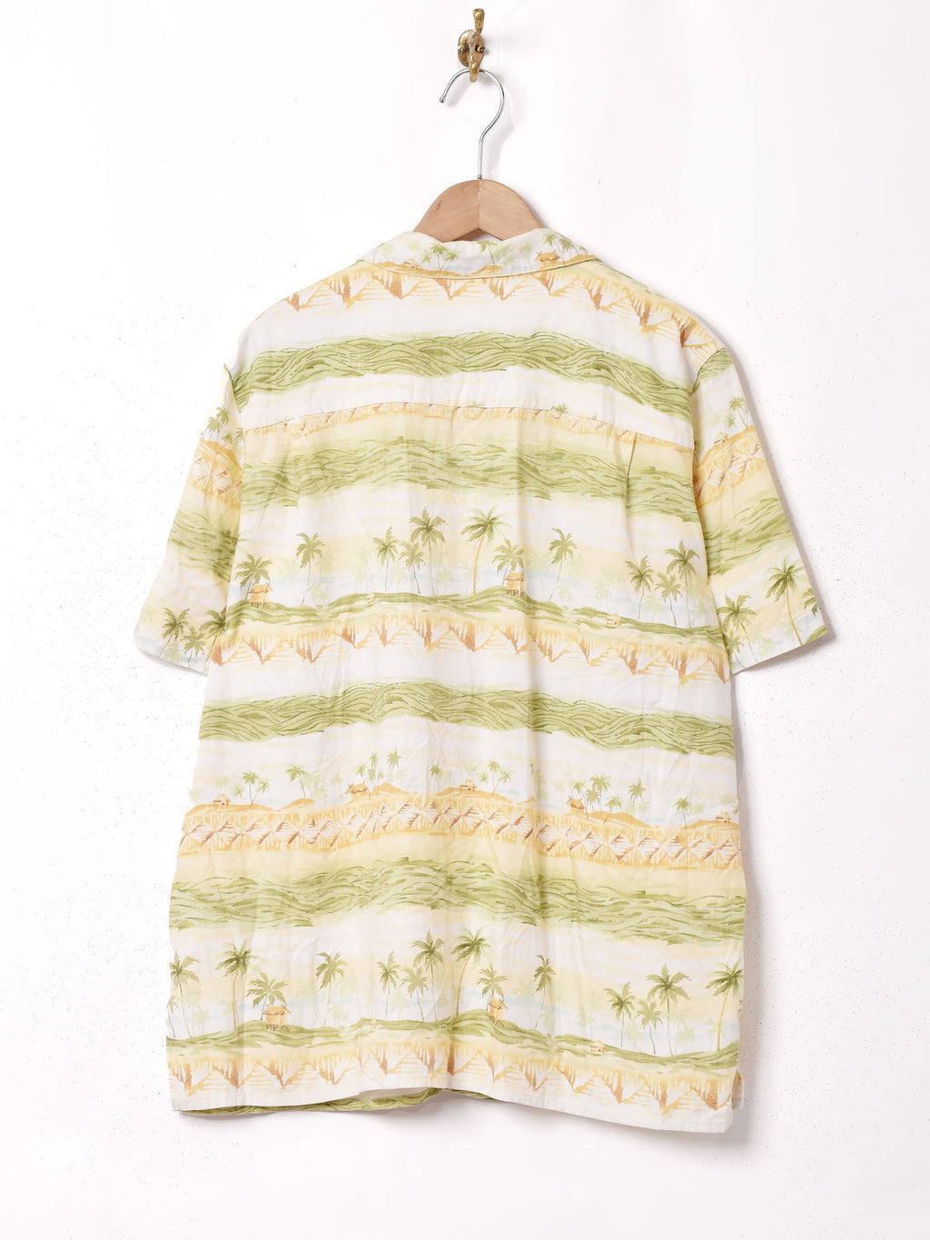 渋めなカラーリングと柄が目珍しいアロハシャツ。厚みのある、柔らかなレーヨン生地です。