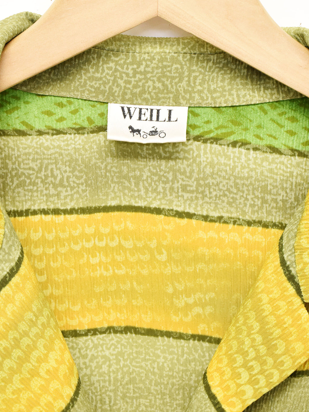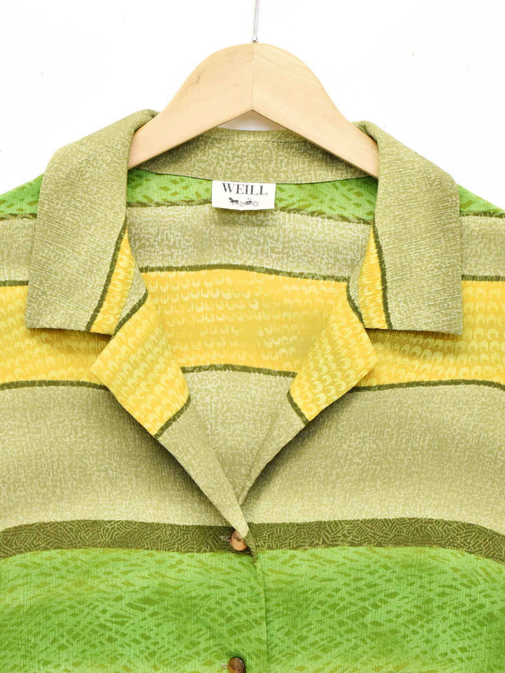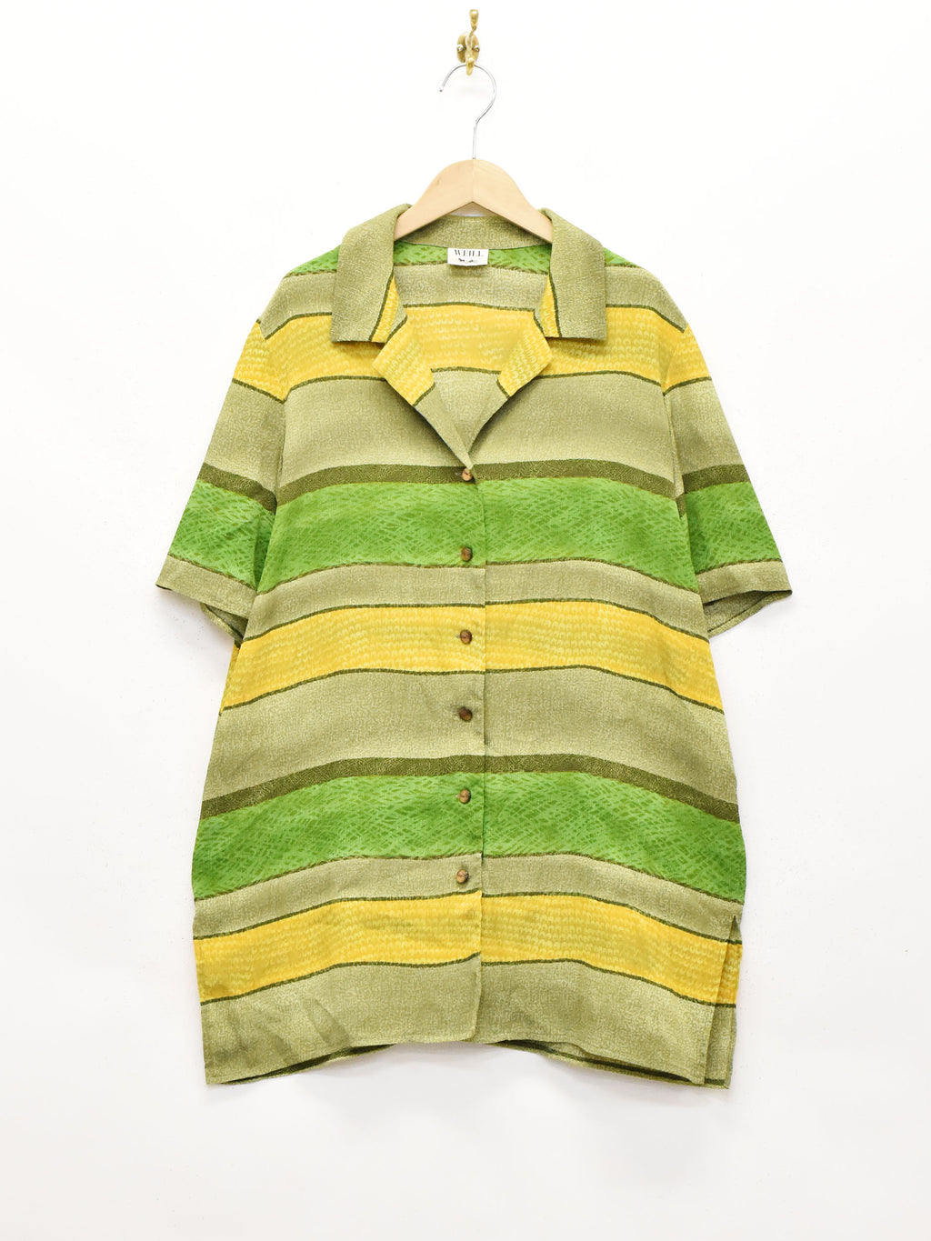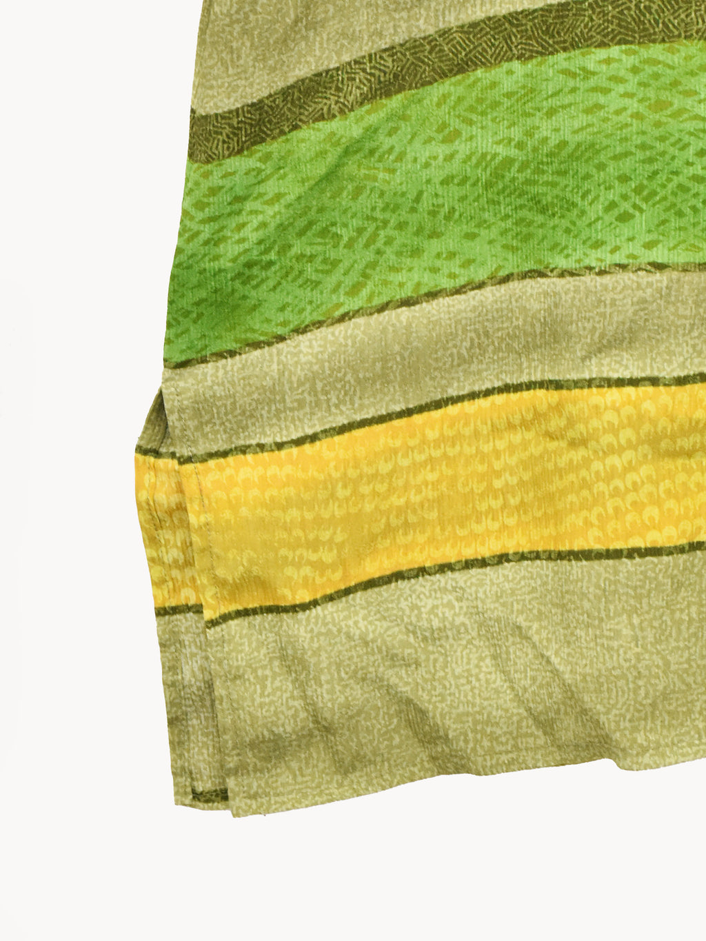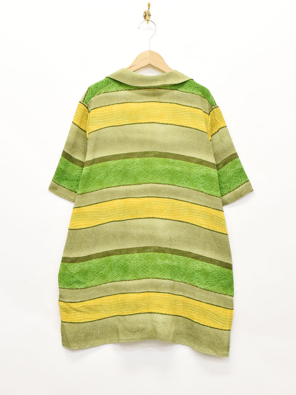 渋めなグリーンがムードを高めてくれる半袖開襟シャツ。おそらくポリエステル生地で、薄く柔らかな生地感です。