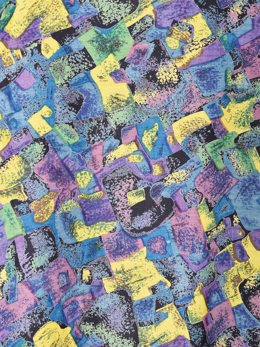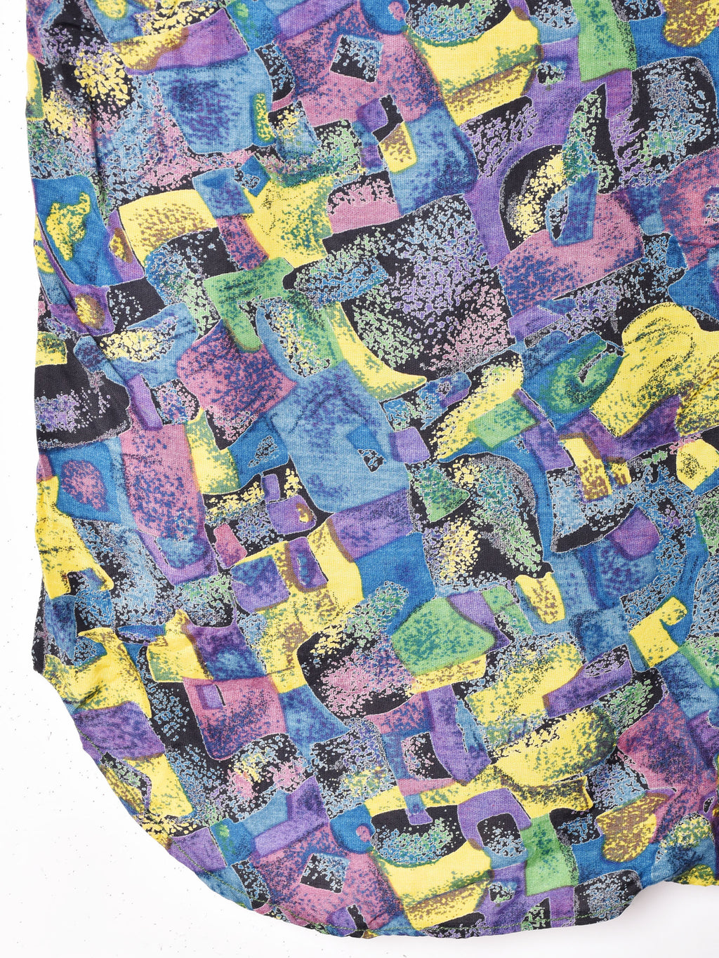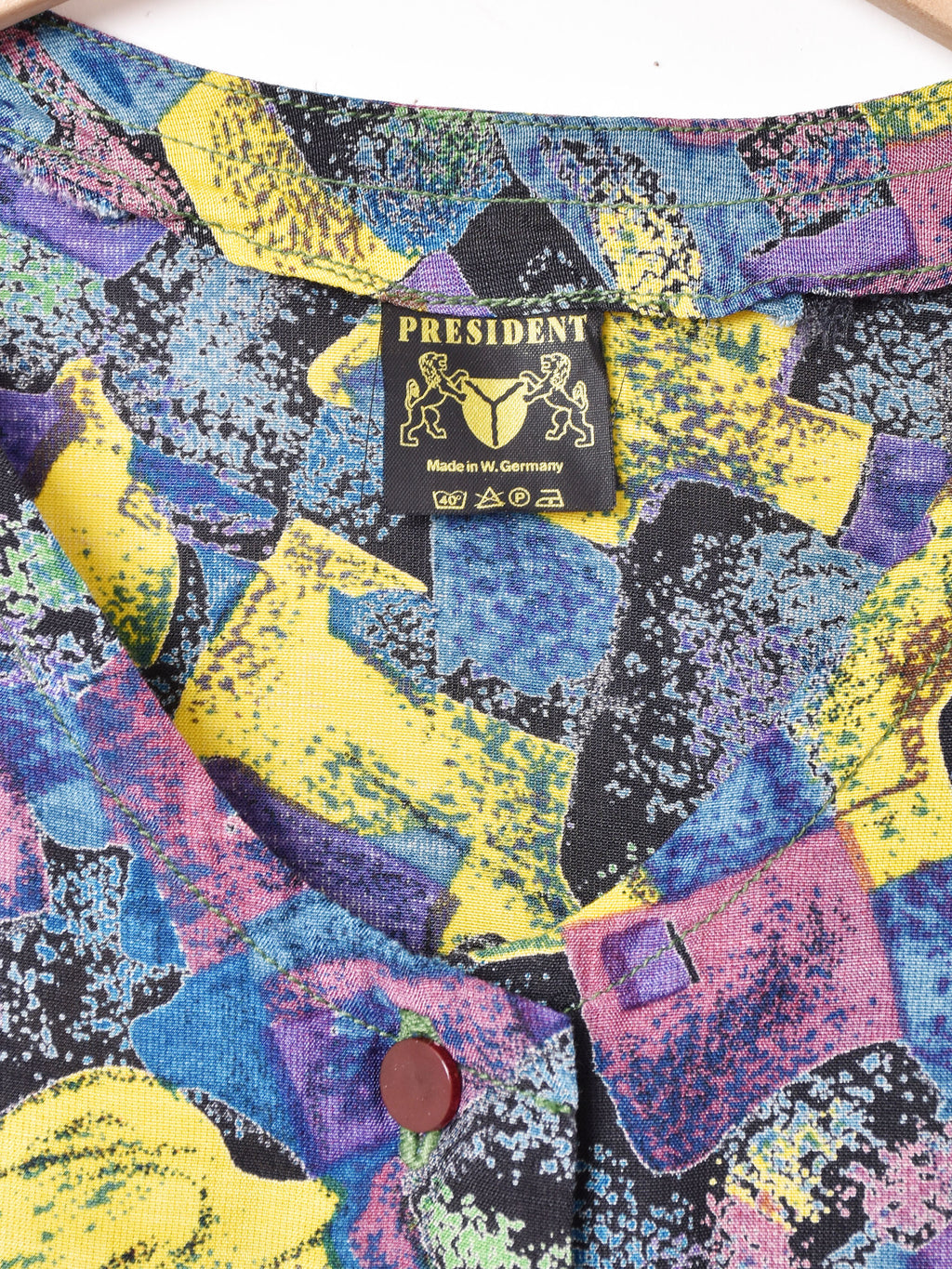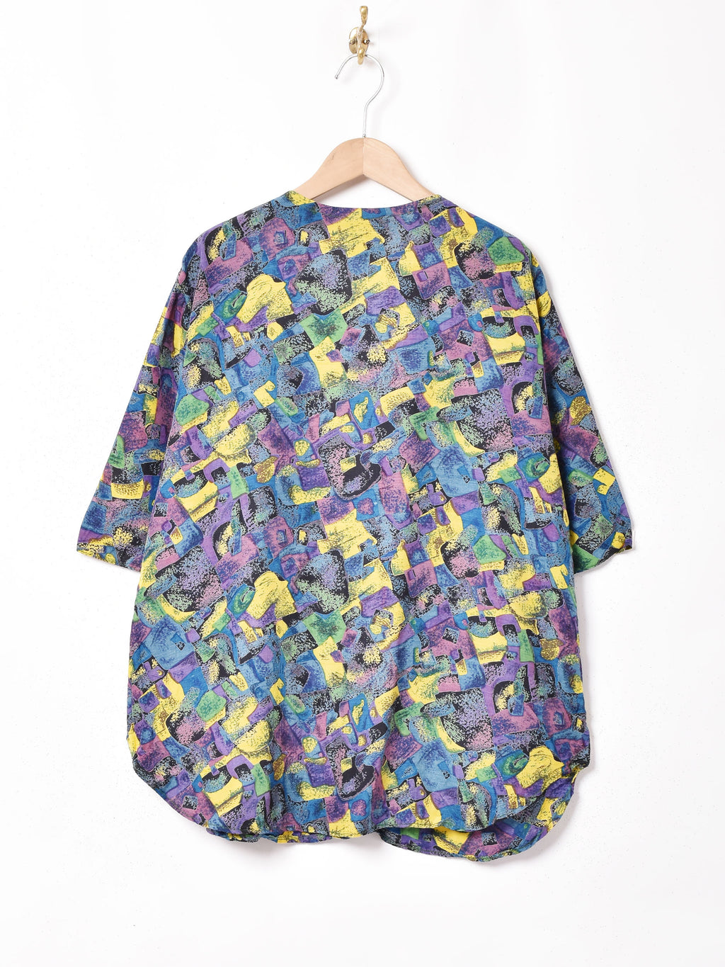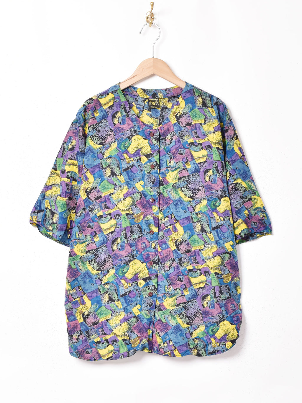 ユニークな柄がムードを高める半袖シャツ。おそらくコットン生地で、薄く爽やかな一着です。
