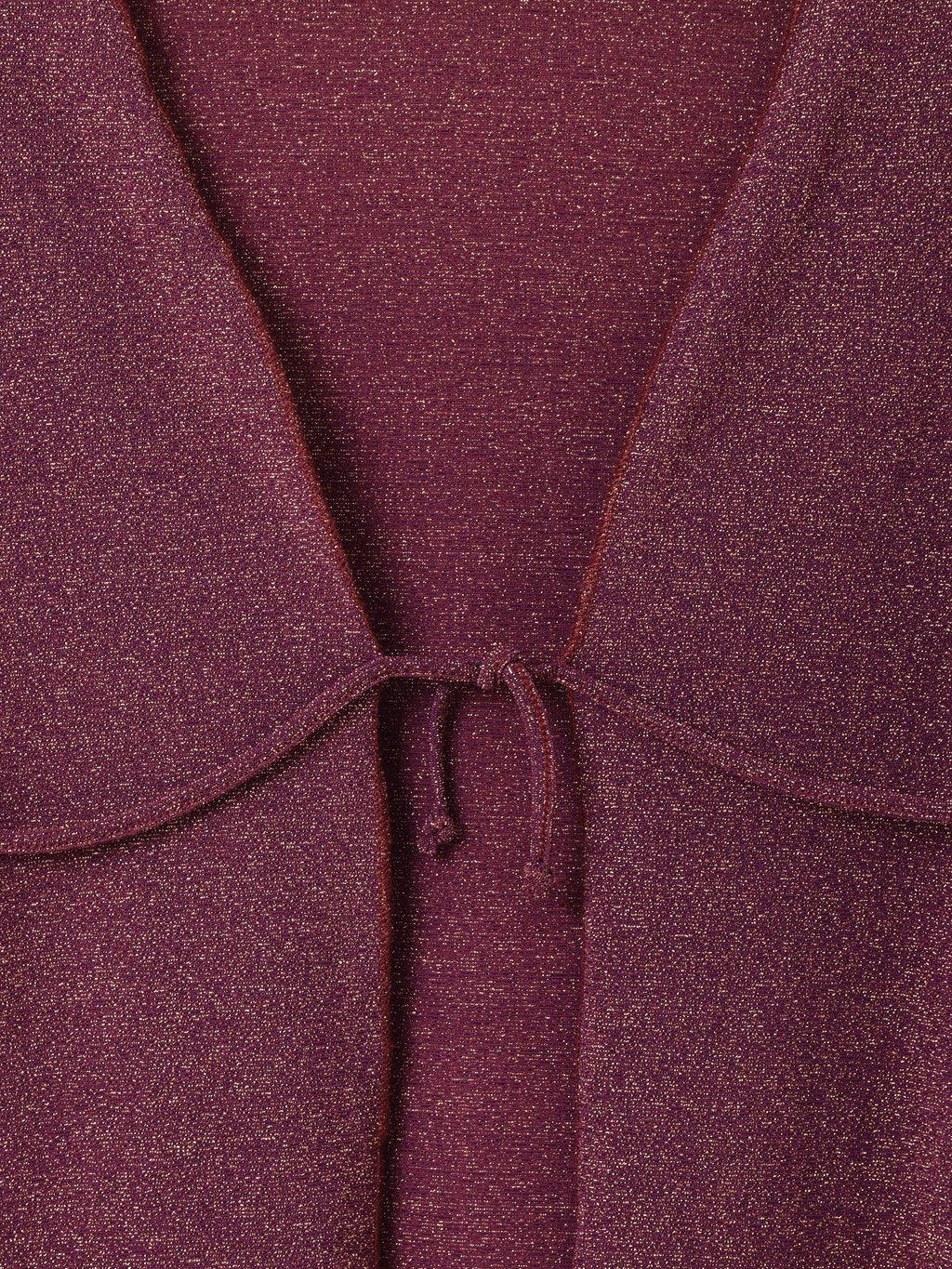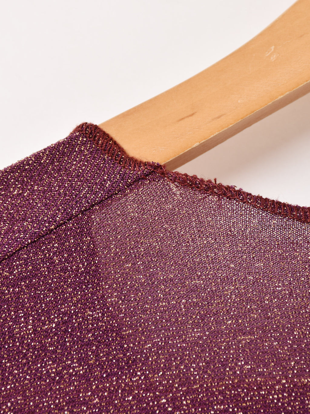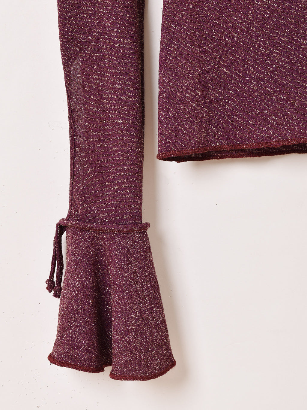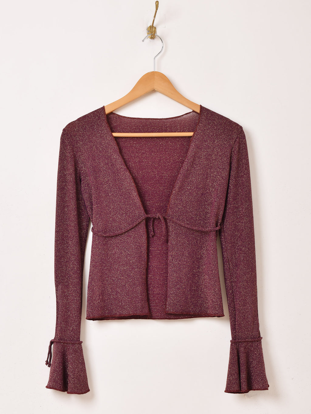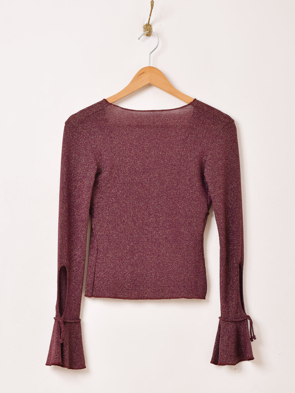 キラキラのラメが施された前開きのトップス。伸縮性のある生地を使用し、フィット感のある細身シルエットに、袖口のフレアデザインで女性らしいスタイルに着こなせます。