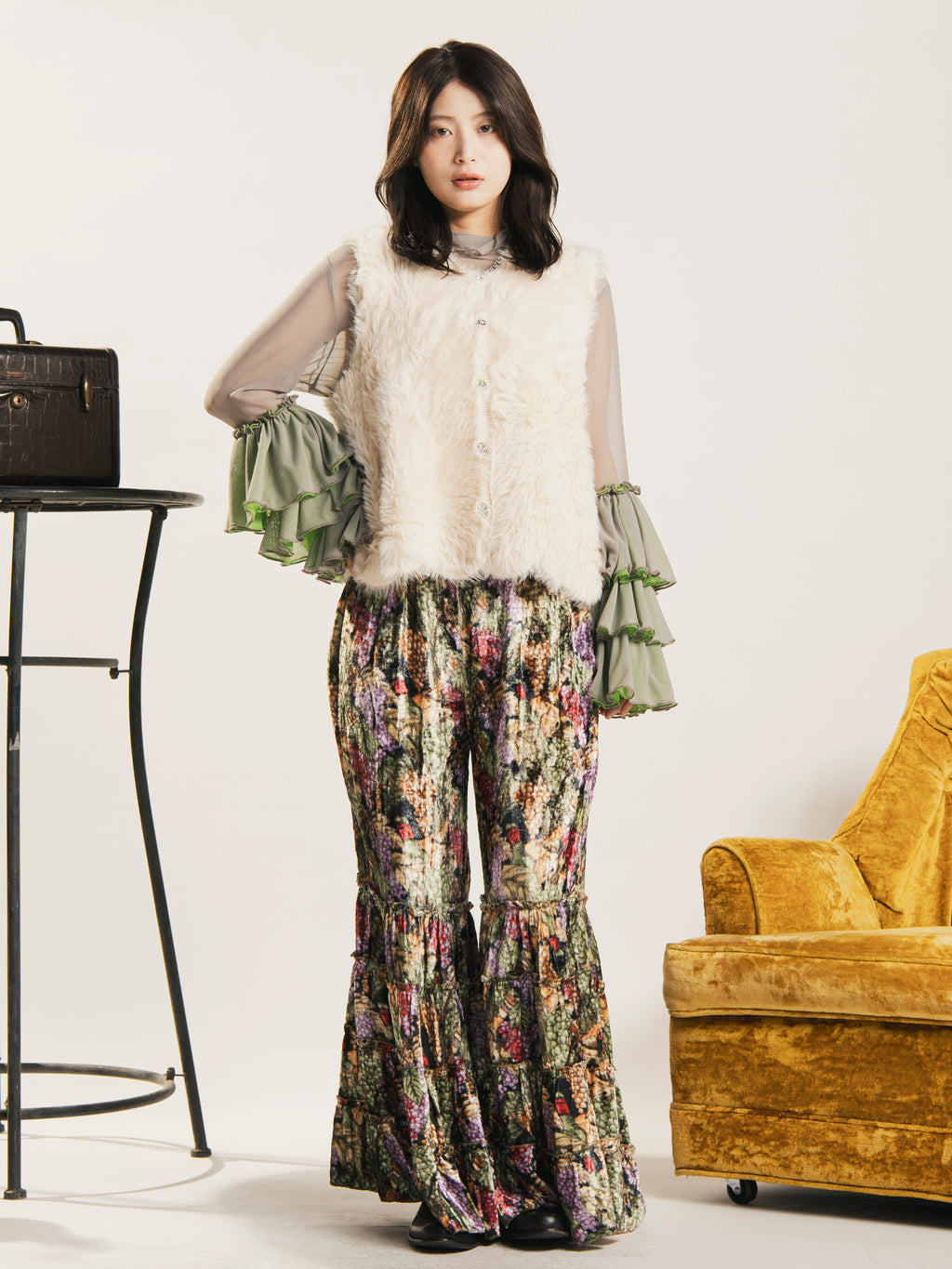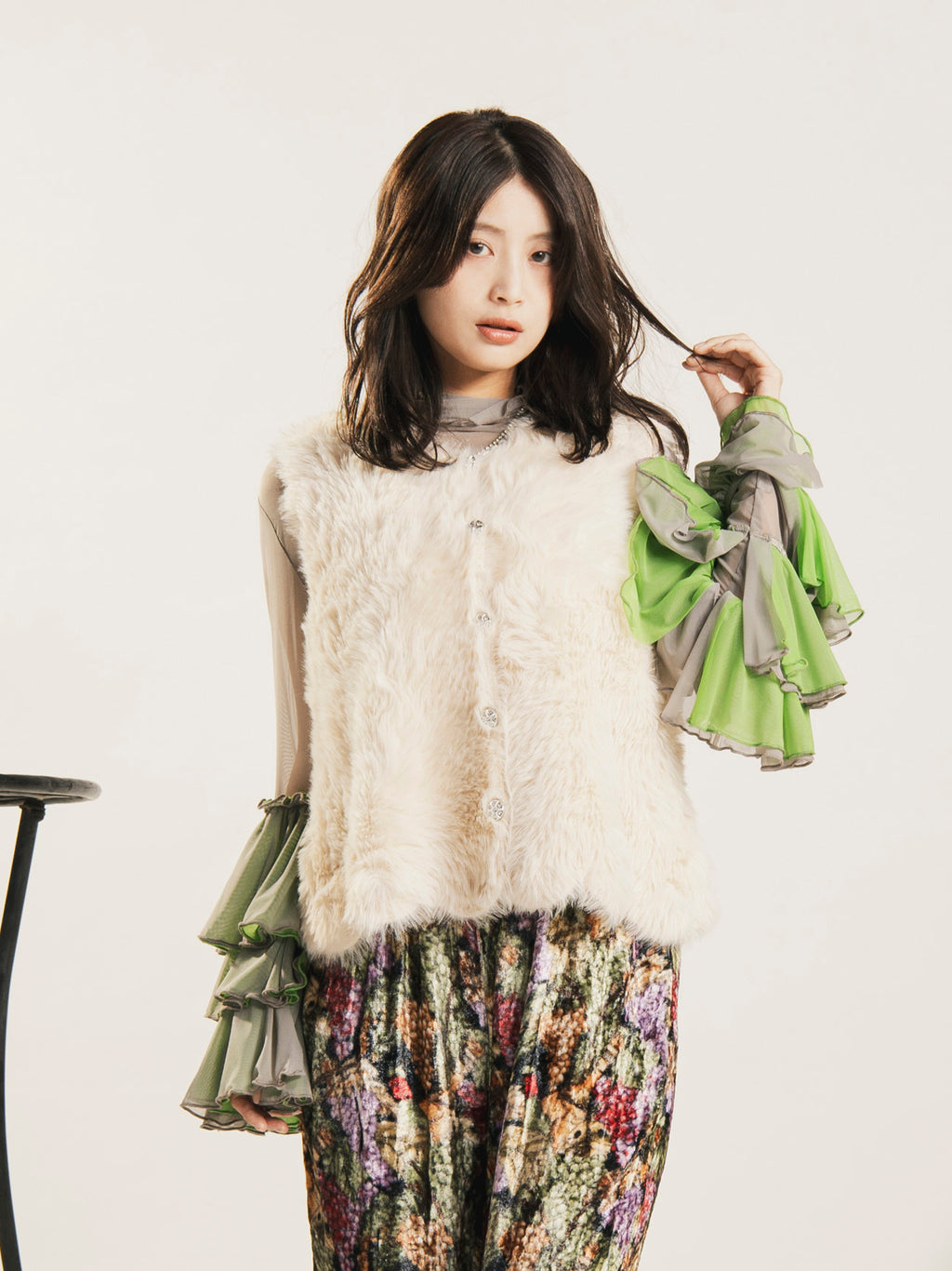 ボリューミーな袖のフリルがポイントになった、長袖のシアートップス。ガーリーなデザインと程よい透け感がトレンド感のある着こなしにぴったりの一着。やや伸縮性のある生地感です。