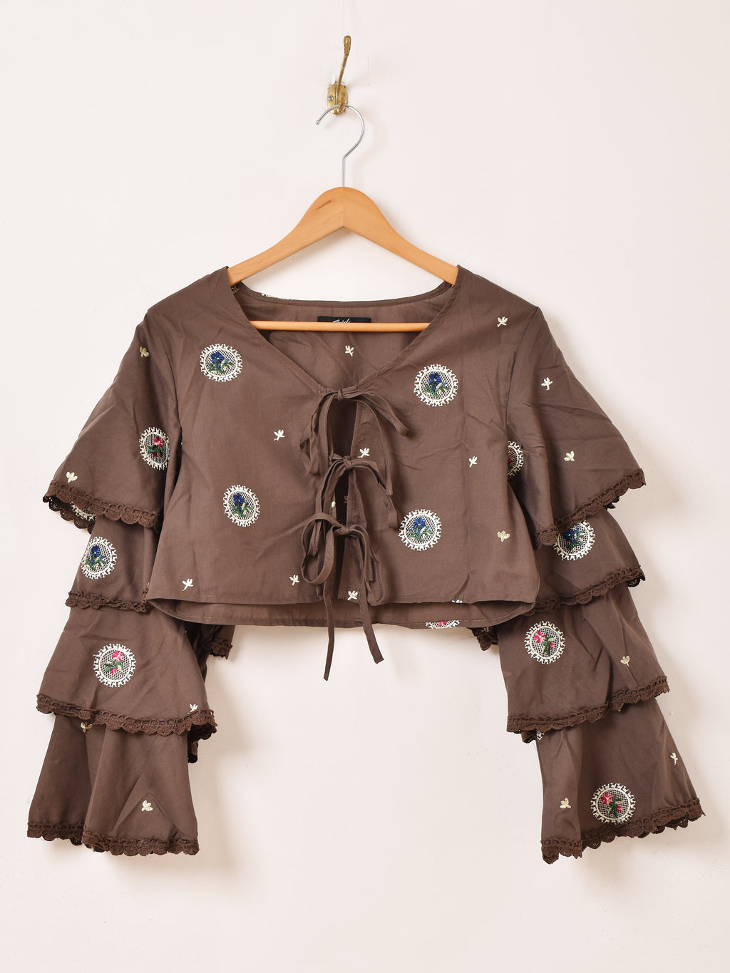 袖の4段ラッフルがアクセントになった、お花の刺繍生地のブラウス。フロントはリボン留めタイプ。クロップド丈で脚長効果も期待できそう。