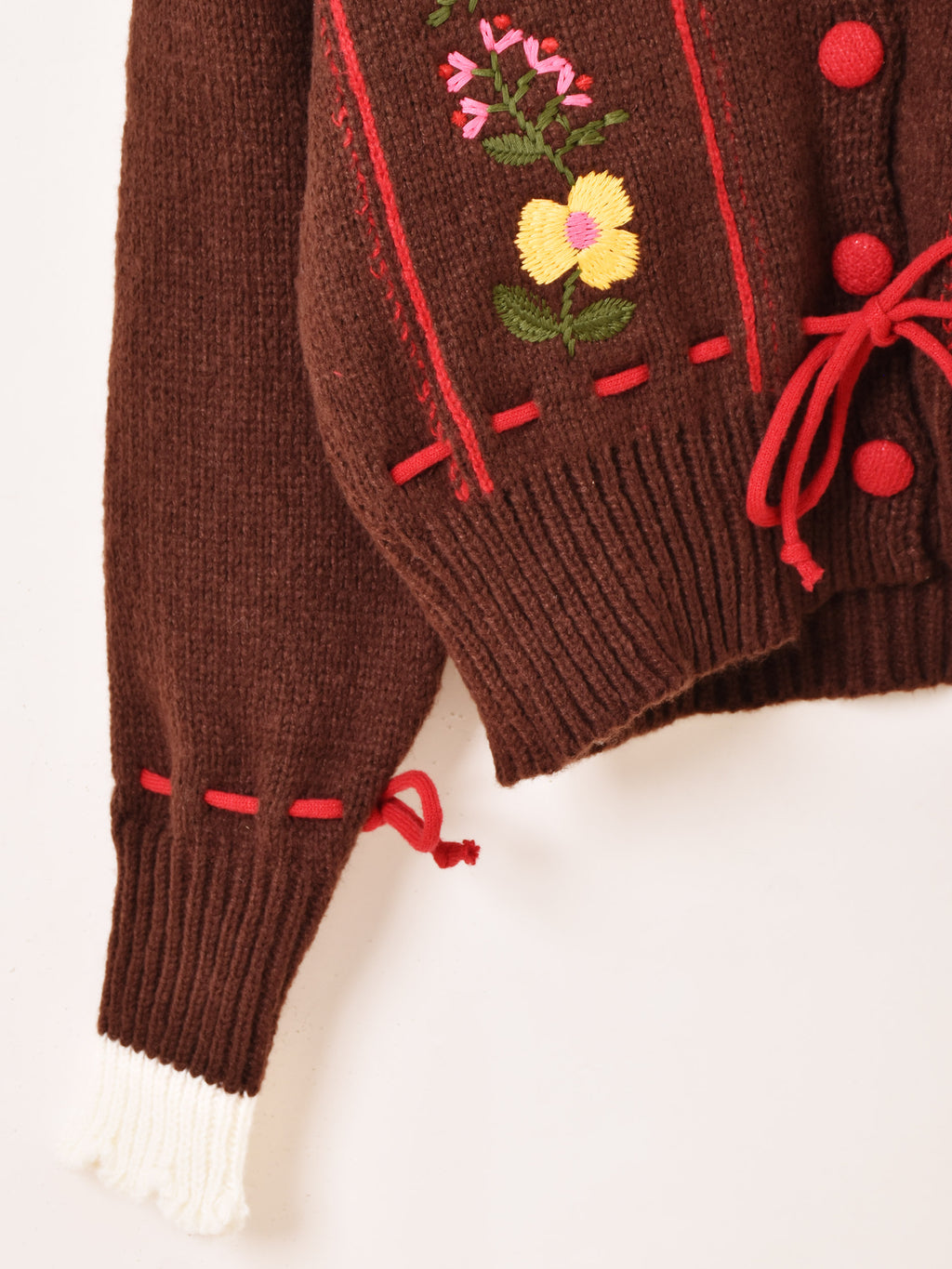 花の刺繍がフロントにあしらわれ、チロリアンなテイストが詰まったカーディガン。程よい厚みで、あたたかみのあるアクリルニット生地です。
