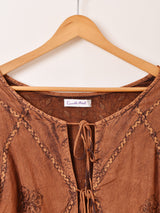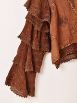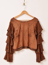 インド製のレーヨン刺繍生地で仕立てたブラウス。細かな刺繍モチーフや表面のウォッシュ加工など、エスニックなデザインが魅力的な一着です。袖のラッフルデザインがポイント。ショート丈でスタイルアップしつつ、コーデに華やかさを添えてくれます。