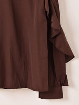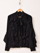 フロントとスリーブに、たっぷりのフリルをあしらった長袖ブラウス。フリルの華やかな動きのシルエットに、首元は女性らしいボウタイデザインで、エレガントに着こなせます。