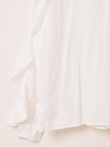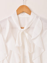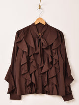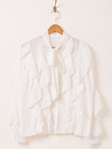 フロントとスリーブに、たっぷりのフリルをあしらった長袖ブラウス。フリルの華やかな動きのシルエットに、首元は女性らしいボウタイデザインで、エレガントに着こなせます。