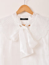 大きなレースの襟にボウタイデザインで、エレガントな長袖ブラウス。光沢のあるシアー生地で、程よい透け感がおしゃれ見えする一着です。