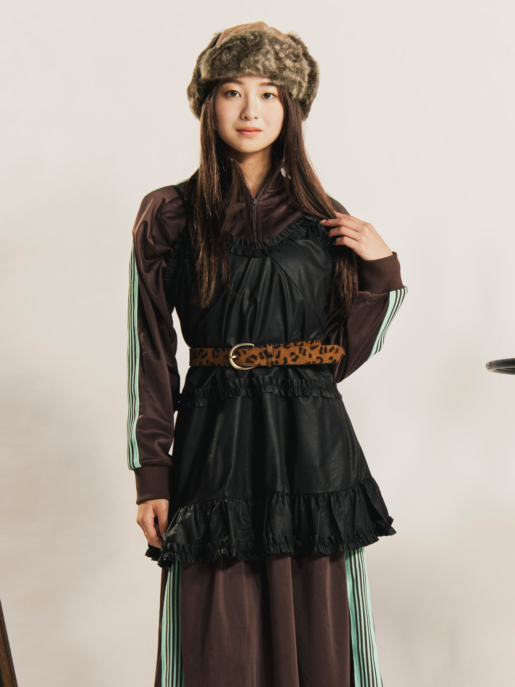 マットな質感のフェイクレザー生地で仕立てたキャミソール。フレアに広がるフリルデザインが可愛く、レイヤードコーデのアクセントになる一着。絶妙なミニ丈なので、ミニワンピース感覚としても着こなせます。