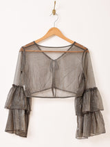 キラッと光る、ストライプのラメに、袖のラッフルデザインが華やかで可愛いブラウス。シアーの大胆な透け感で、レイヤードコーディネートに大活躍します。クロップド丈でスタイルアップ効果も◎。