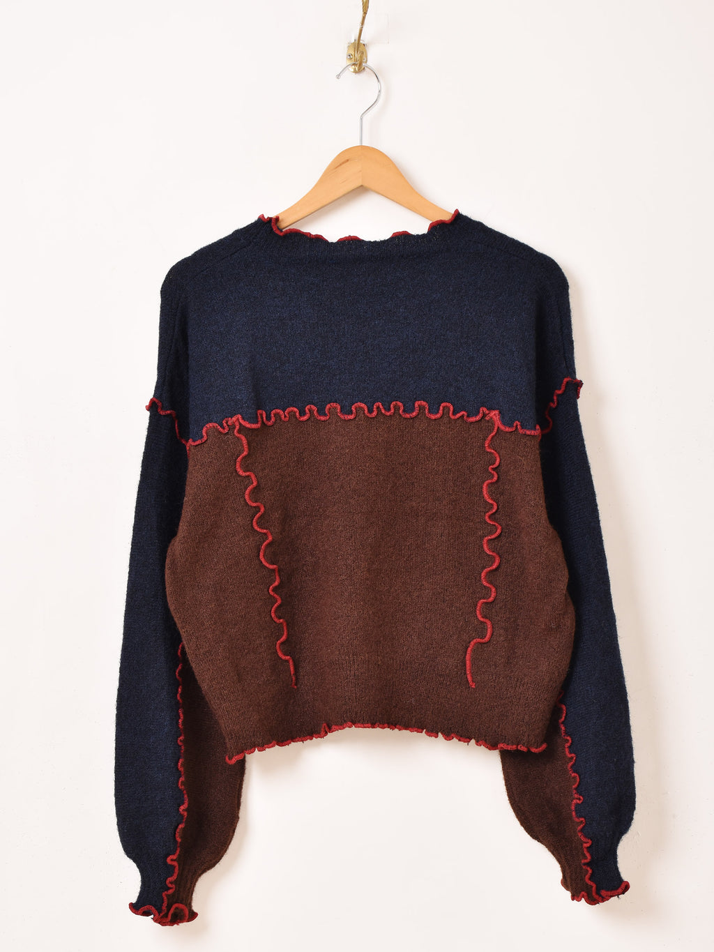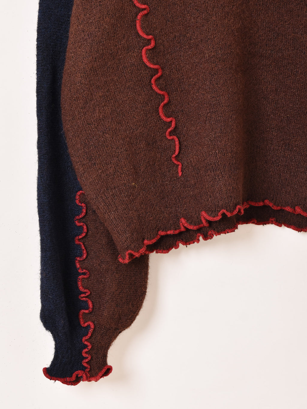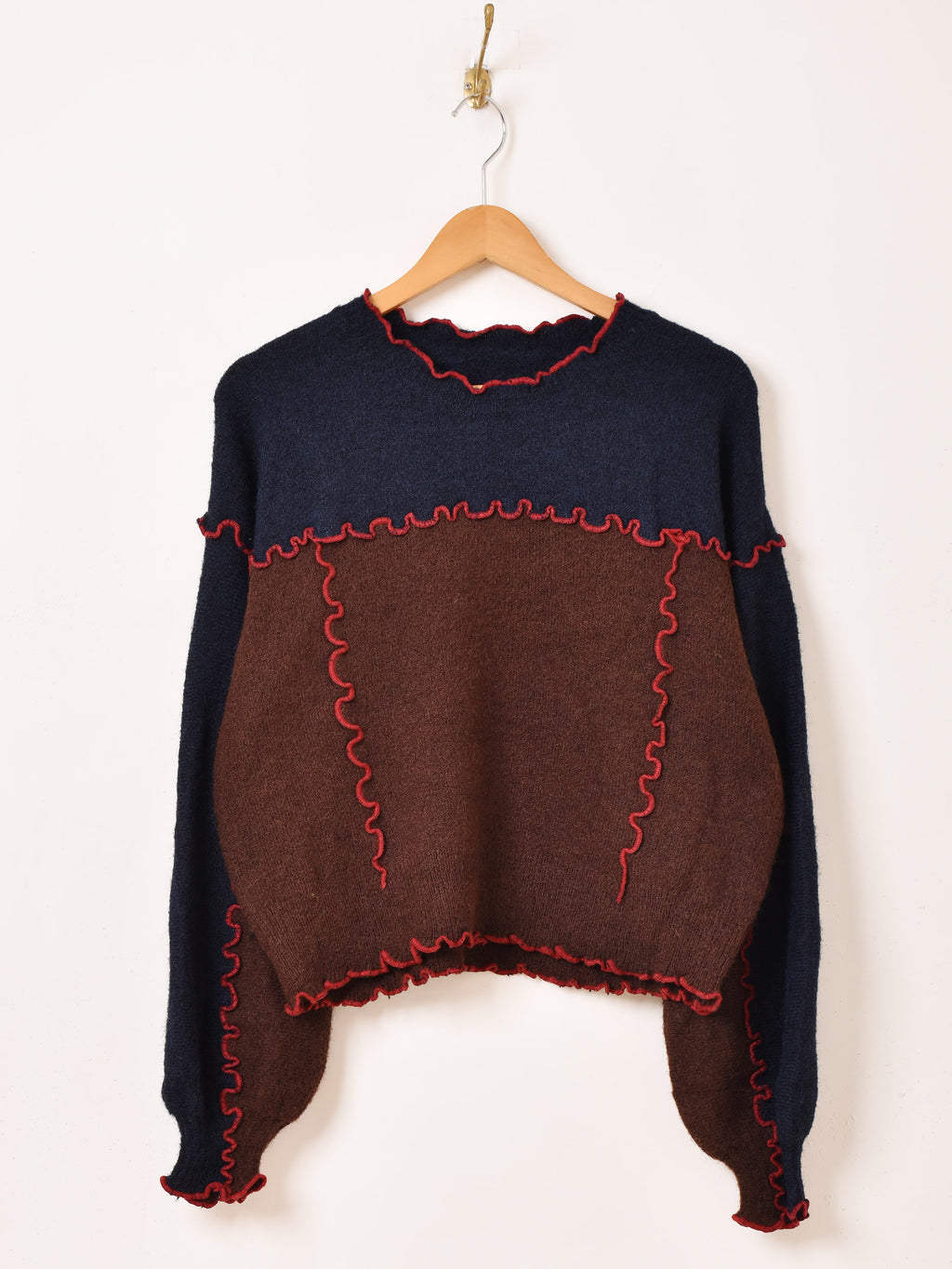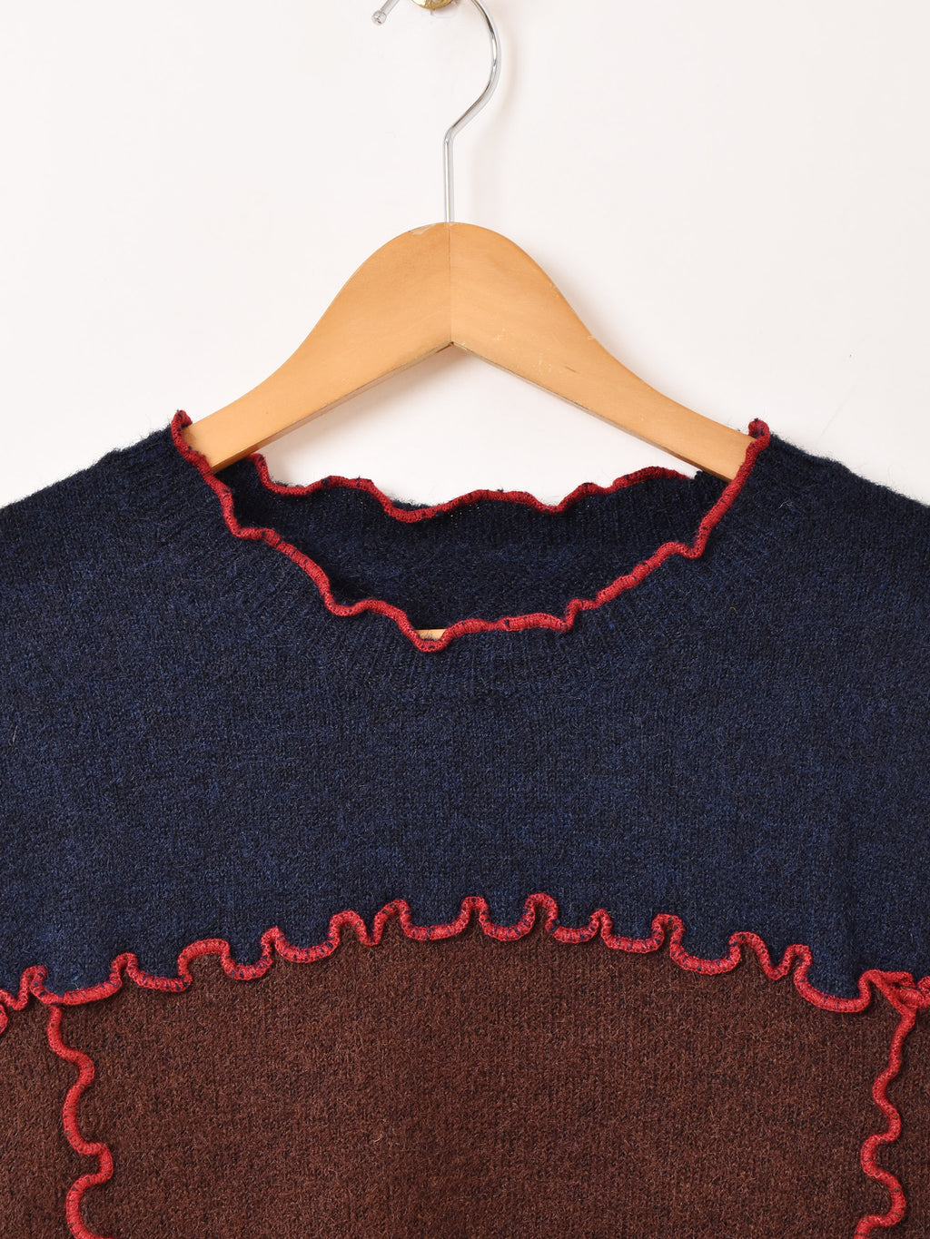 3色使いでメロウデザインをあしらったセーター。ゆるっとしたシルエットでこなれ感を演出してくれます。やや薄手の、柔らかなアクリル混ニット生地で仕立てています。