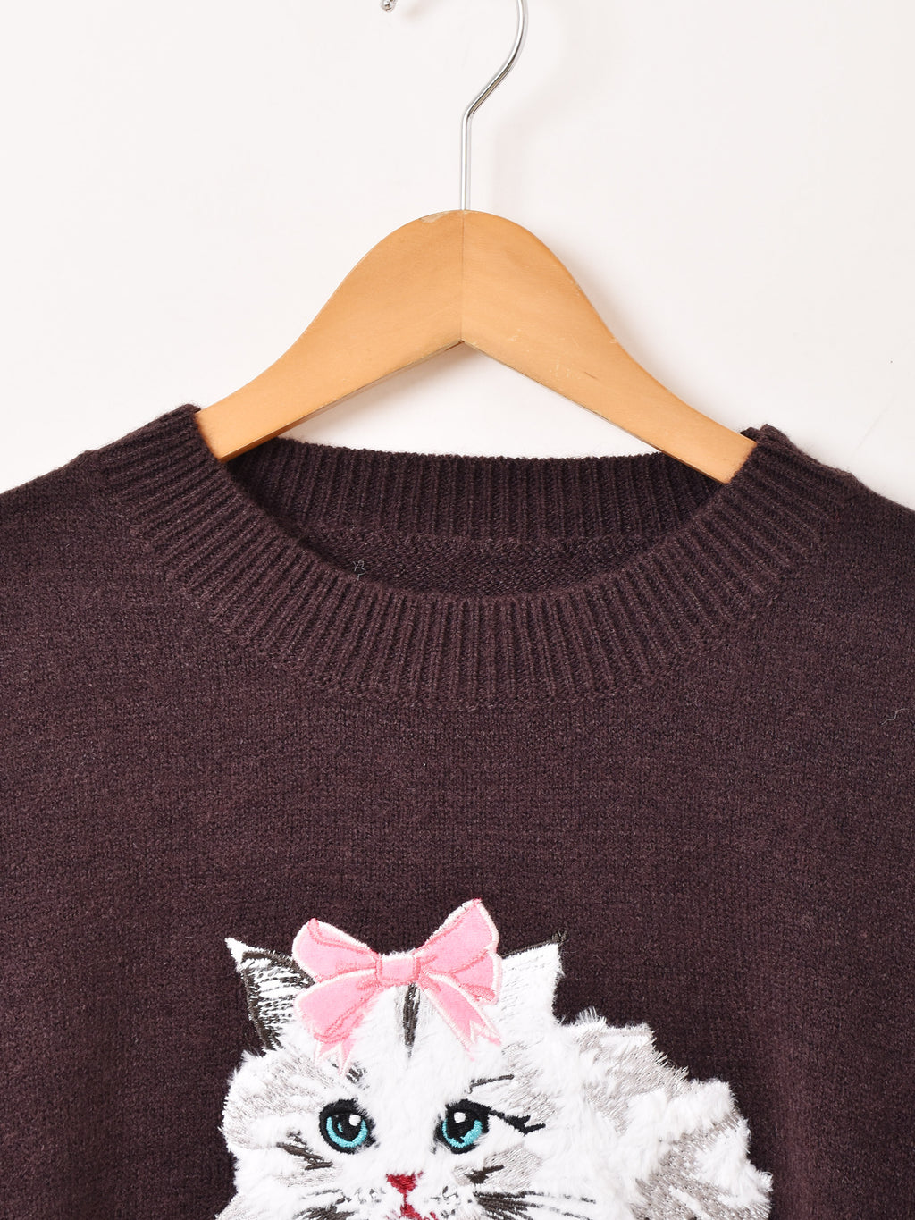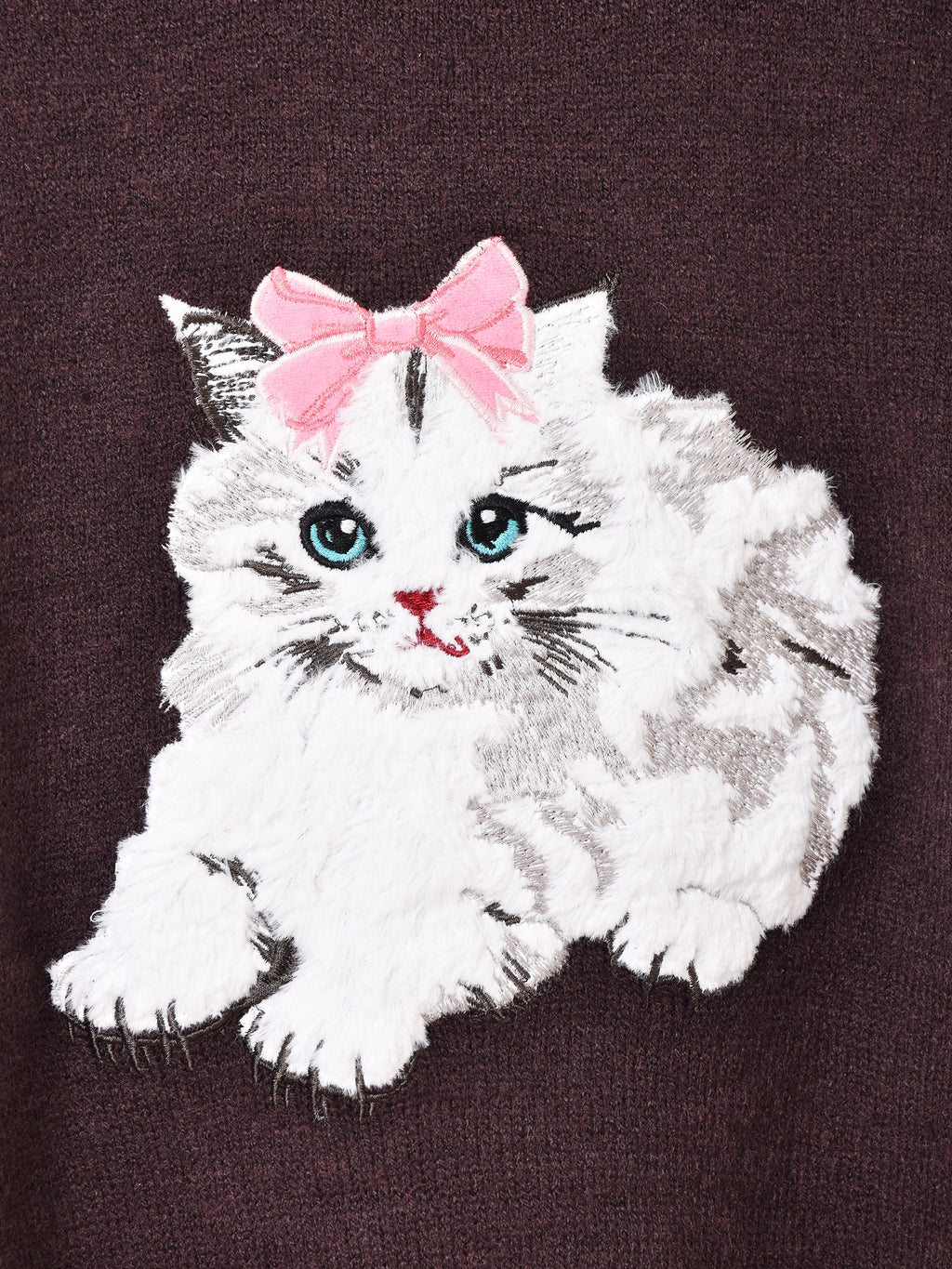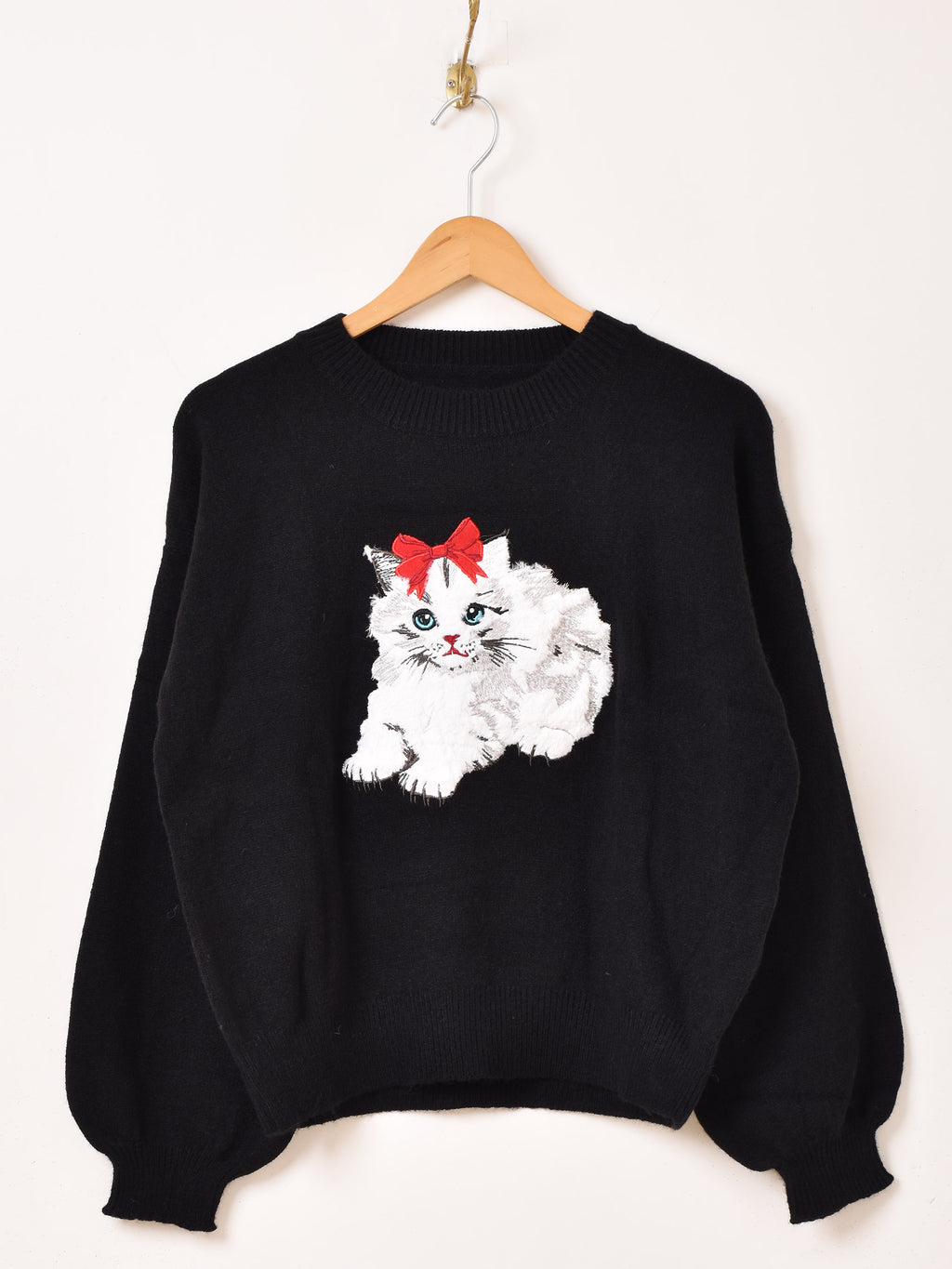 大きなリボンを付けたキュートな猫ちゃんが目を惹くセーター。刺繍はふわふわとした猫ちゃんの毛並みも再現しています。シンプルなカラーですが、コーディネートの主役にぴったりの一着です。