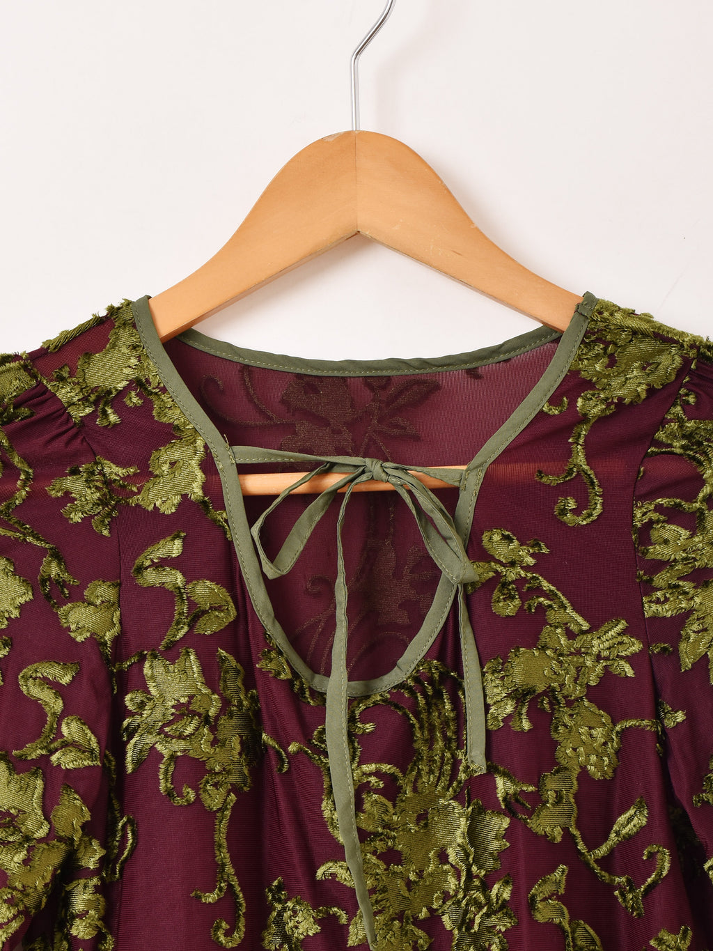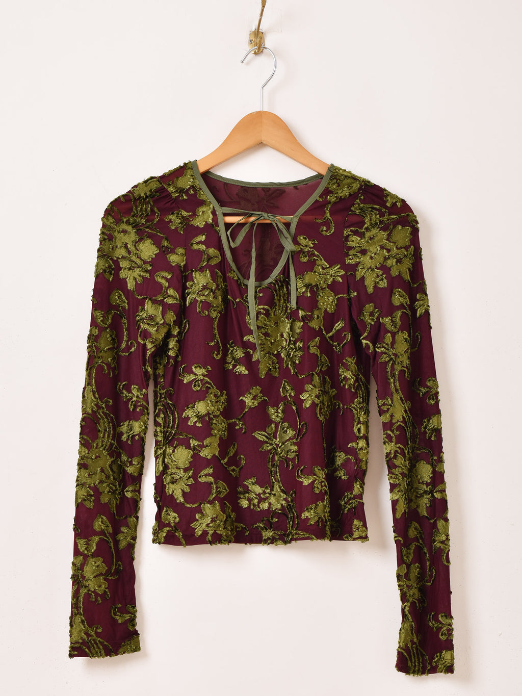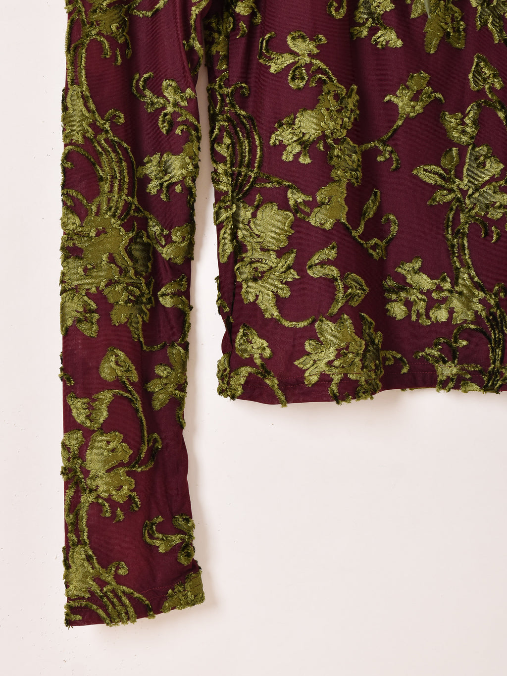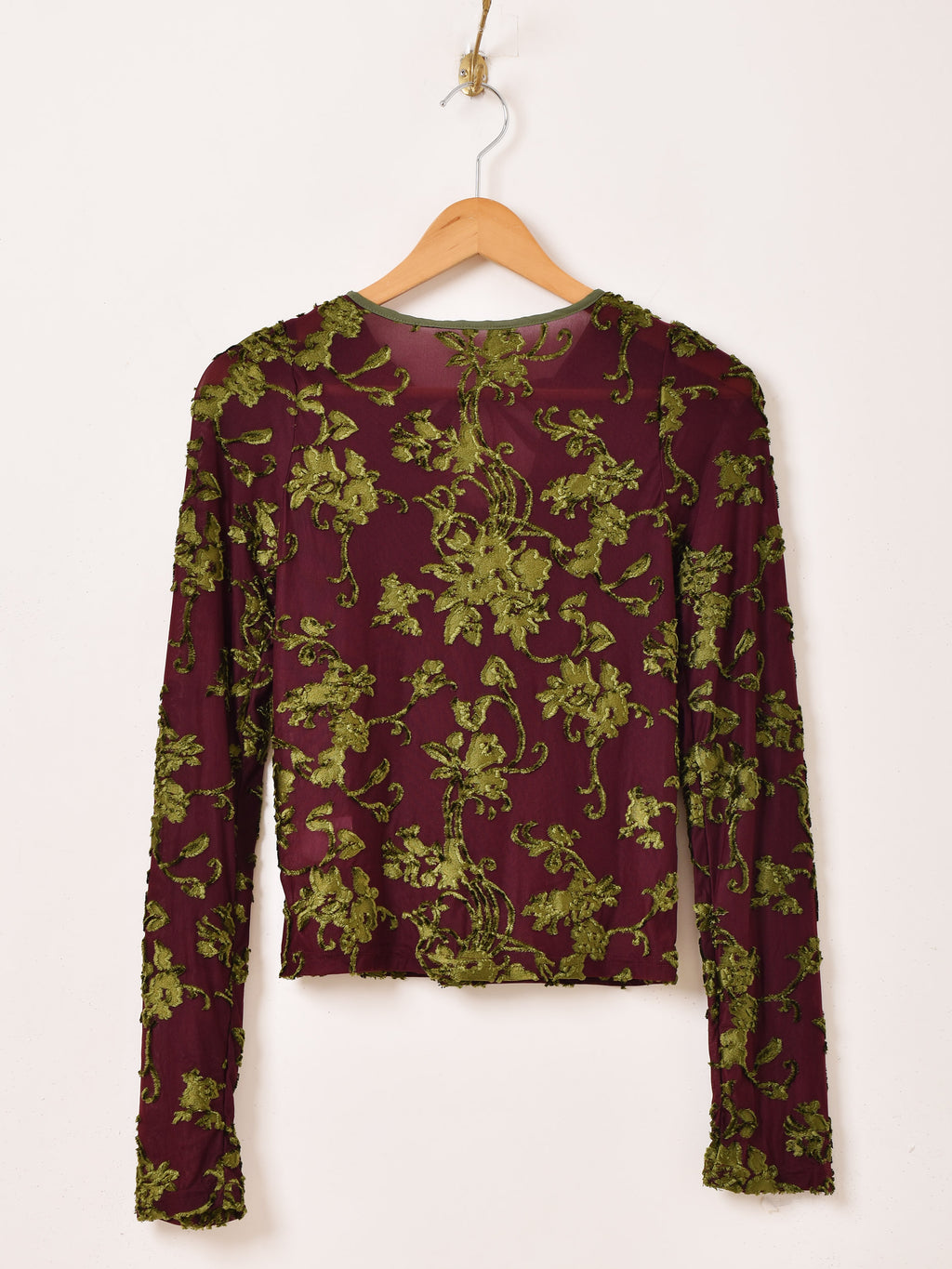 程よい透け感のあるシアー生地に、ベロアのジャガードをあしらった長袖カットソー。デコルテをチラ見せしたデザインもポイント。レイヤードコーデのインナーとして着回せます。