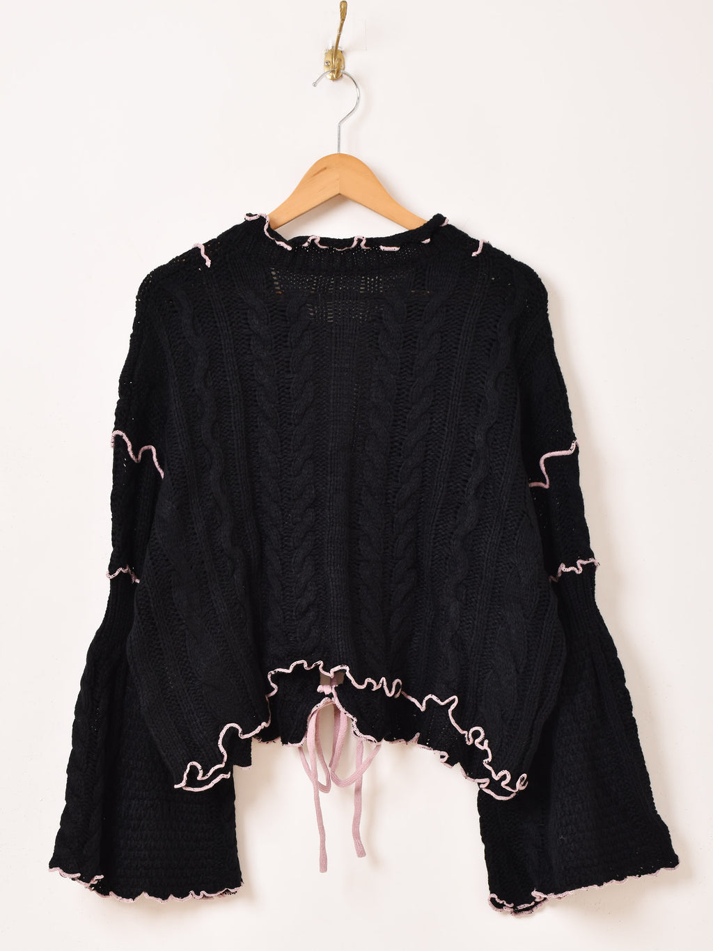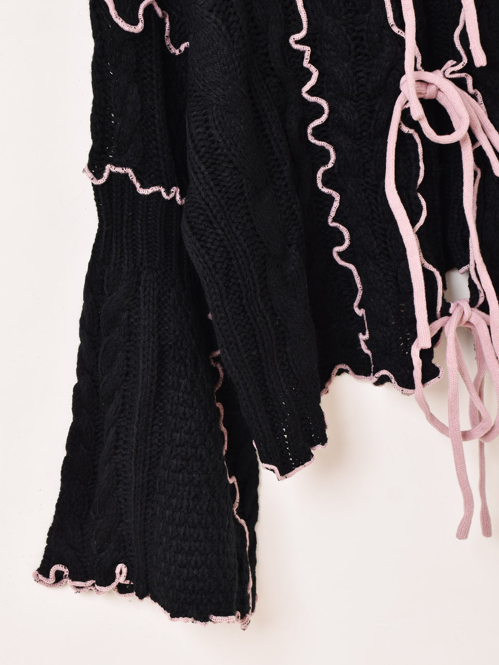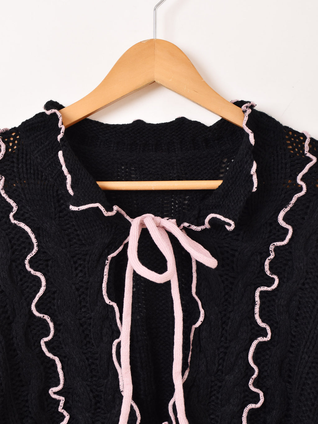 着るだけでおしゃれ見えするメロウデザインに、フロントのリボン結びが可愛いカーディガン。パイピングカラーもアクセントになっています。袖はトレンド感のあるフレアシルエット。程よいローケージのニットです。