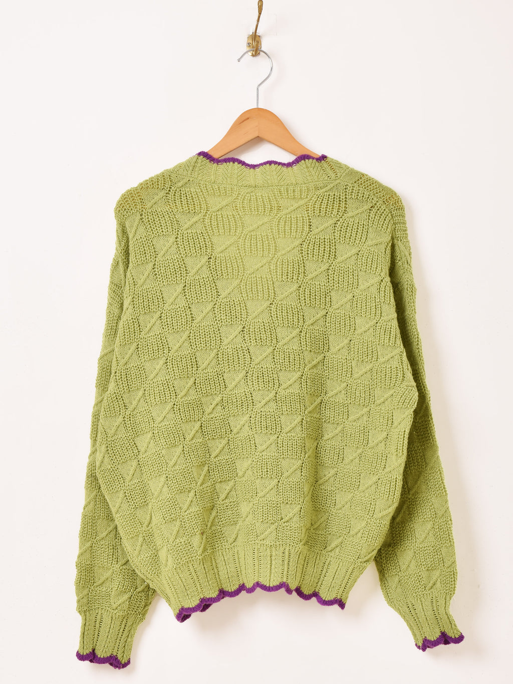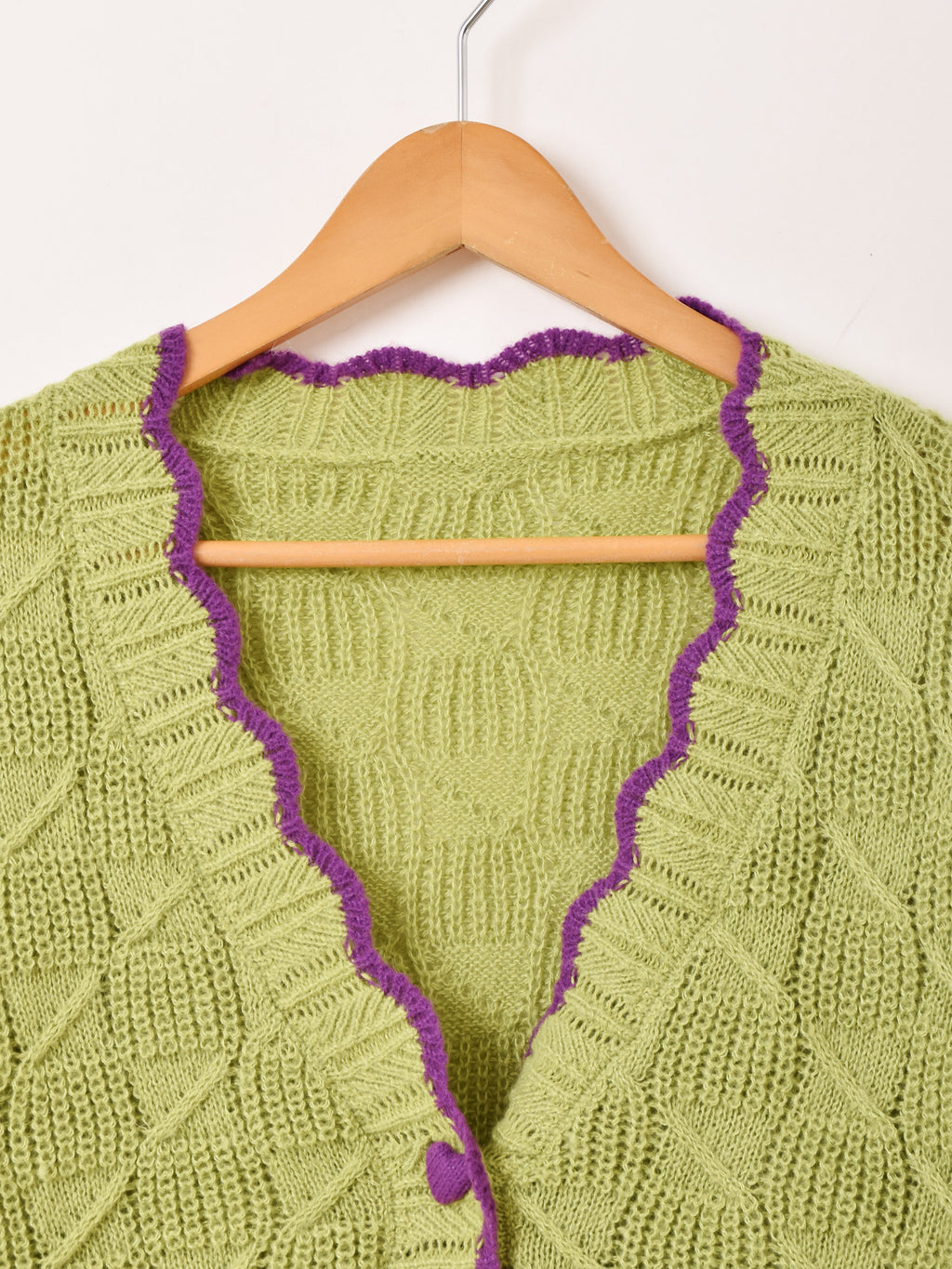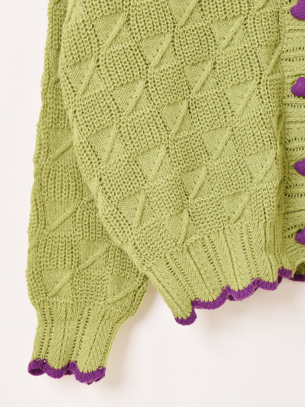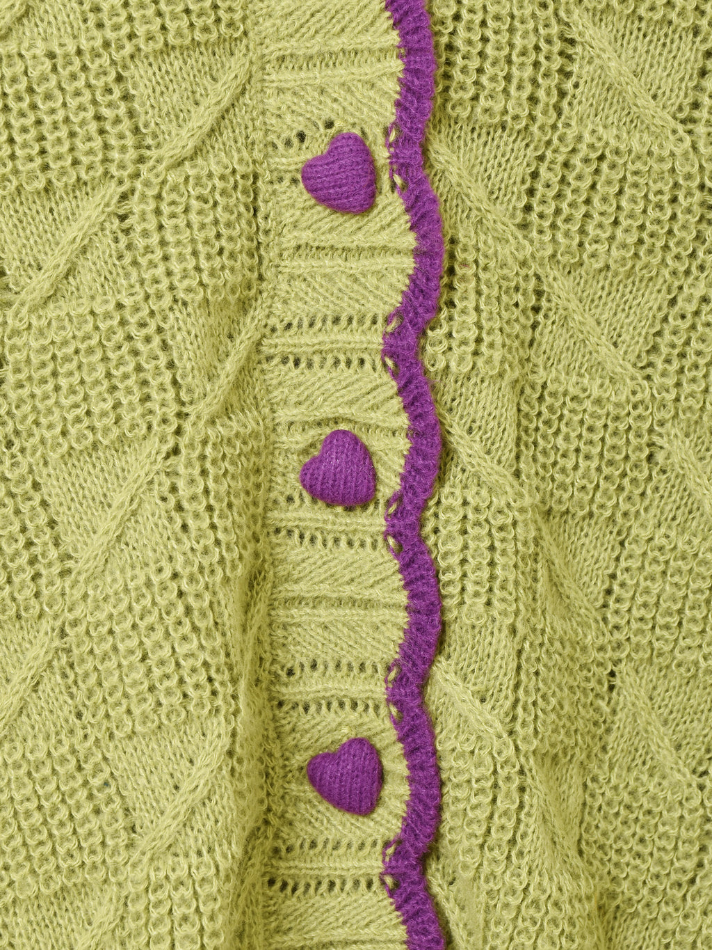 ウェーブ型のトリムデザインに、ハートのボタンがアクセントになったカーディガン。程よいローケージで、ふんわりとあたたかみのある生地感です。