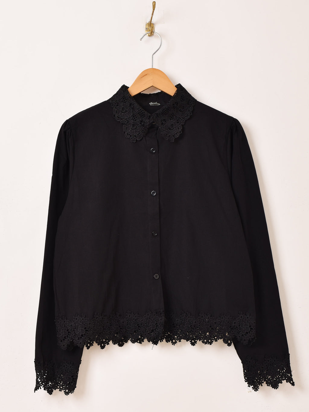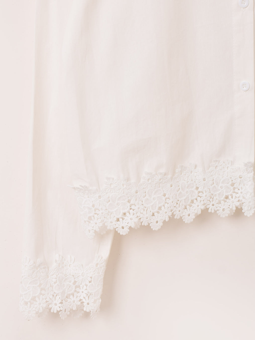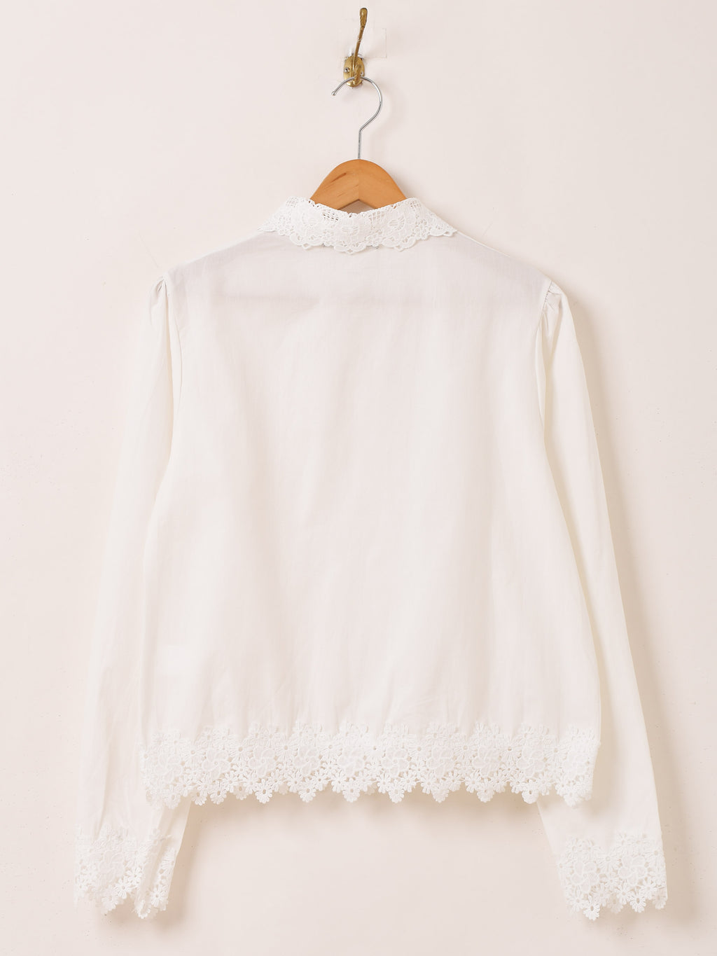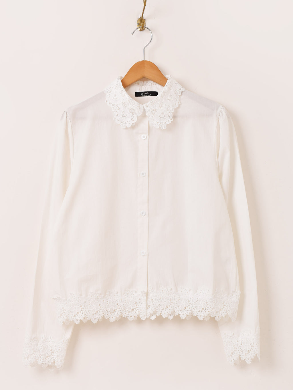 襟元や袖、裾にレースをあしらった長袖ブラウス。上品なレースがアクセントになり、シンプルながらも華やかに着こなせます。