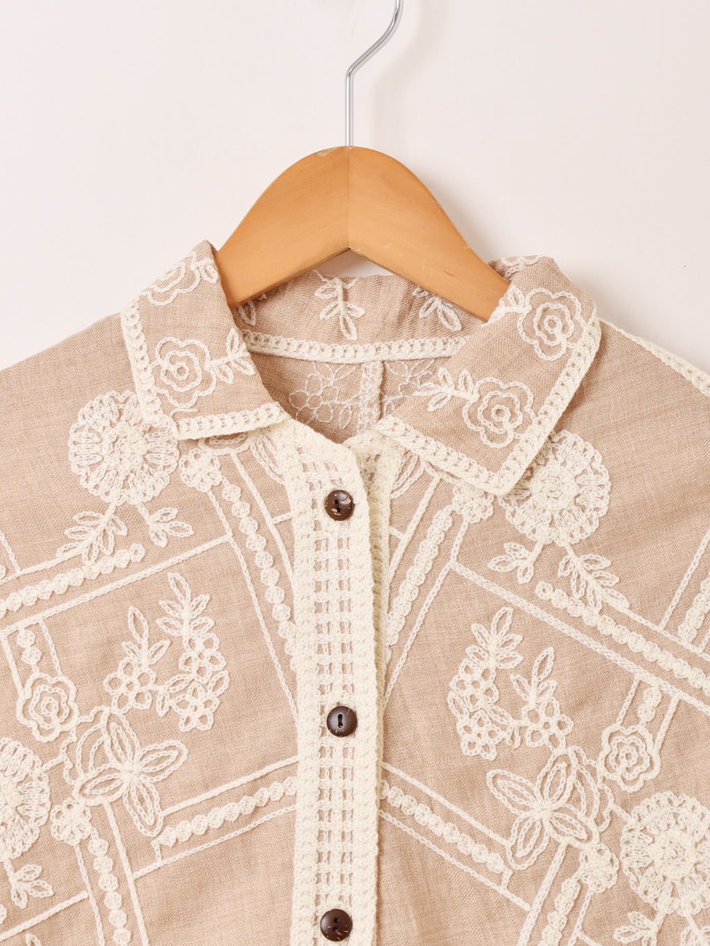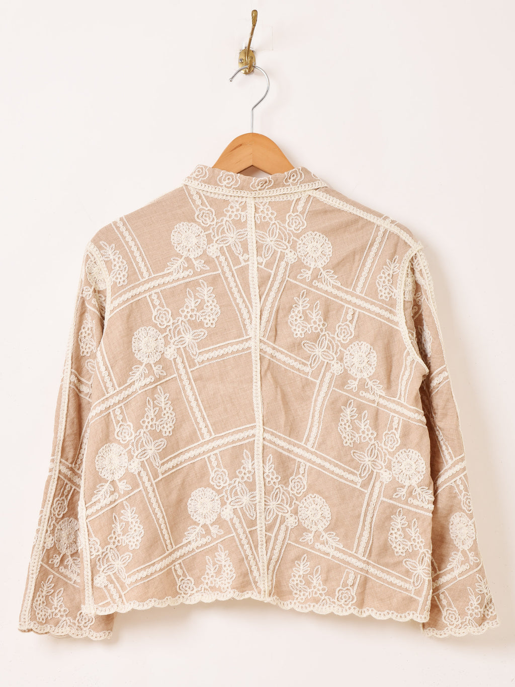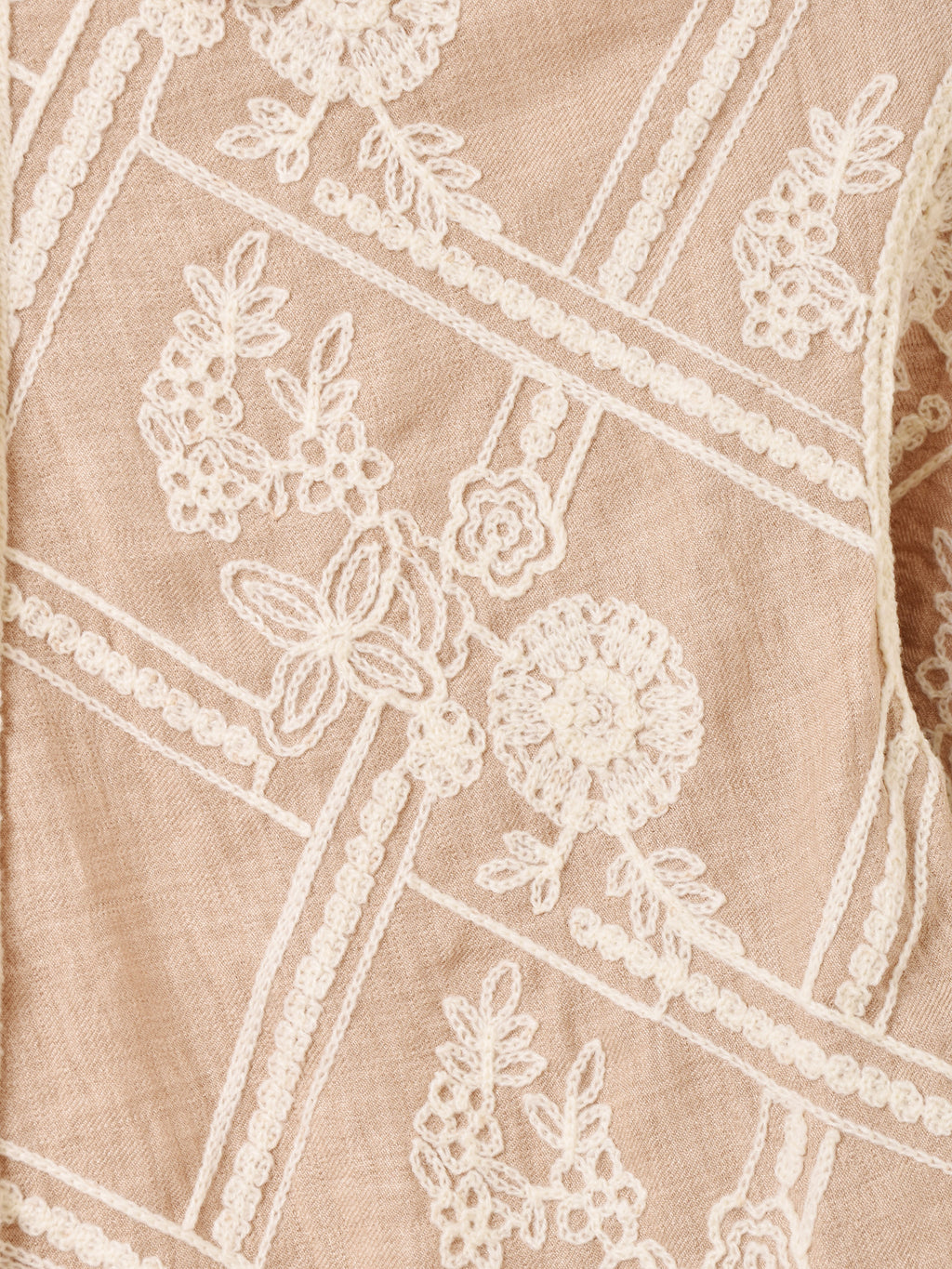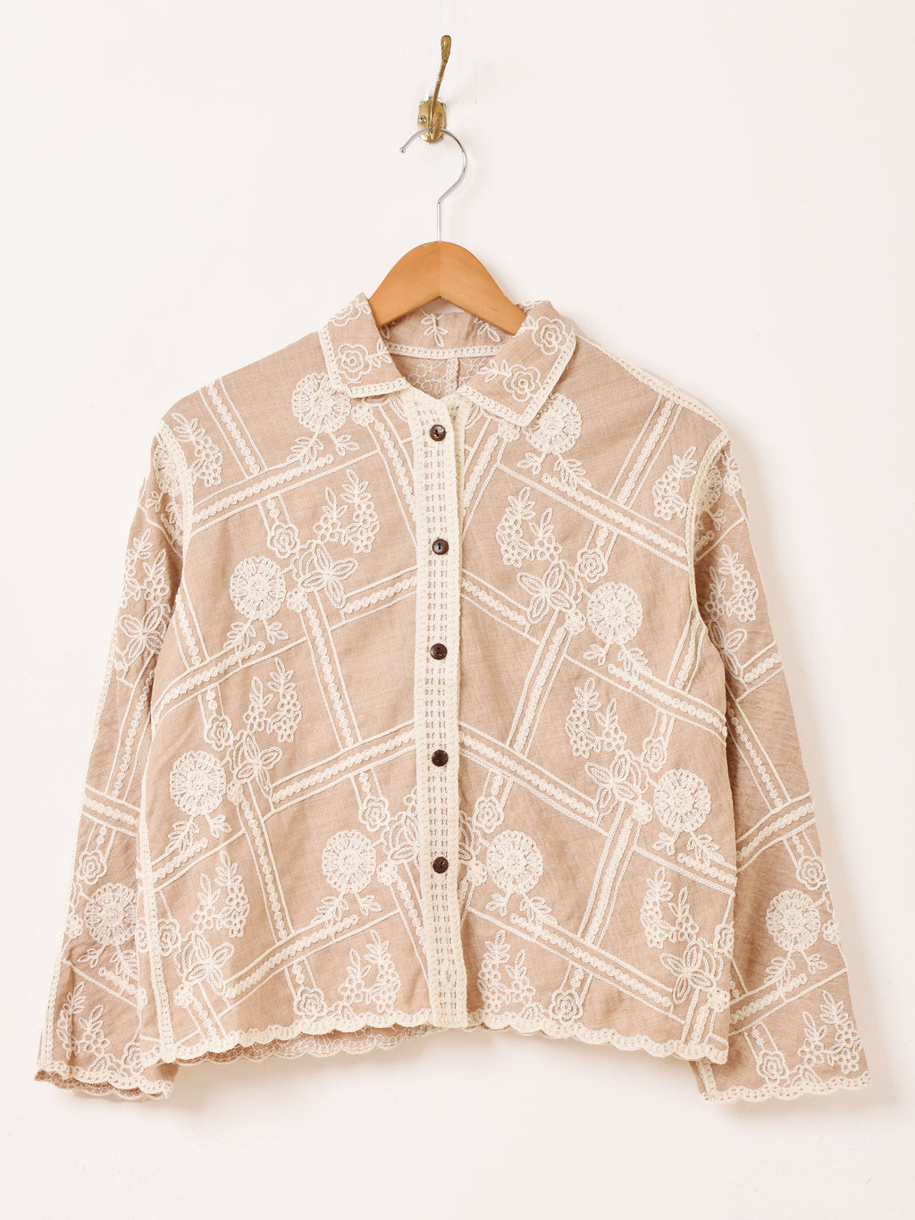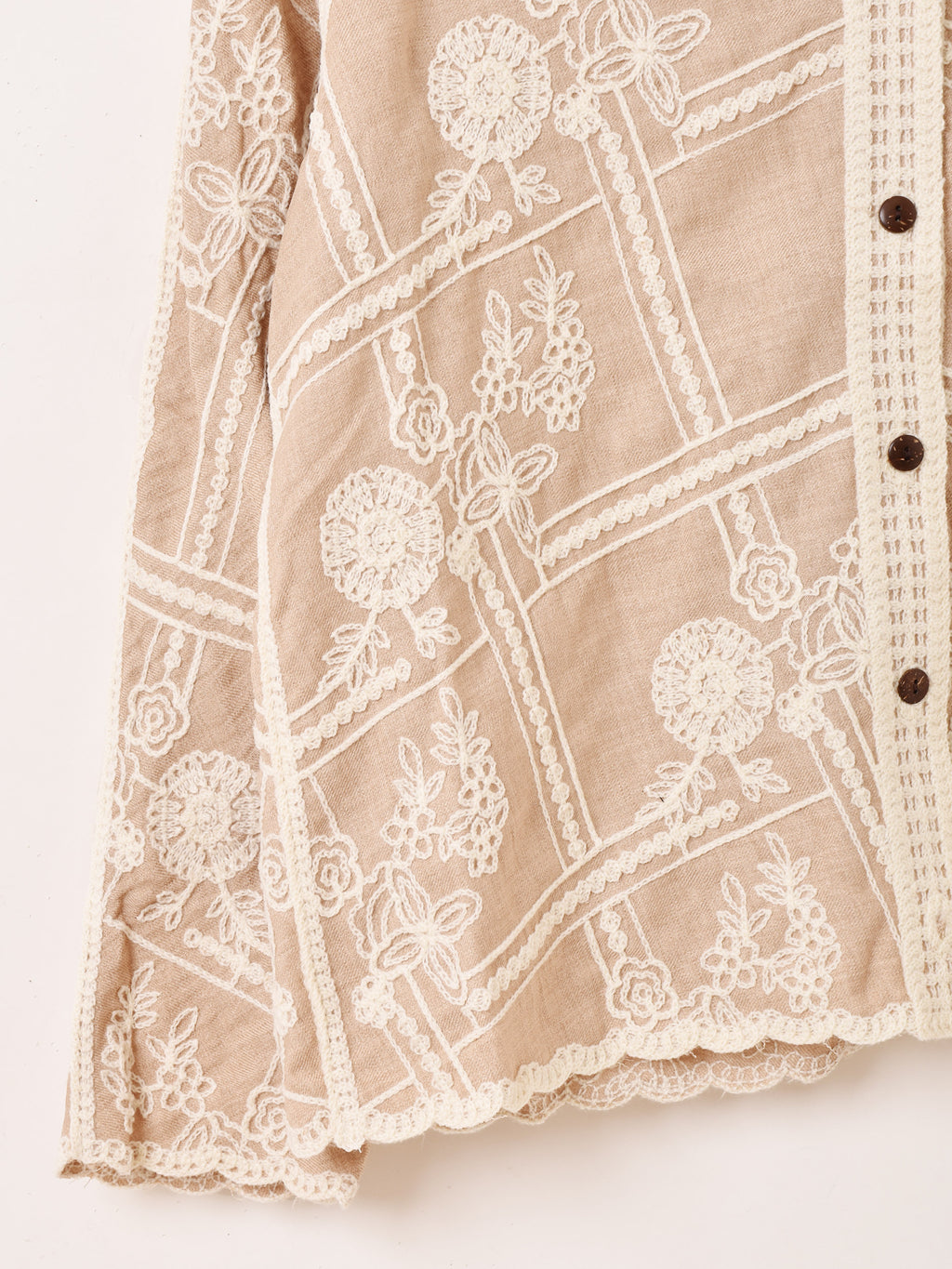 オリエンタルな花模様の刺繍をあしらった長袖シャツ。オールコットン生地で柔らかな印象の一着です。シャツとしても、前を開けてちょっとした羽織としても、コーデのプラスワンアイテムとして活躍する一着です。