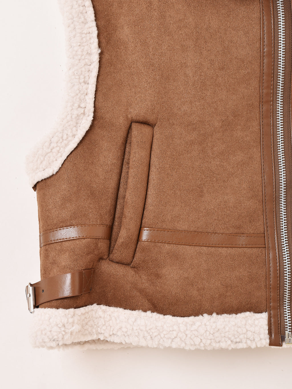 B-3フライトジャケットのような、襟とポケットのディテールがアクセントになったベスト。普段の着こなしにプラスで羽織るだけで印象ががらりと変わる一着です。ムートンボアで防寒性も備わっています。