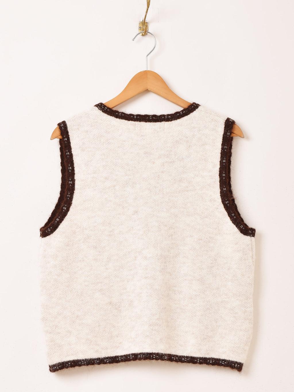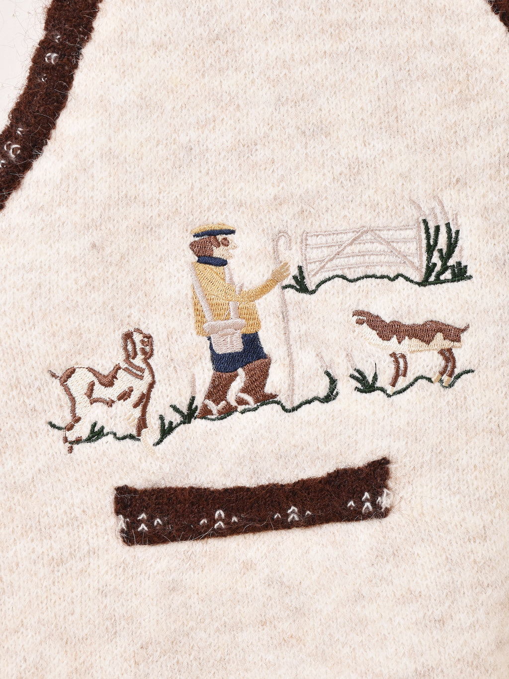 ウッドボタン風のボタンやパイピングデザインなど、あたたかみを感じるニットベスト。フロントにあしらった古着っぽさのあるアニマル刺繍が魅力的な一着です。