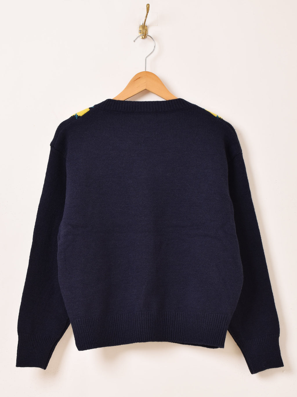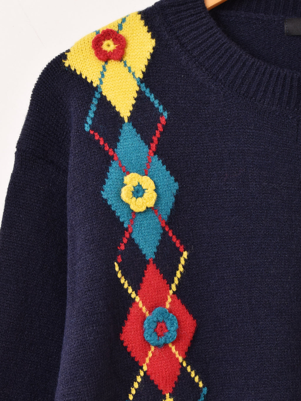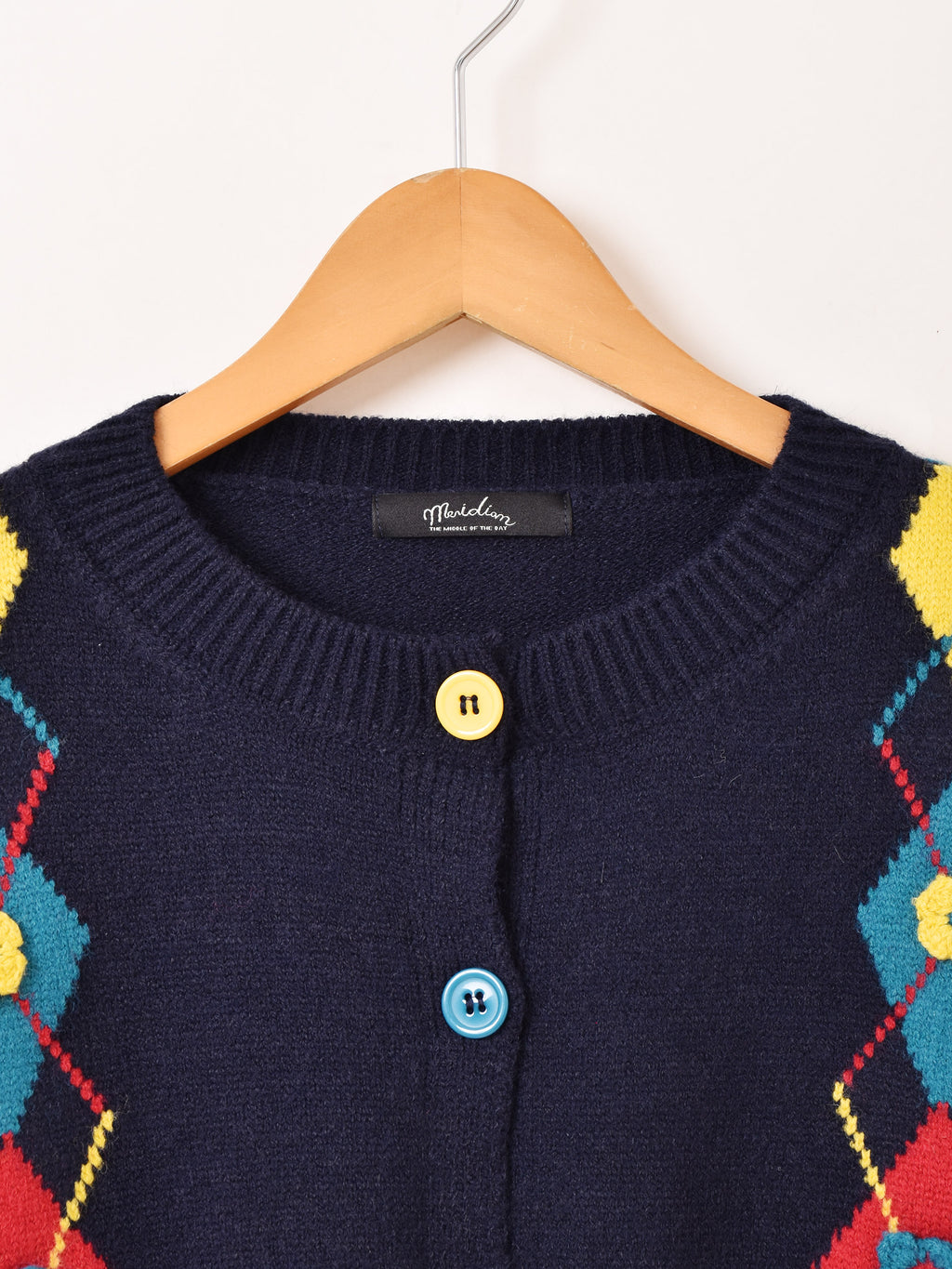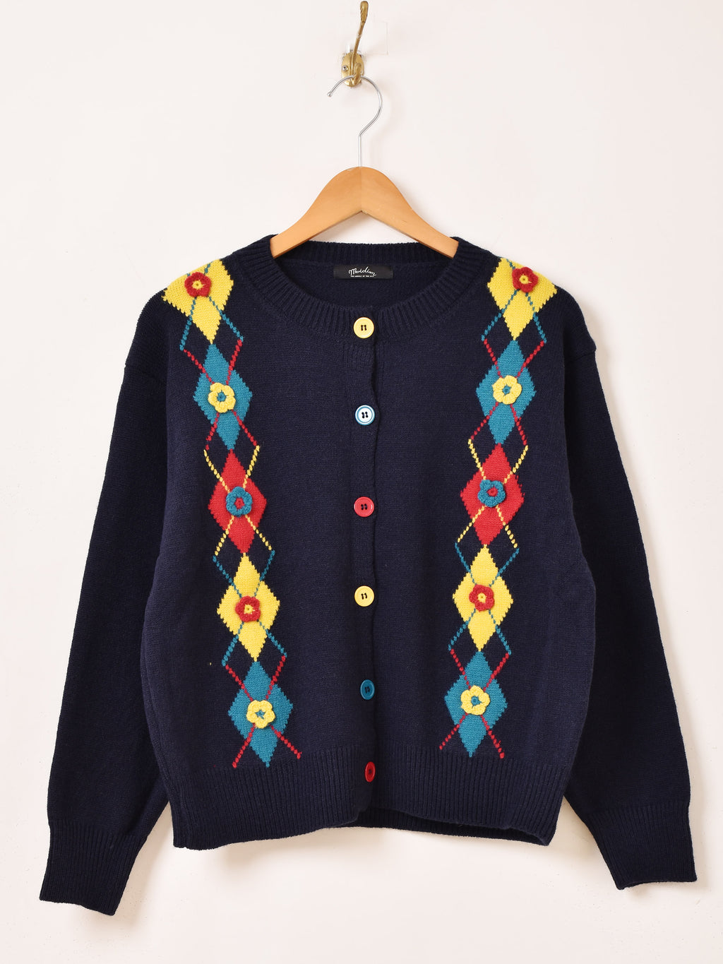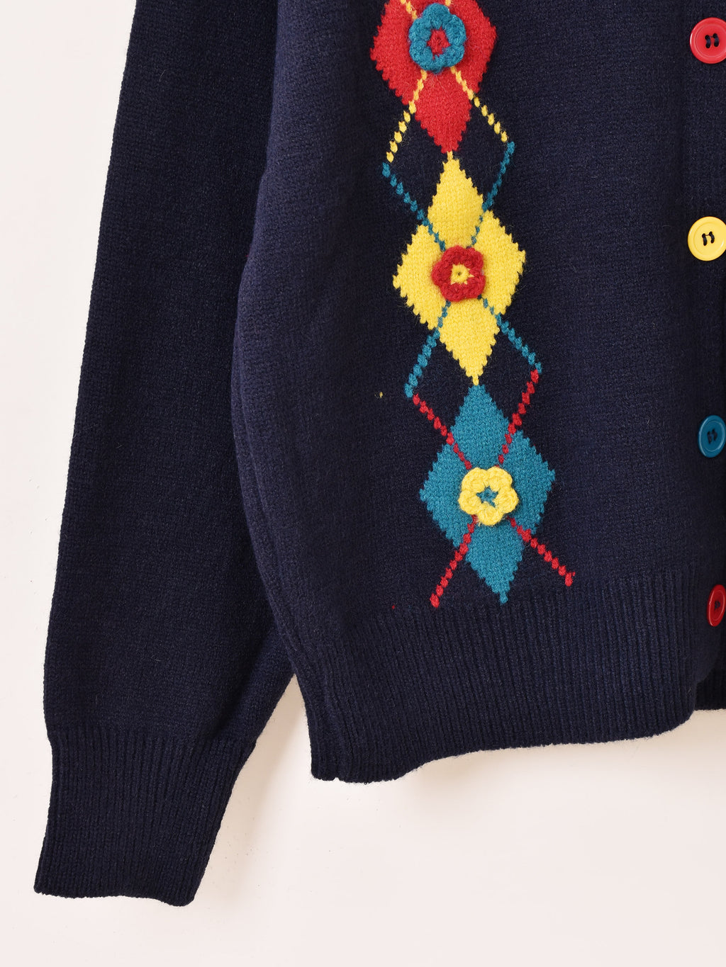 3色使いのアーガイルチェックとお花の装飾が目を惹くカーディガン。ボタンもカラフルな配色になっています。程よく厚みのあるアクリル混ニット生地で仕立てています。
