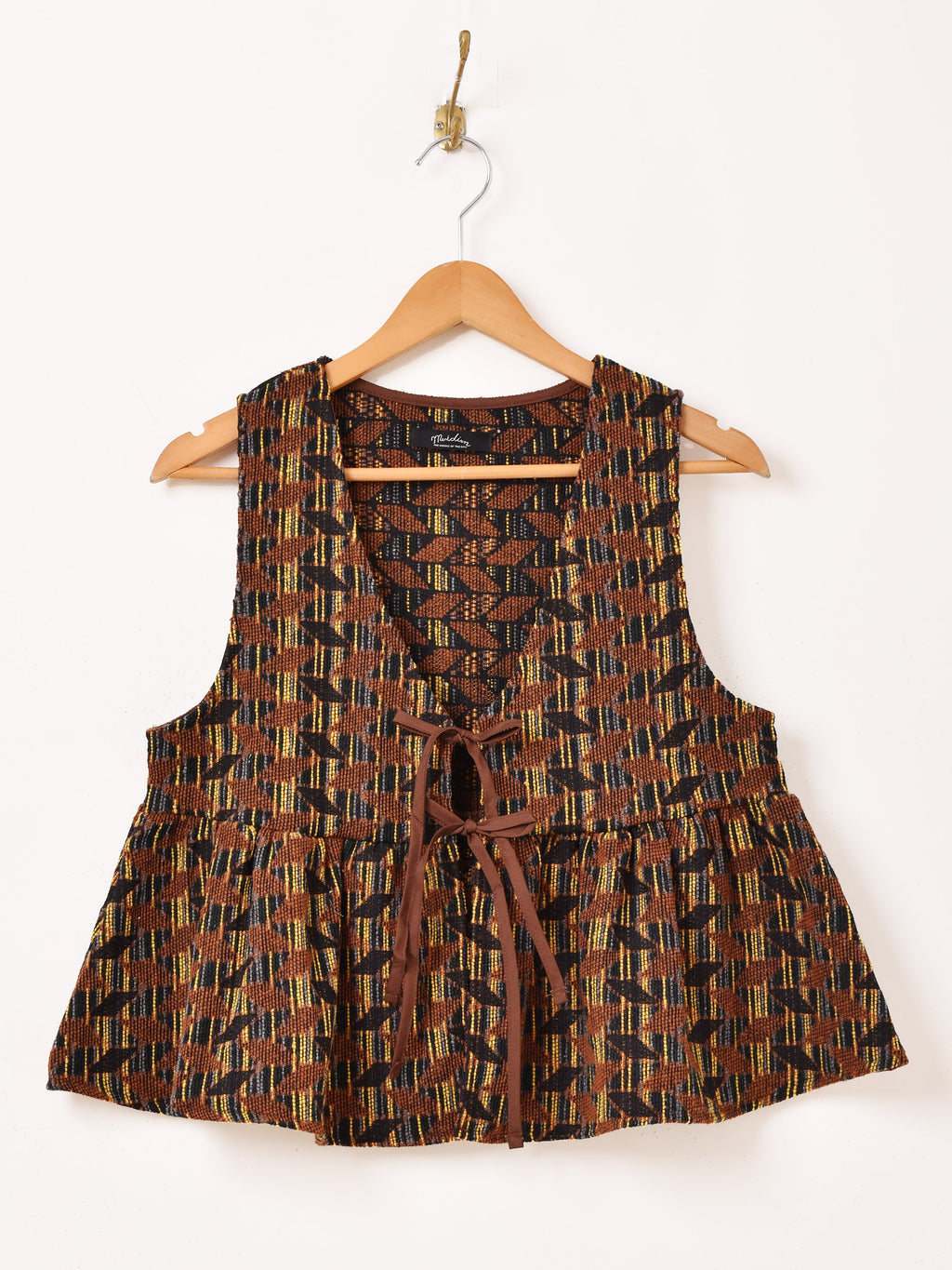 ジオメトリックパターンのタペストリー生地で仕立てたベスト。ふんわりペプラムシルエットで体型カバーしつつ、Y2Kスタイルなどのレイヤードアレンジが楽しめます。