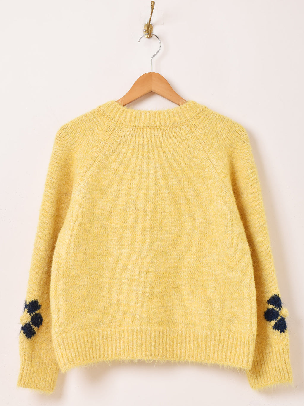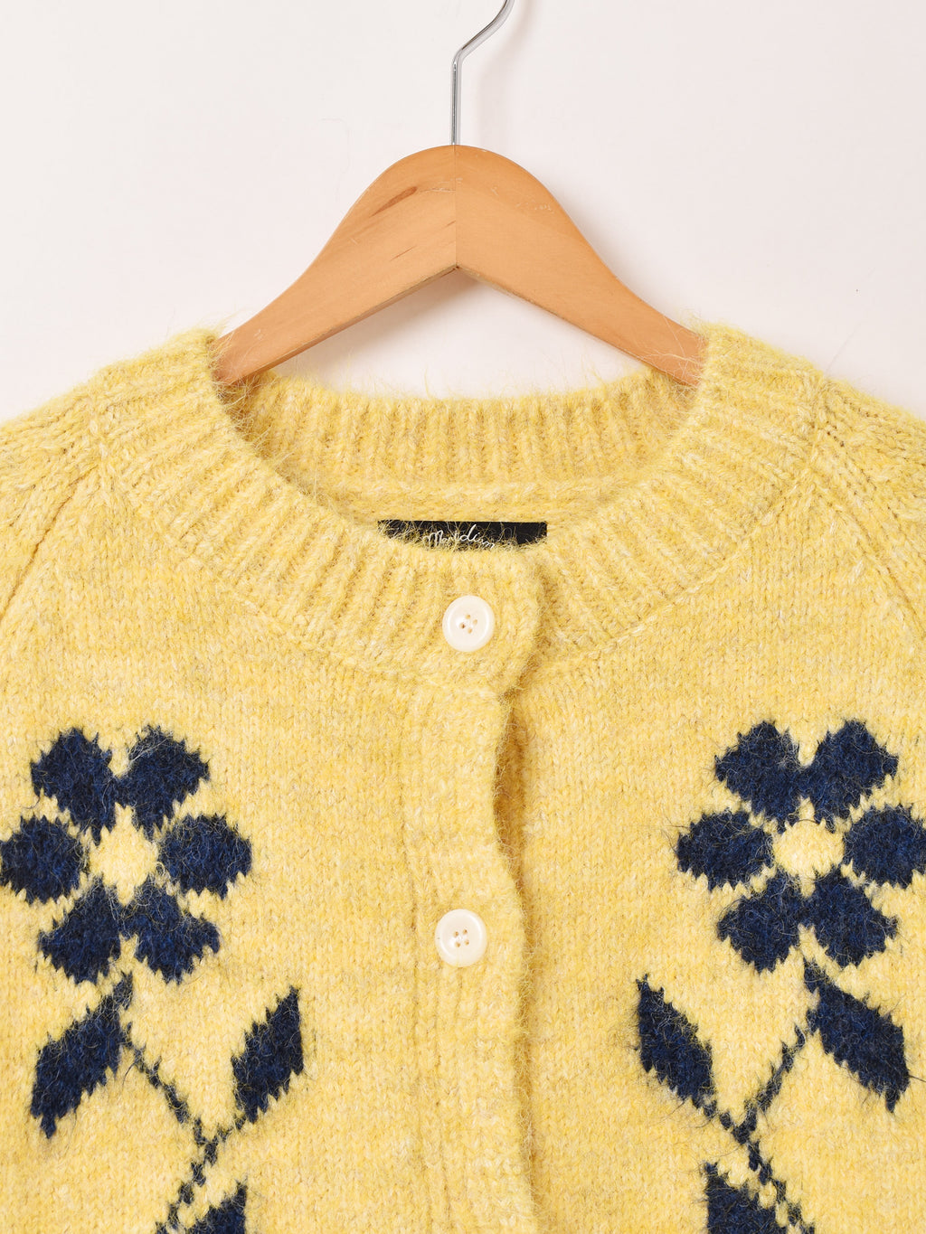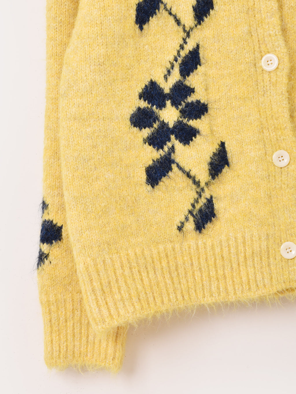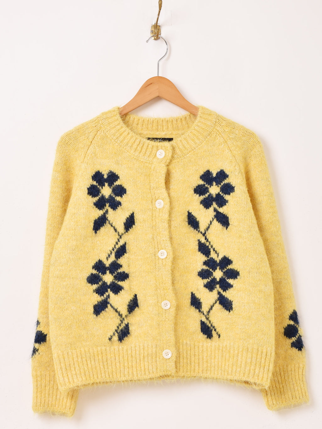 花のモチーフがデザインされたカーディガン。毛足の長く、あたたかなニット生地で仕立てた季節感溢れる一着です。