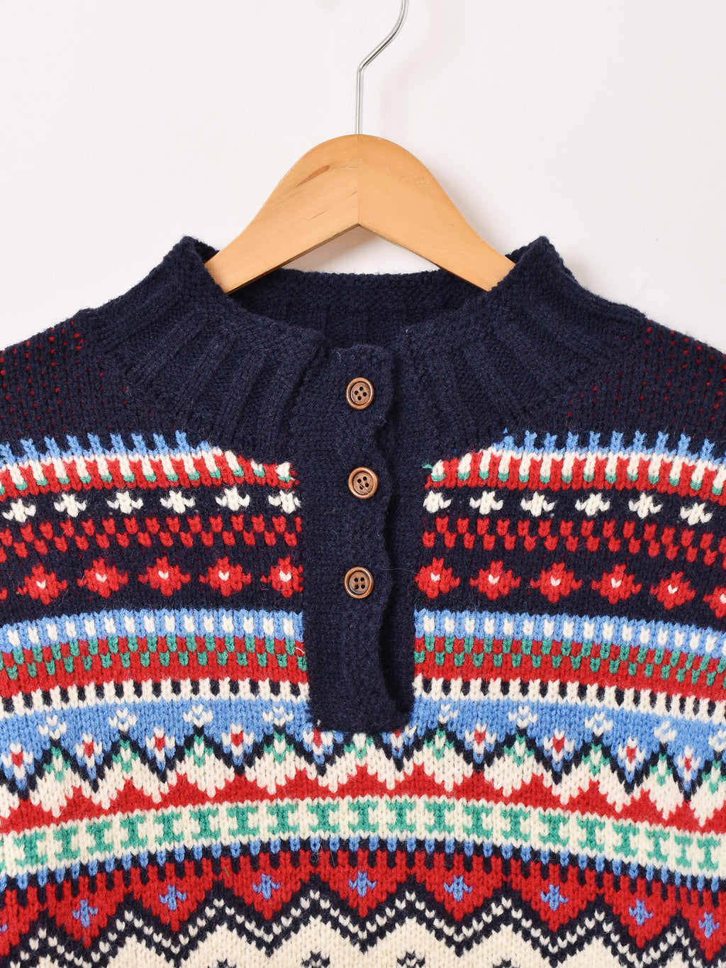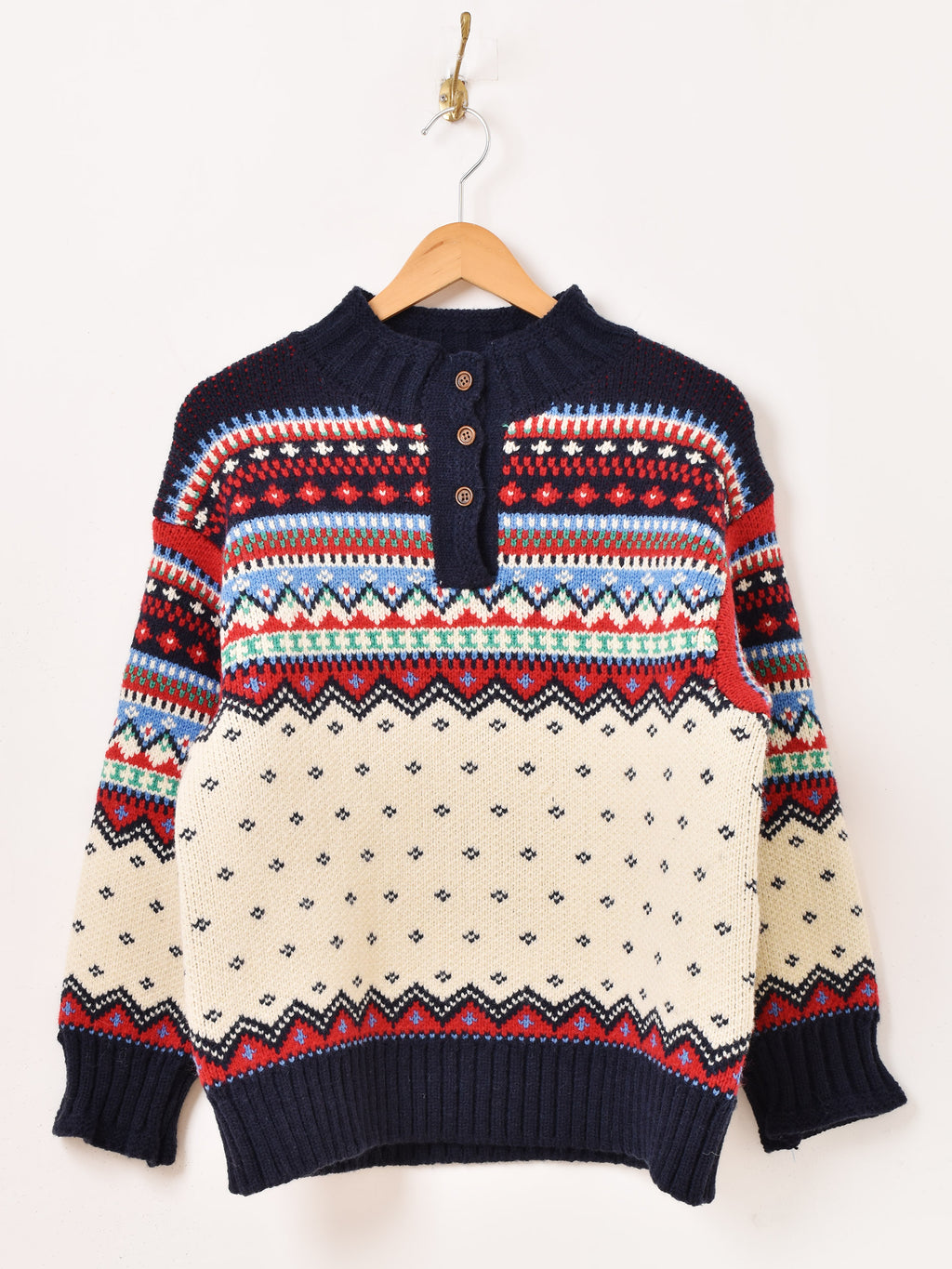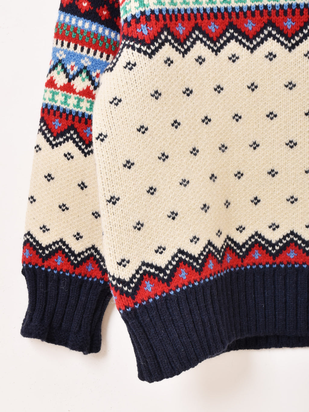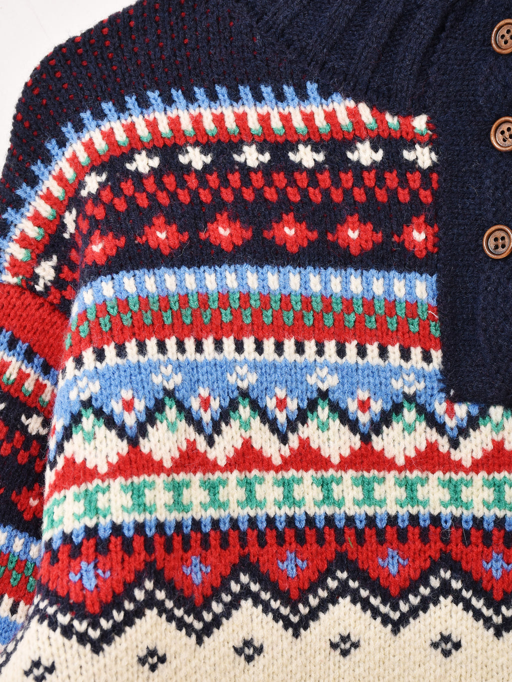 古着のようなフェアアイル風のモチーフが目を惹くハイネックセーター。襟元はボタン仕様で、前を開けてインナー見せもおすすめ。厚みのあるニット生地で、シーズンムードたっぷりの一着です。