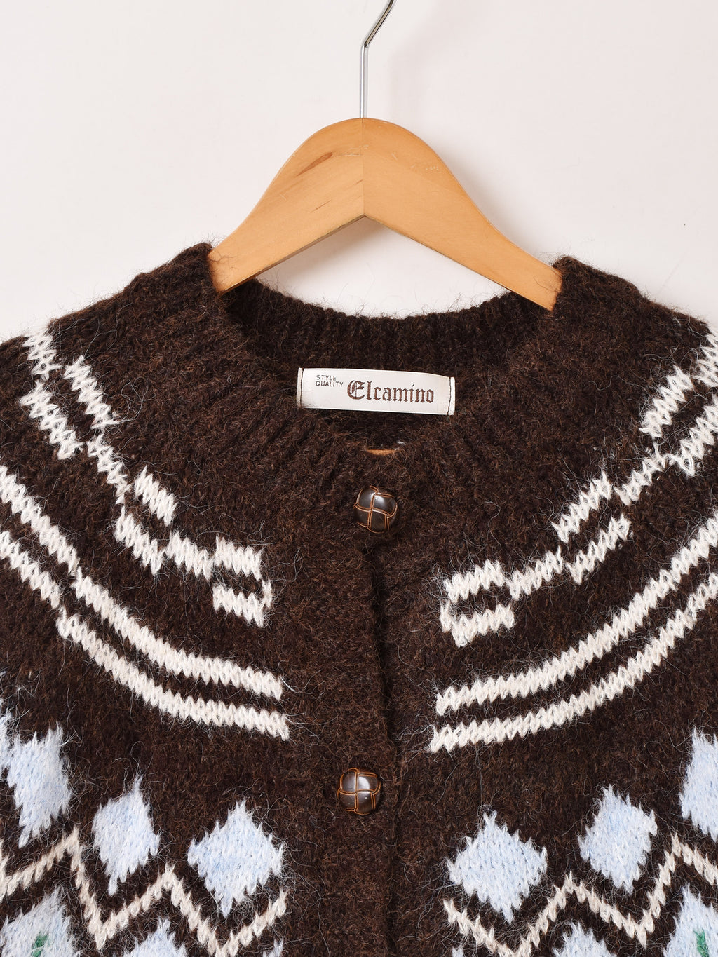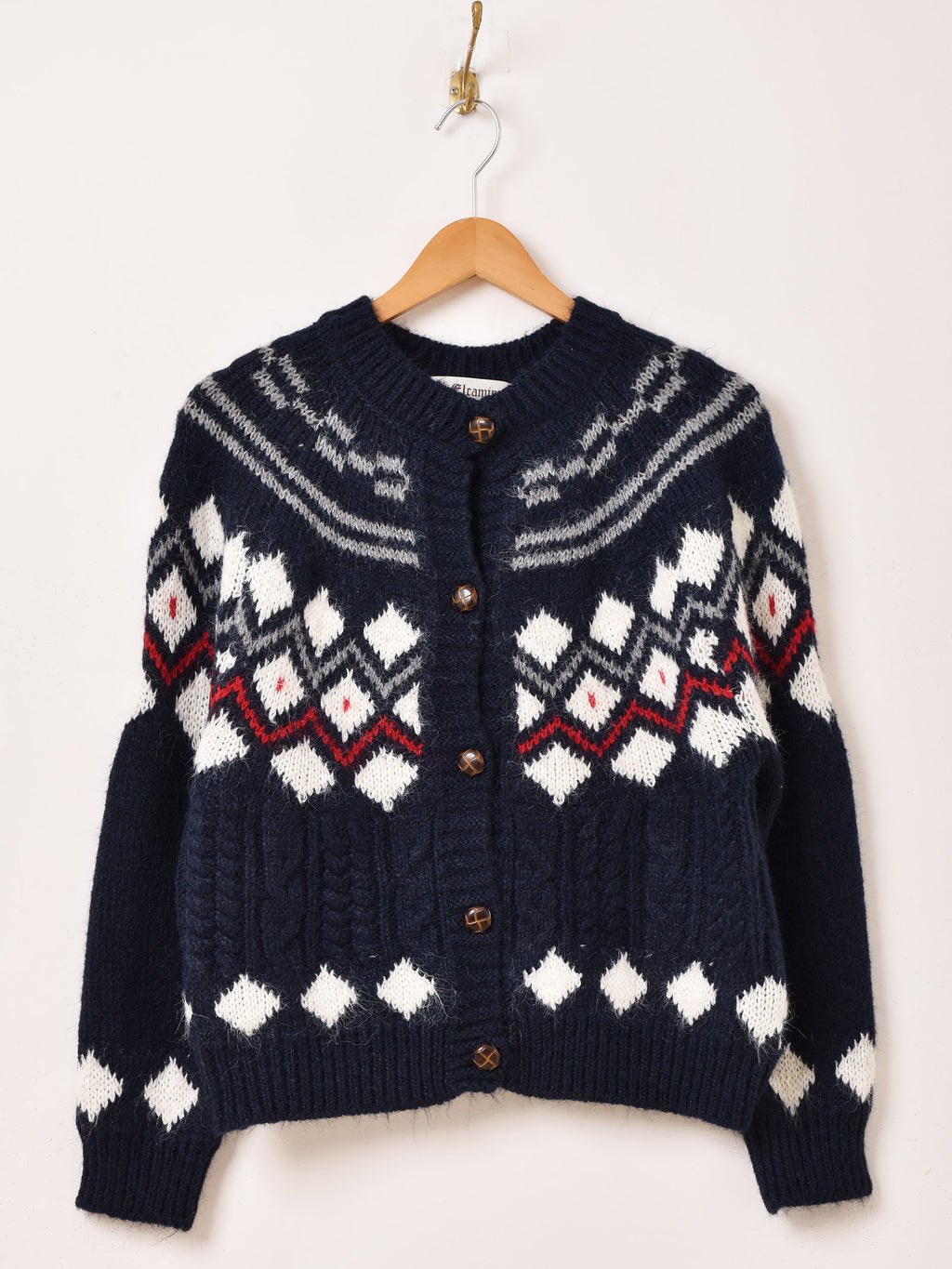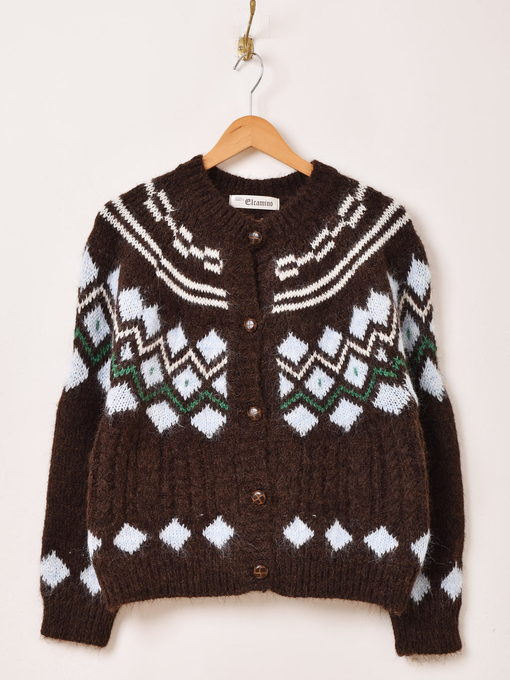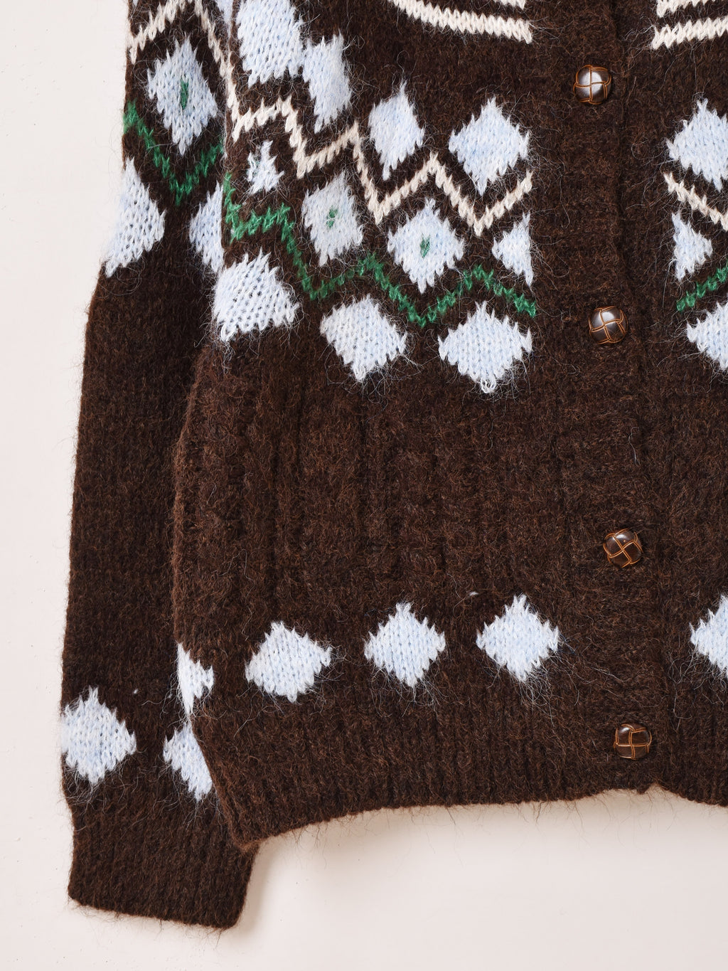 ノルディックのようなデザインが季節感溢れるカーディガン。ウッドボタン風のボタンがよりシーズンムードを演出してくれます。やや毛足の長い、あたたかなニット生地です。
