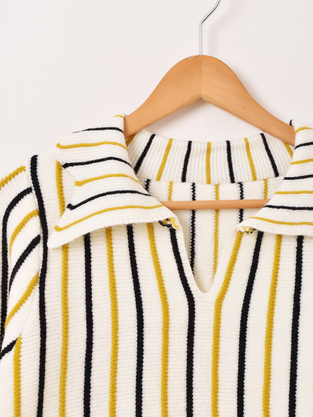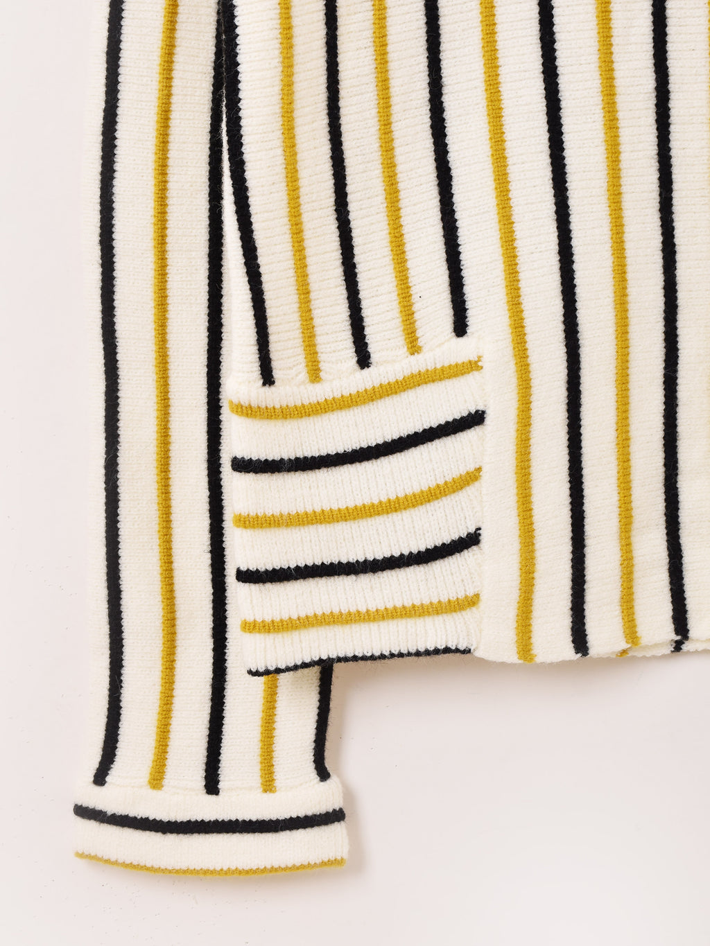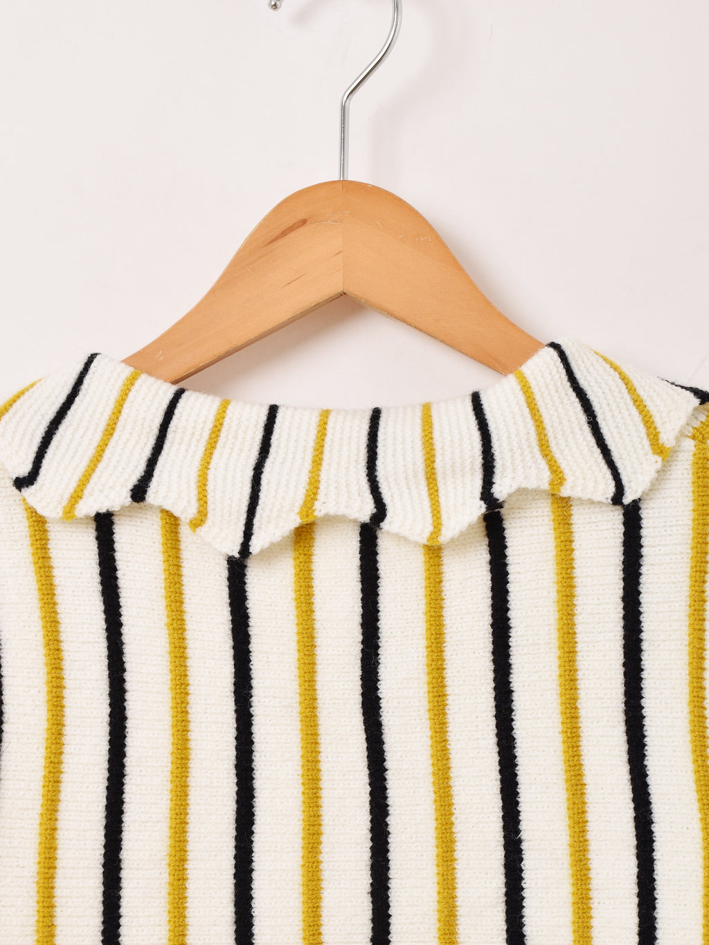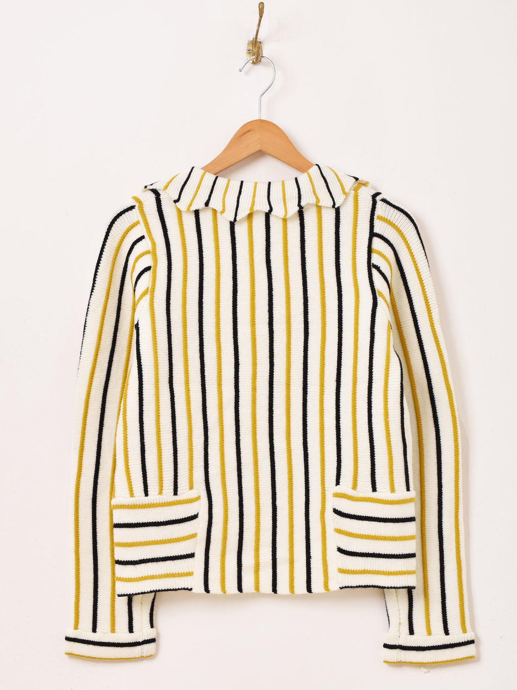 立体編みのストライプが目を惹くセーター。襟の形がギザギザになっており、ちょっと個性的なデザインがポイント。ウエスト部分に程よくリブが効いているので、着膨れせずすっきりと着こなせます。