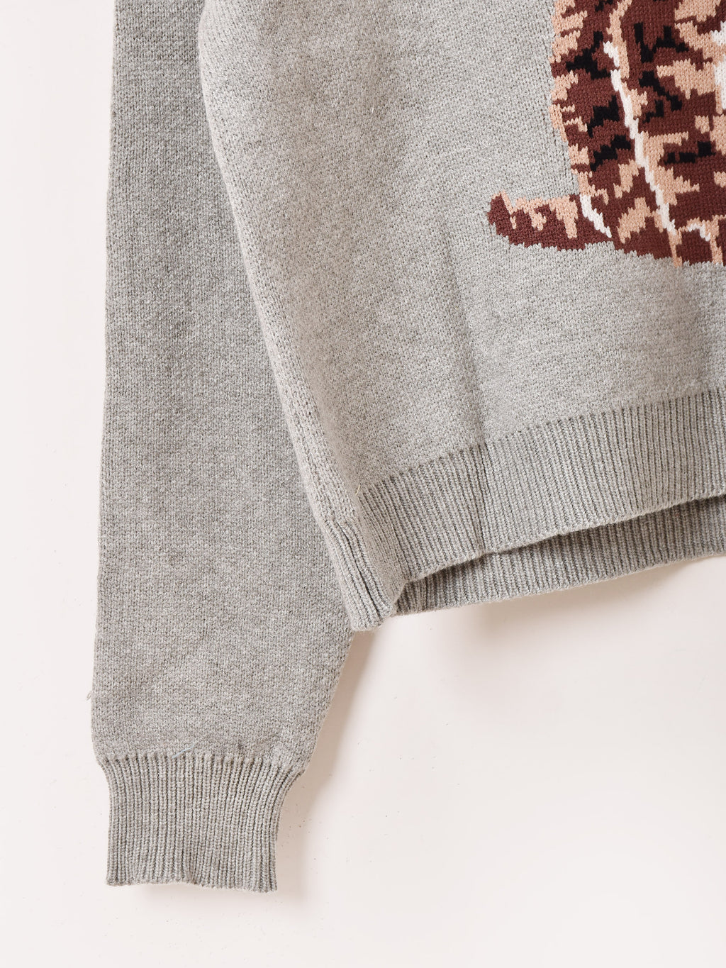 可愛らしい猫ちゃんが編まれたセーター。どこか古着っぽいデザインが◎。程よい厚みのニット生地で、春先まで活躍する一着です。