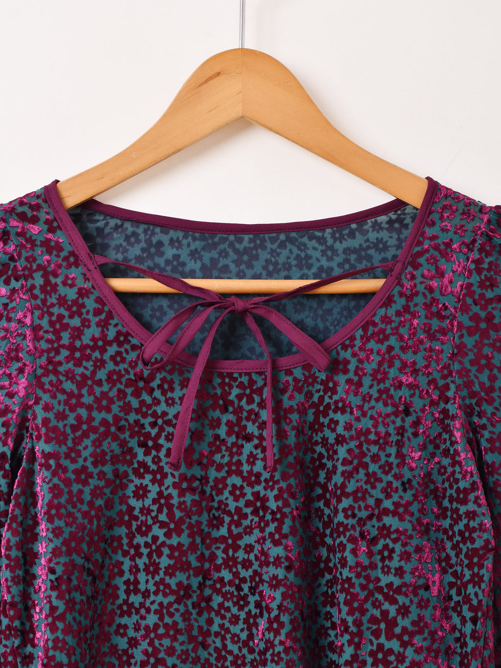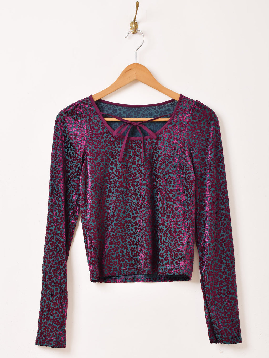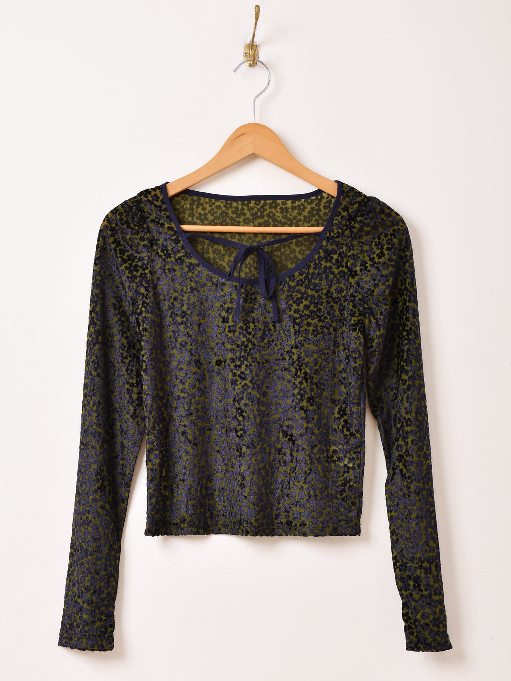 程よい透け感のあるシアー生地に、ベロアのジャガードをあしらった長袖カットソー。リボン結びでデコルテをチラ見せしたデザインもポイント。レイヤードコーデのインナーとして着回せます。