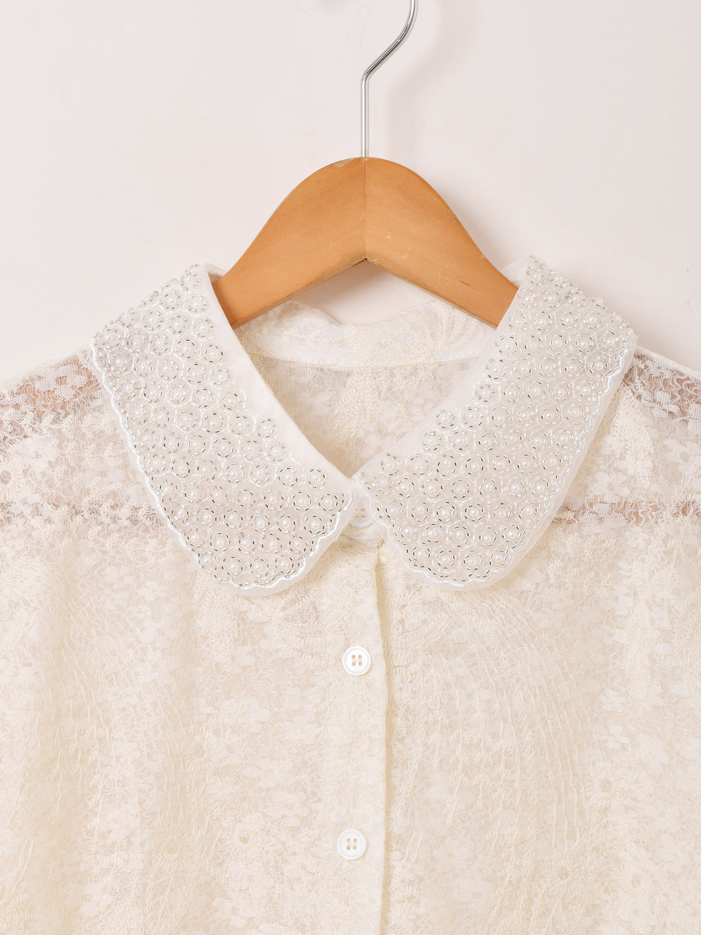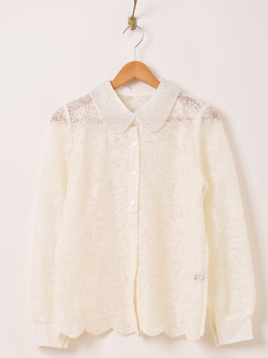透け感が可愛いシアー生地に、細かな刺繍を施したブラウス。襟にはビーズをあしらいより華やかに。コーディネートの主役にぴったりの一着です。
