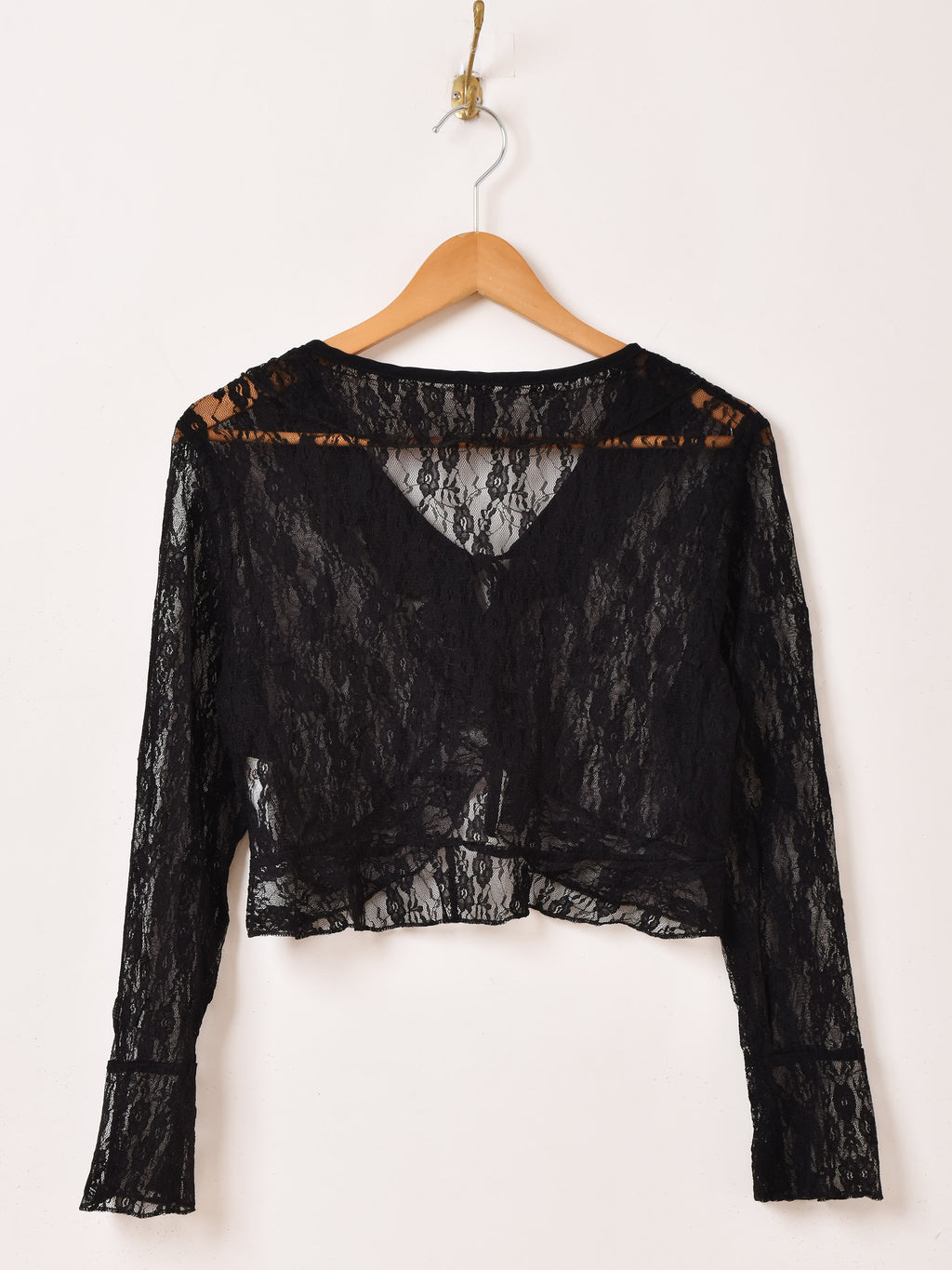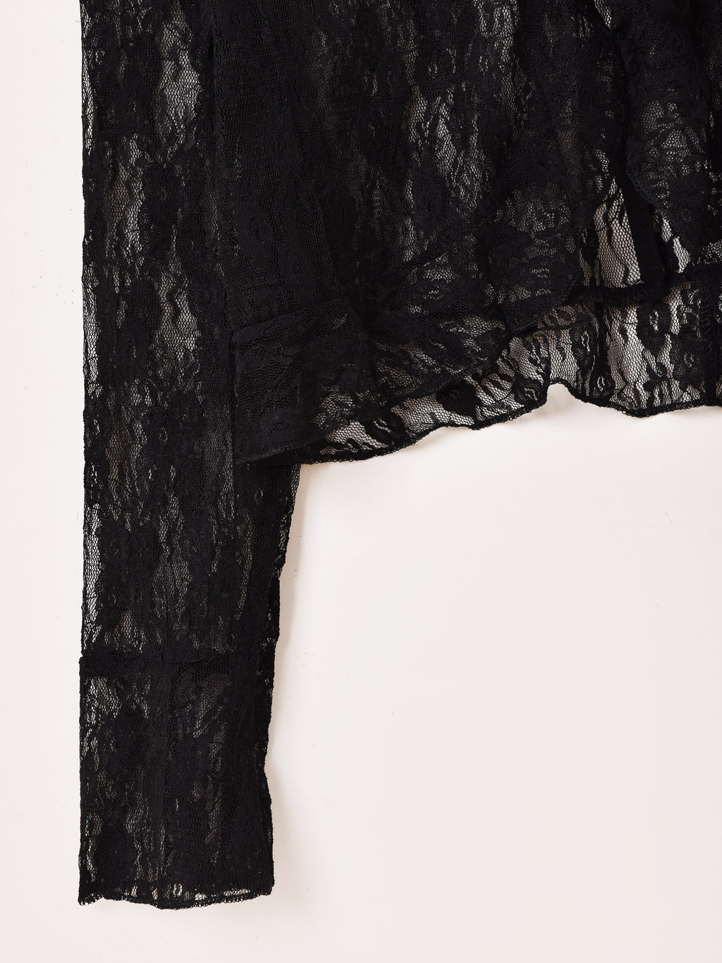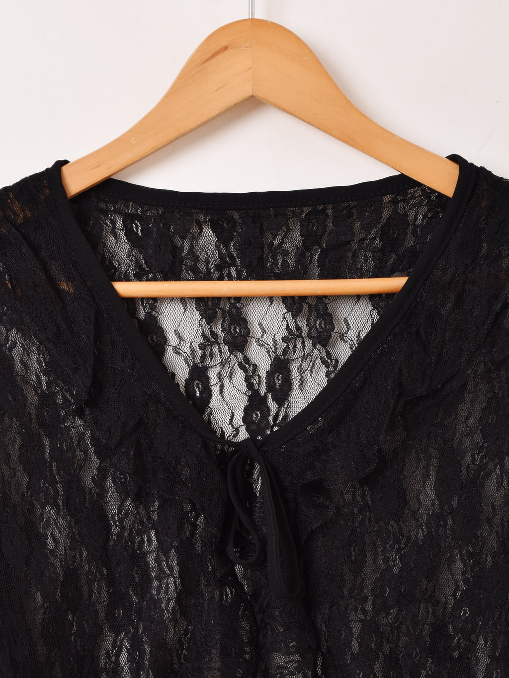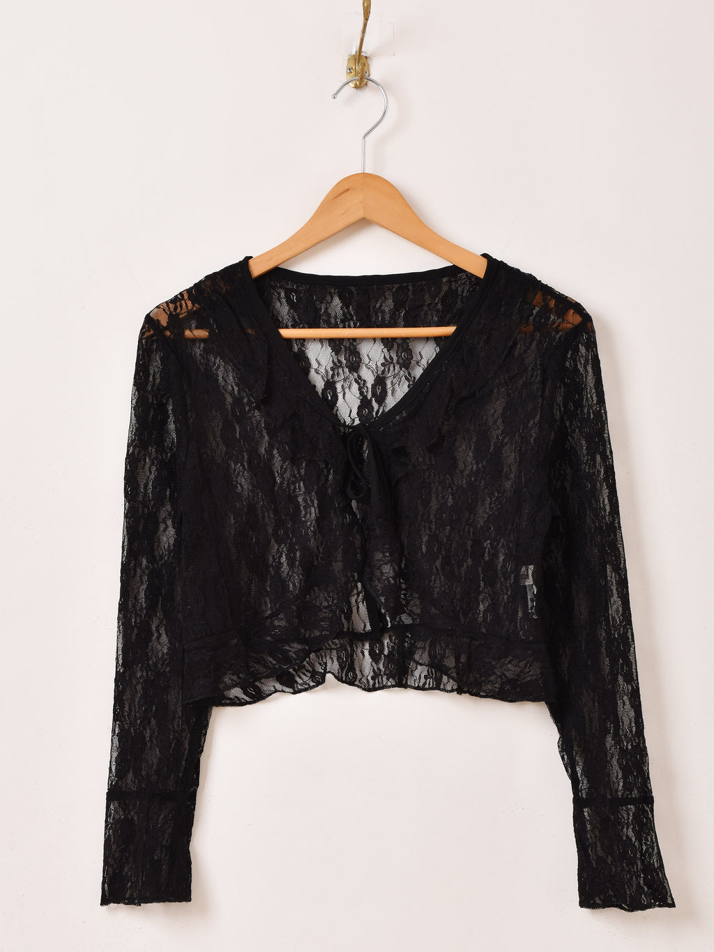 フリルをあしらい、レースのラグジュアリーな雰囲気が可愛いブラウス。フロントはリボン結びで留めるタイプです。スタイル良く見せられるクロップド丈も嬉しい一着です。