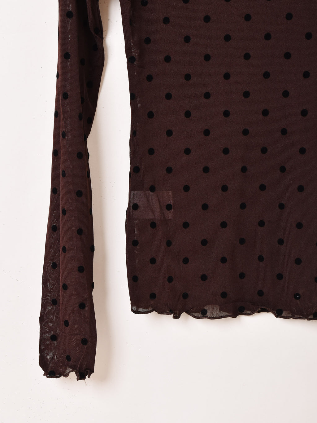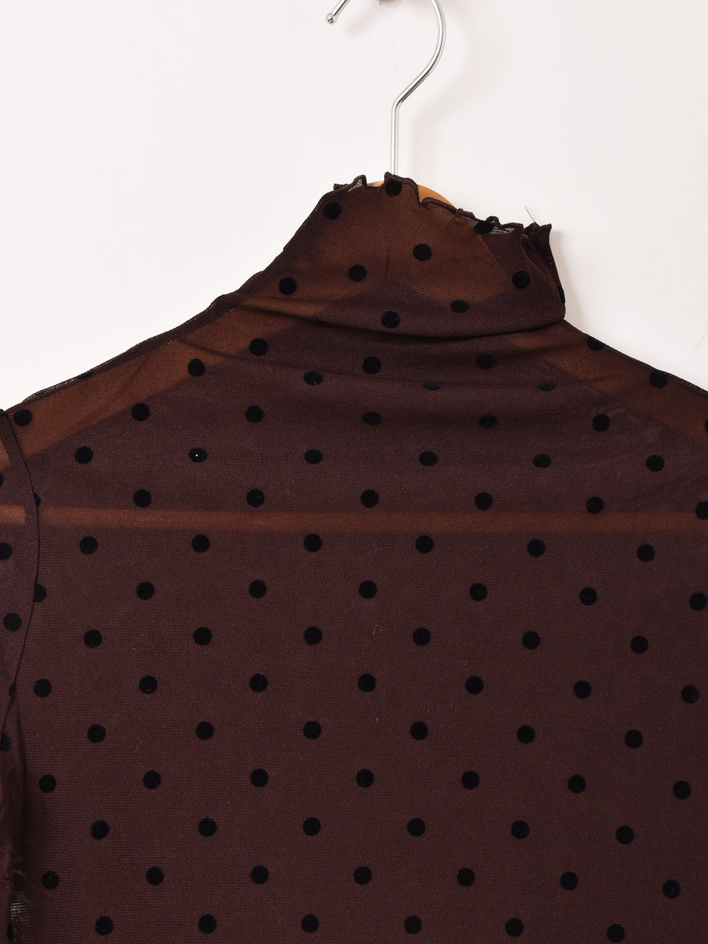 透け感のあるシアーに水玉模様をあしらった長袖カットソー。ハイネックで首元もほんのり肌見せでおしゃれに。インナートップスとしてシーズンを問わず着回せる一着です。