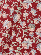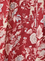 ワインレッドの3種類の花柄生地で仕立てられたガニーサックスのロングドレス。