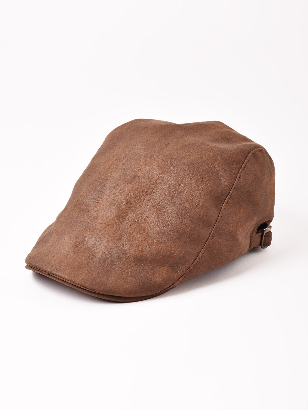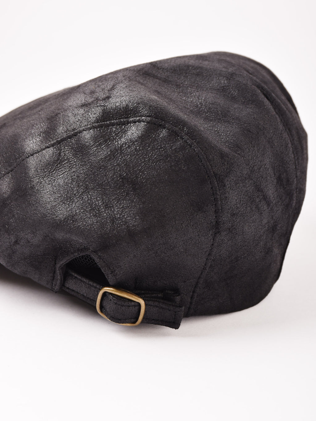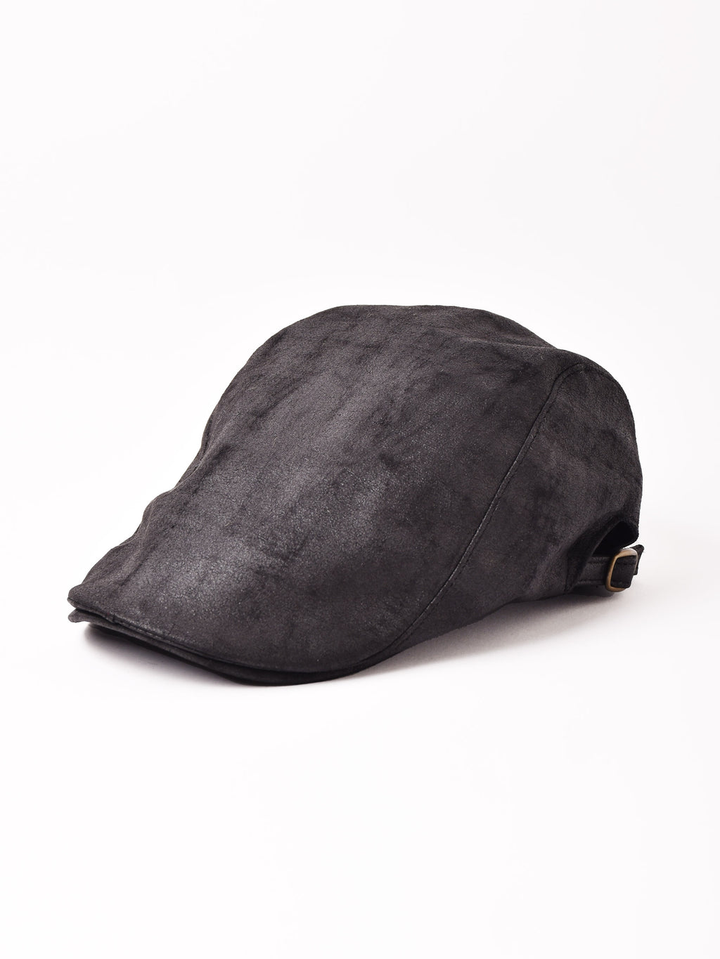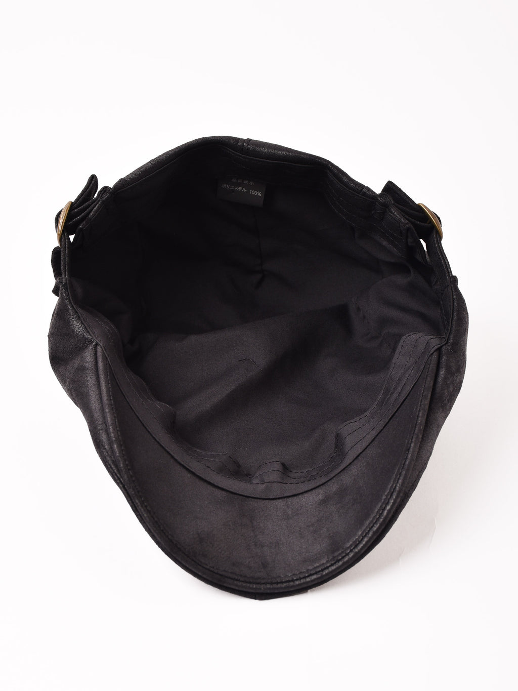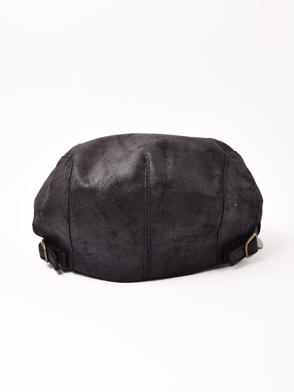 クールなフェイクレザー生地のハンチング帽。ウォッシング加工を施したような、雰囲気ある色落ち具合が魅力的な一点です。