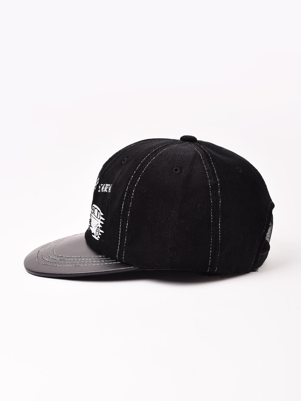 秋冬らしいコーデュロイにロゴ刺繍をあしらったキャップ。ブリムはフェイクレザーになった、切り替えデザインです。