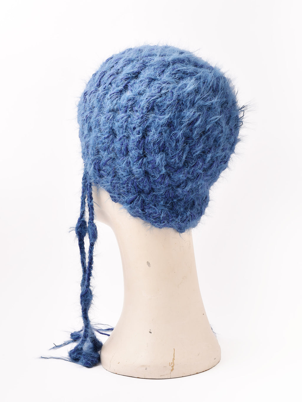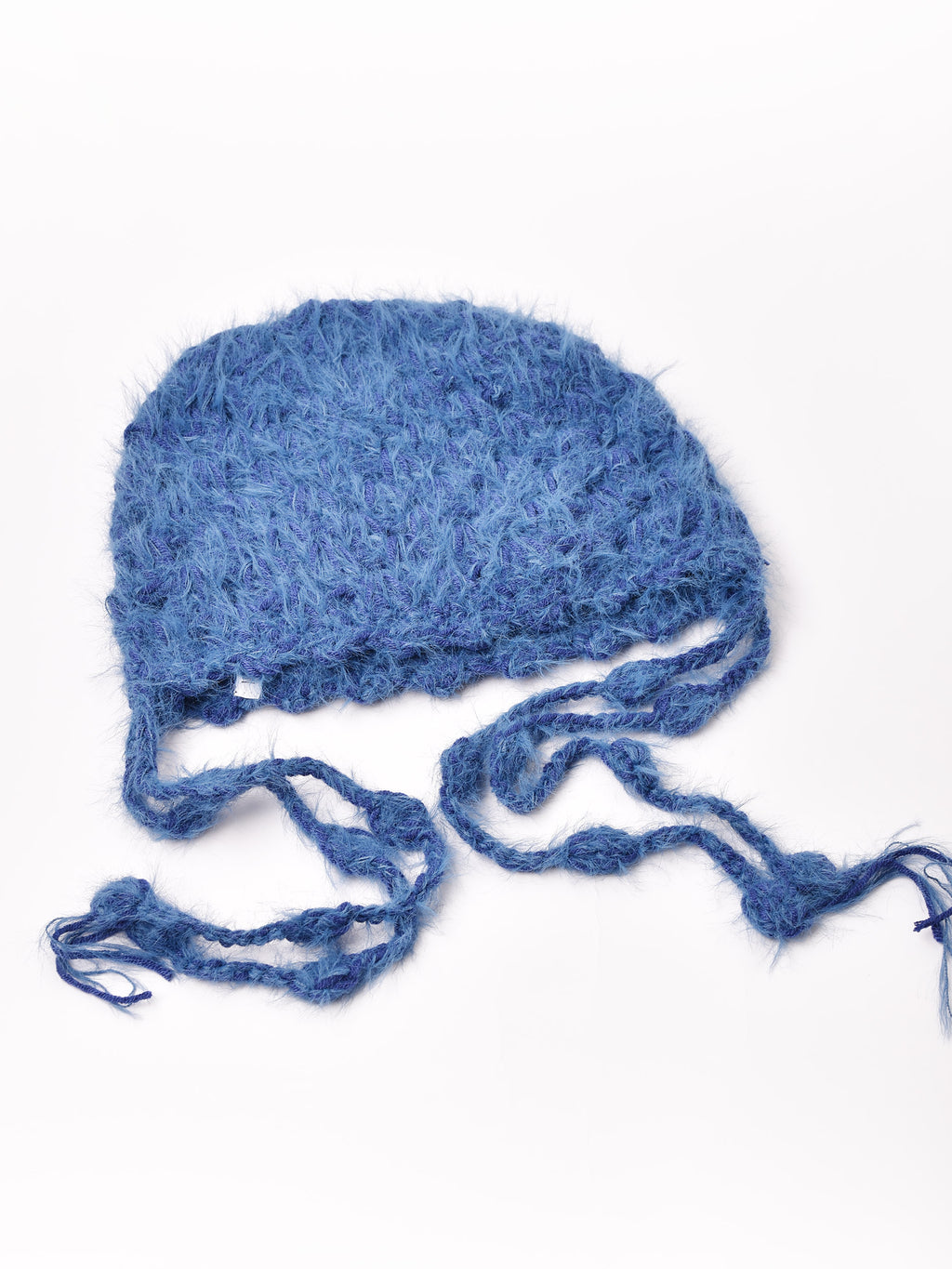 シャギーのふんわりした生地感がシーズンムードたっぷりのニットキャップ。サイドの紐がおしゃれでアクセントに。