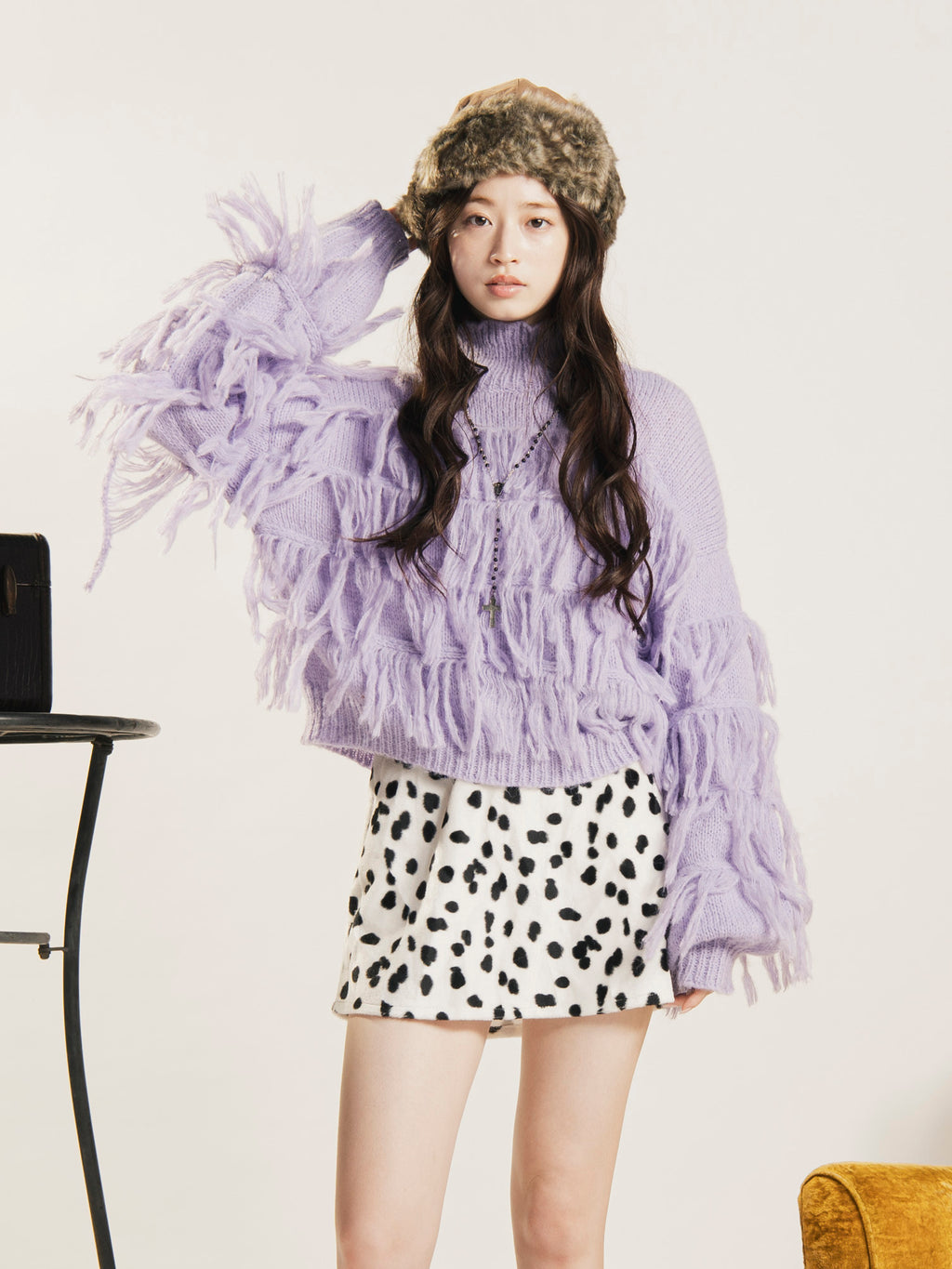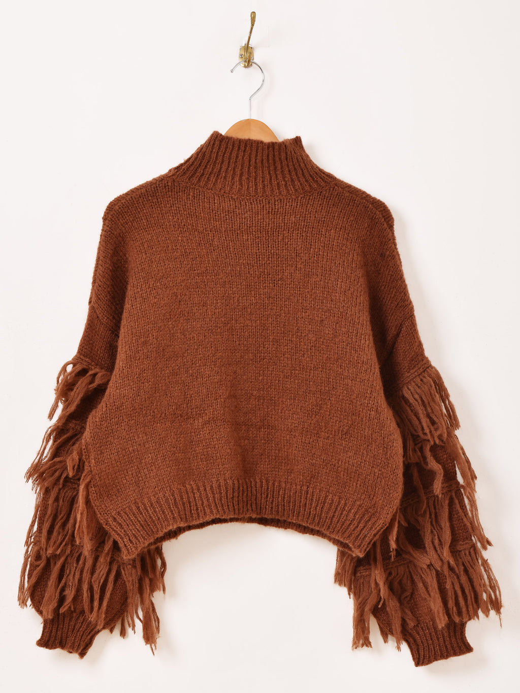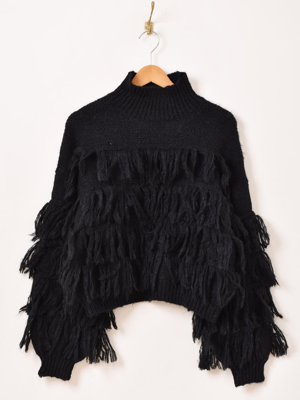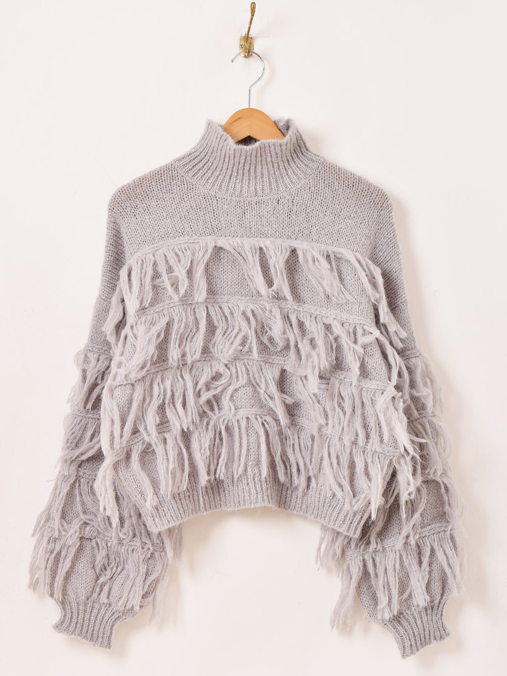 たっぷりのフリンジがおしゃれなハイネックセーター。1枚着るだけでも華やかに。オーバーシルエットながらもクロップド丈なので、すっきりとこなれた雰囲気に着こなせます。