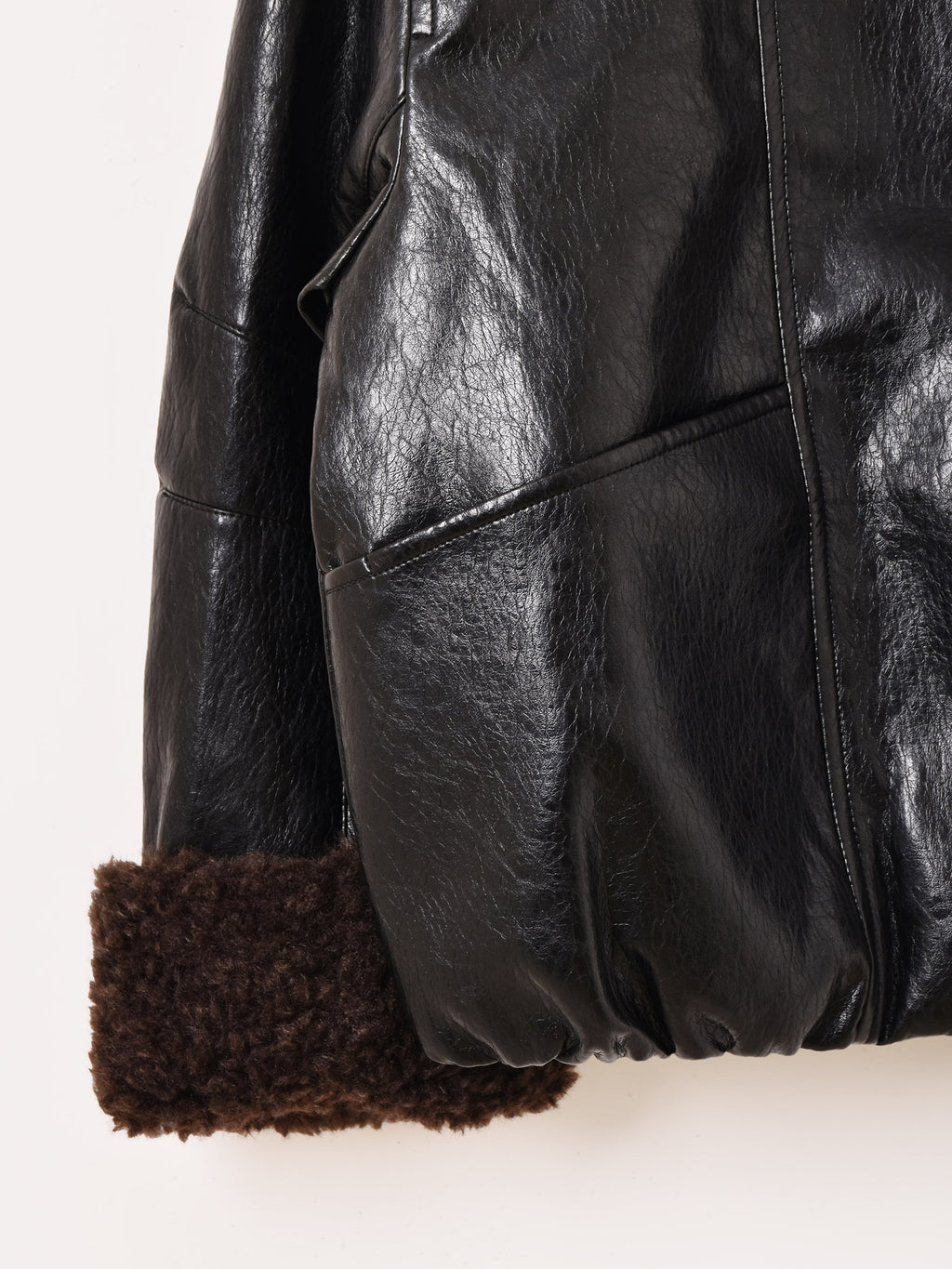 艶のあるフェイクレザーがモードな雰囲気のジャケット。襟と袖口のボアに、身頃には薄手の中綿入りで秋冬らしい一着。裾にはリブが効いています。ショート丈なのでいろいろなボトムスとも相性良く、バランス良く着こなせます。