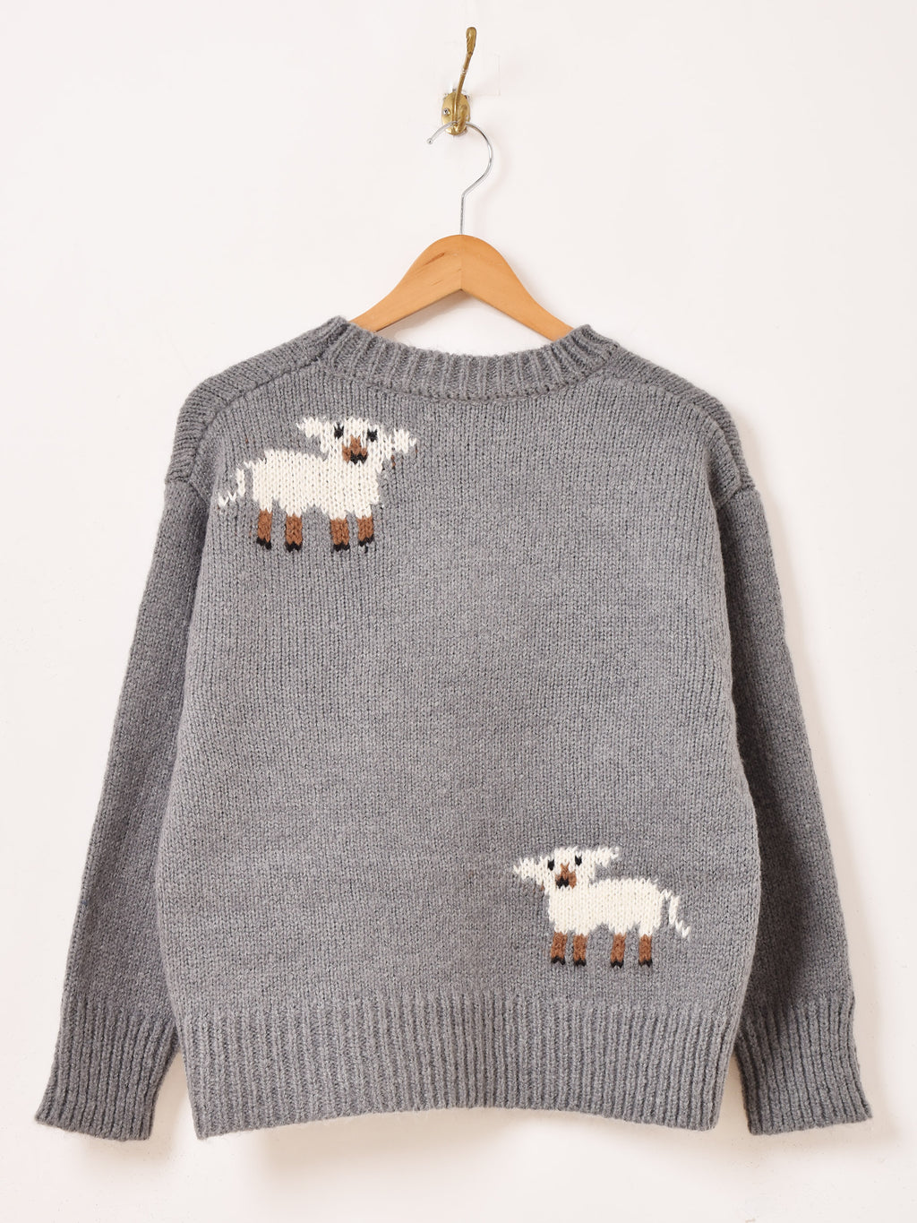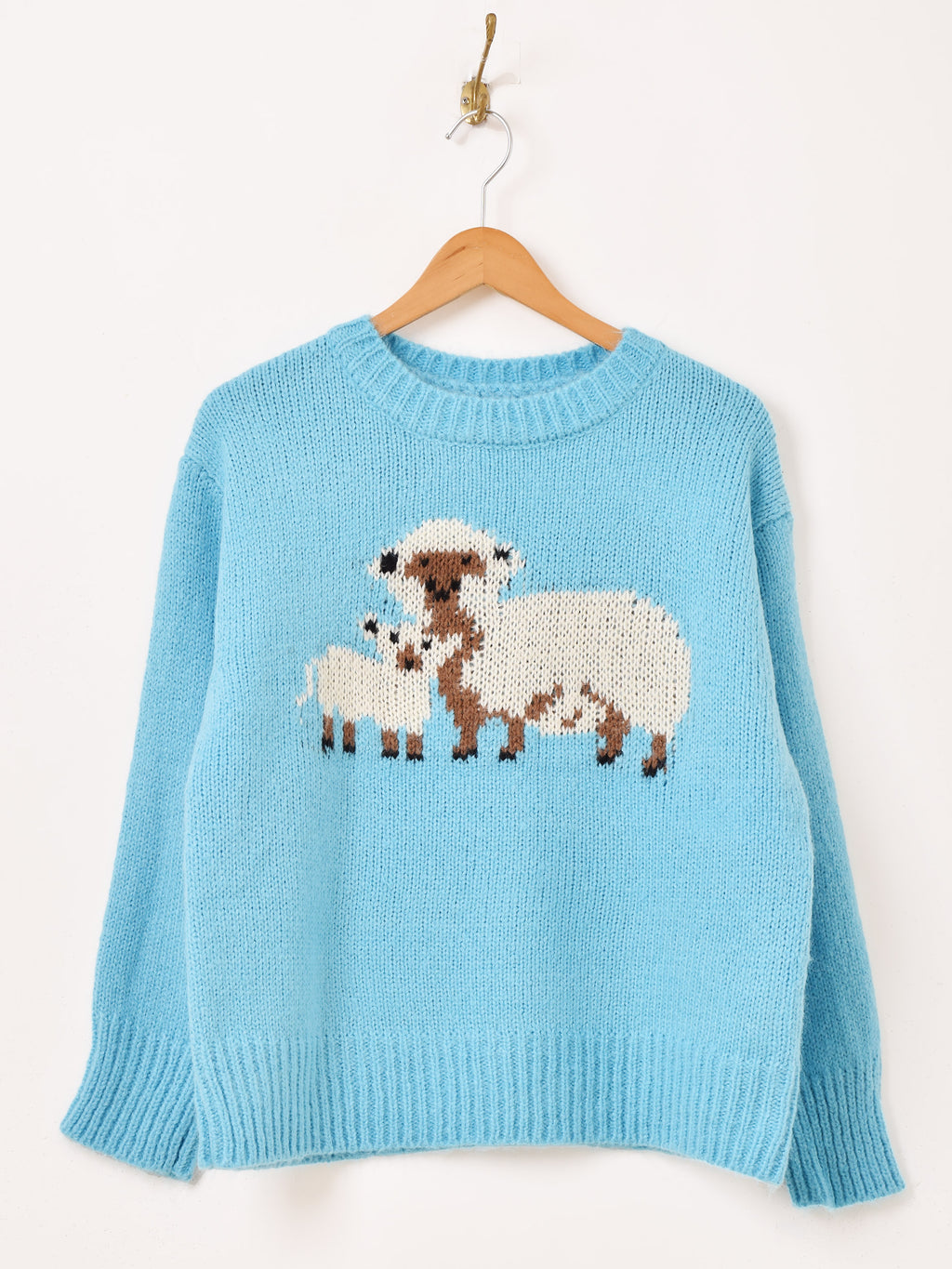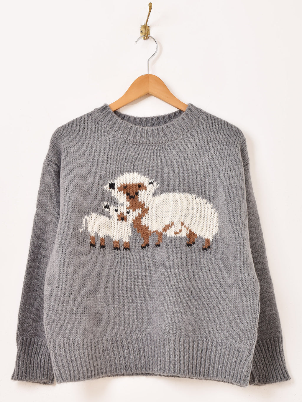 シュールな雰囲気の羊の親子がデザインされたセーター。1枚着るだけでもキュートでアクセントに。厚みのあるニット生地で仕立てた、季節感のある一着です。